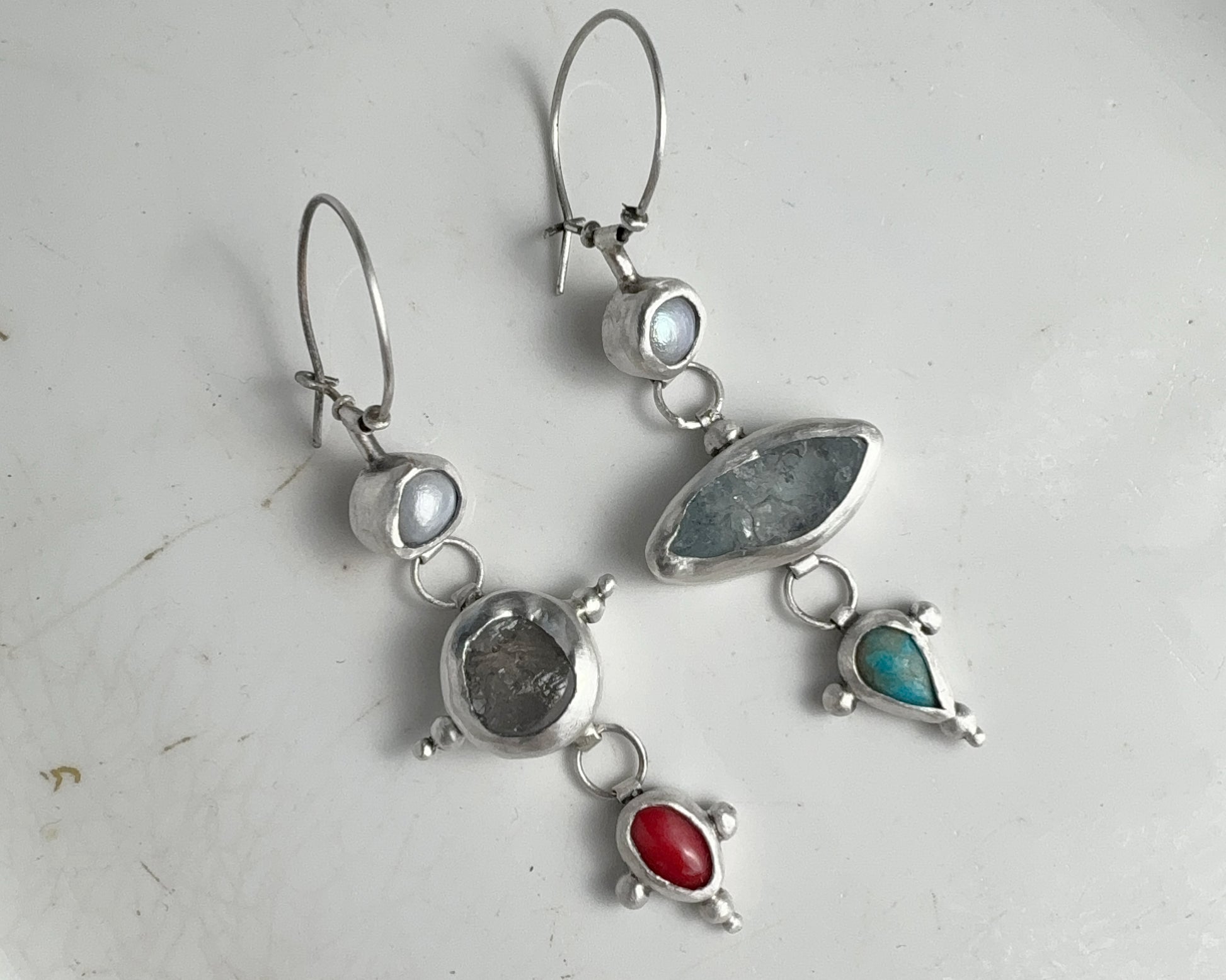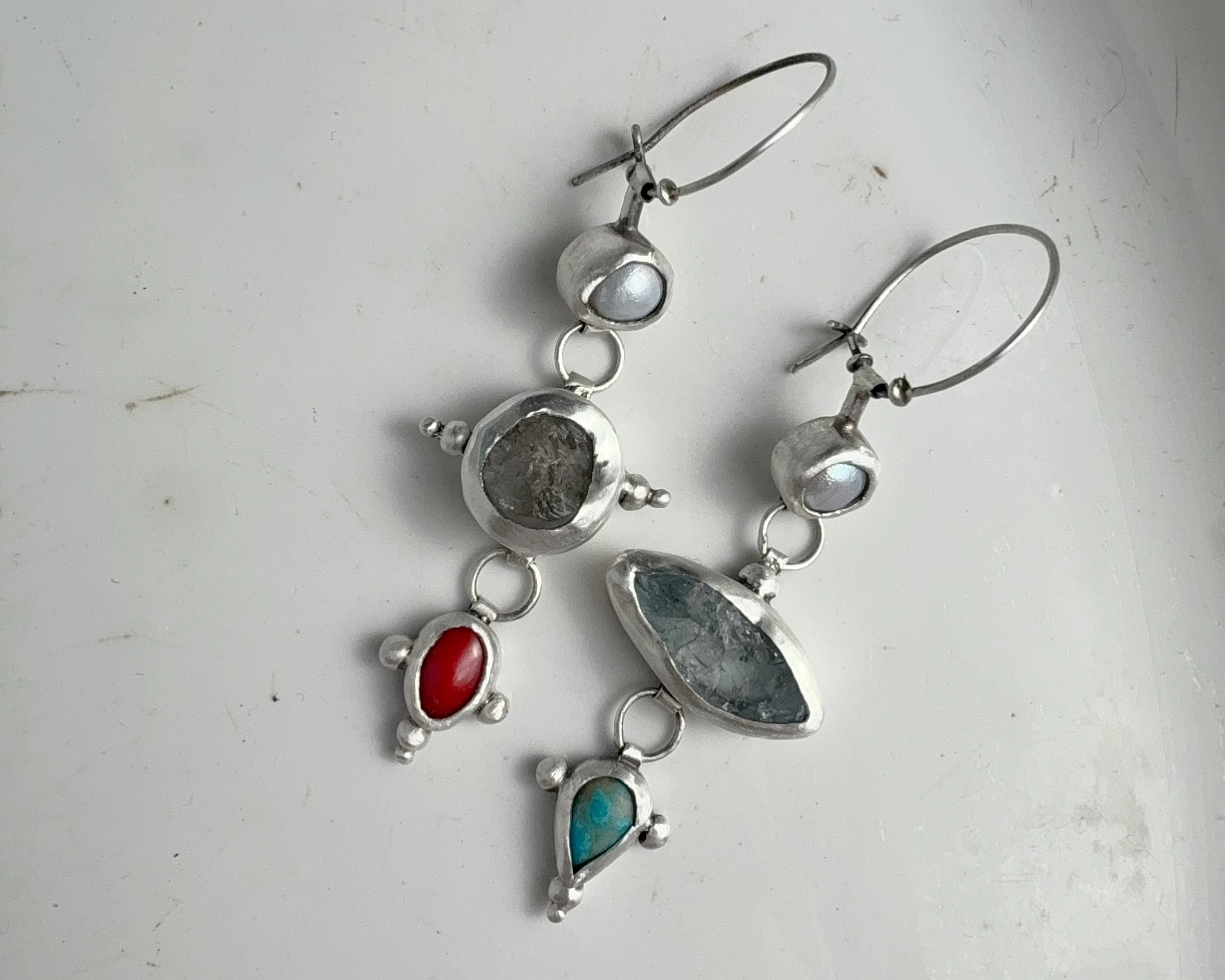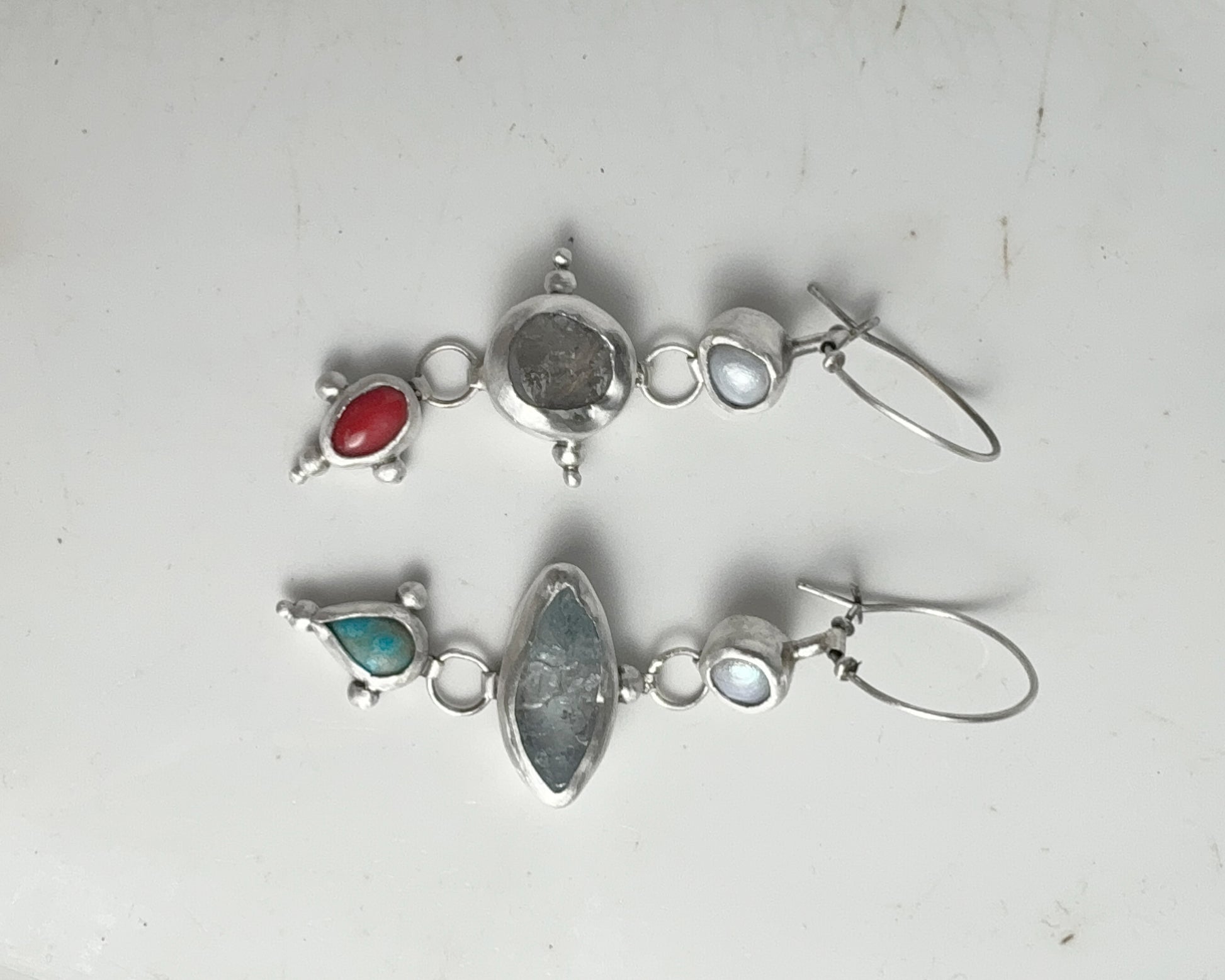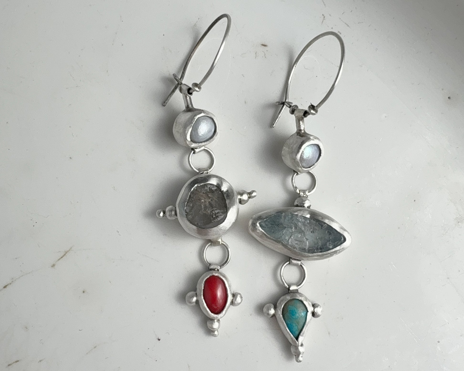 One earring features a combination of pearl, aquamarine, and turquoise—resembling the fluid tones of a river. The second combines pearl, white topaz, and coral—evoking the warmth of a flame.
