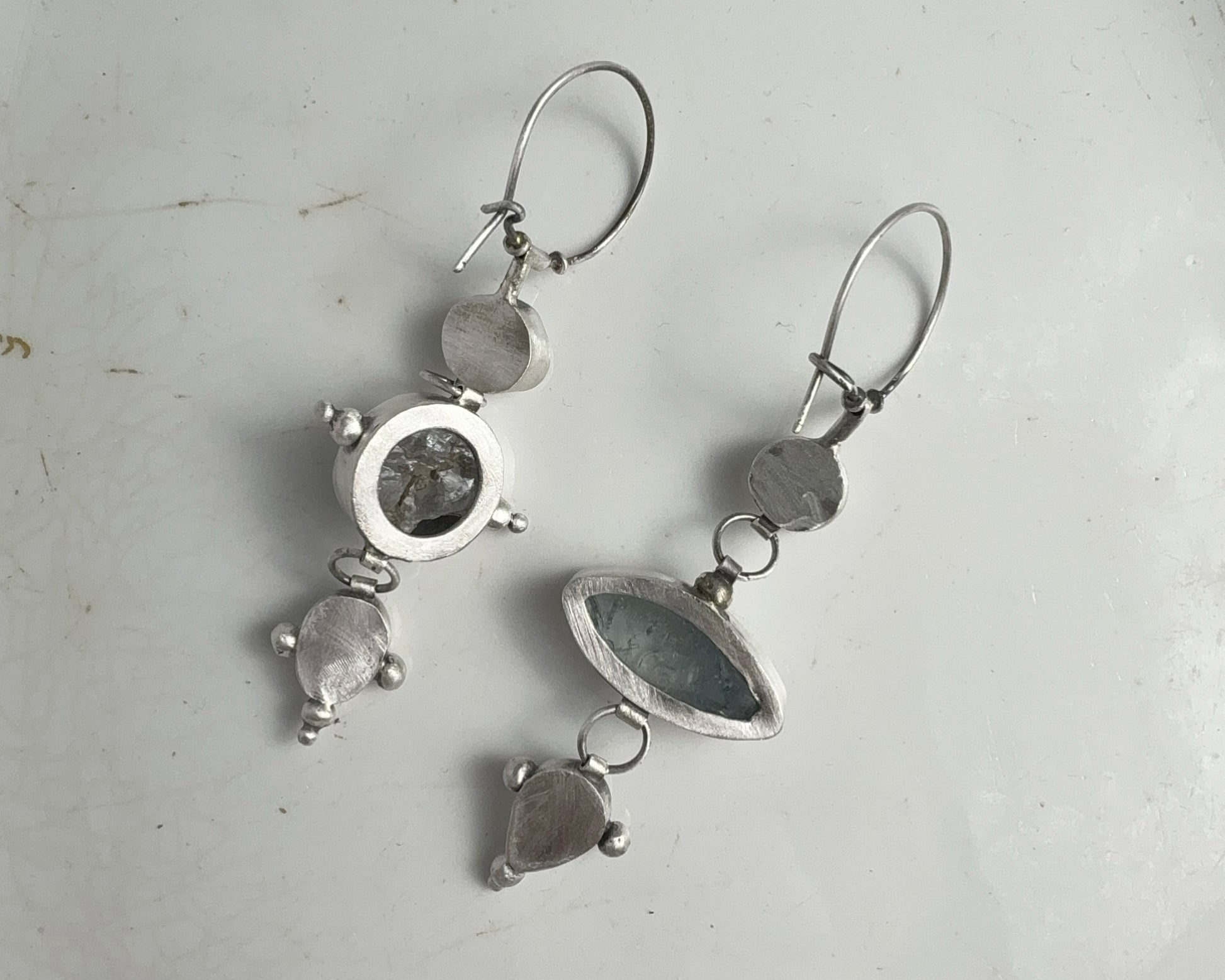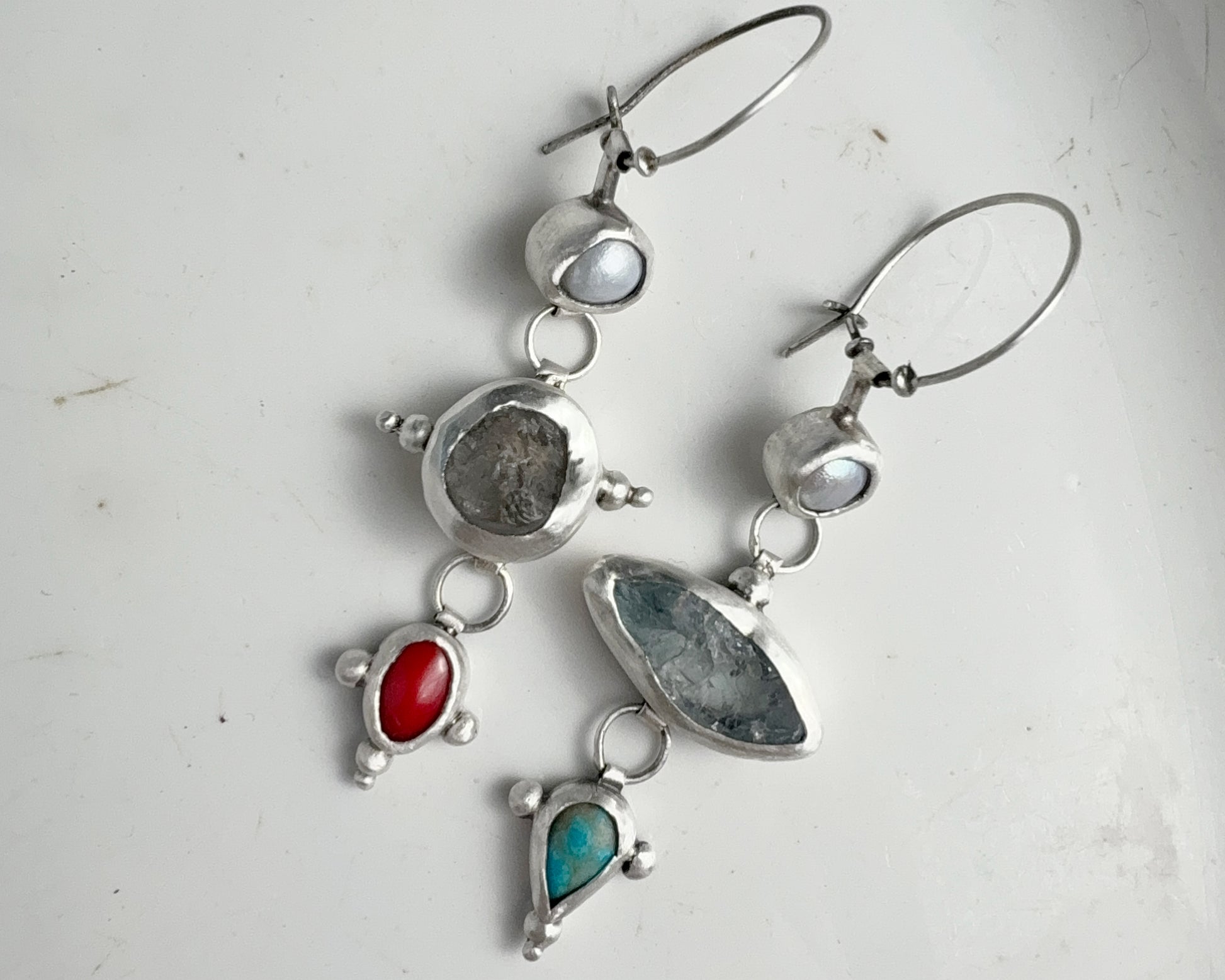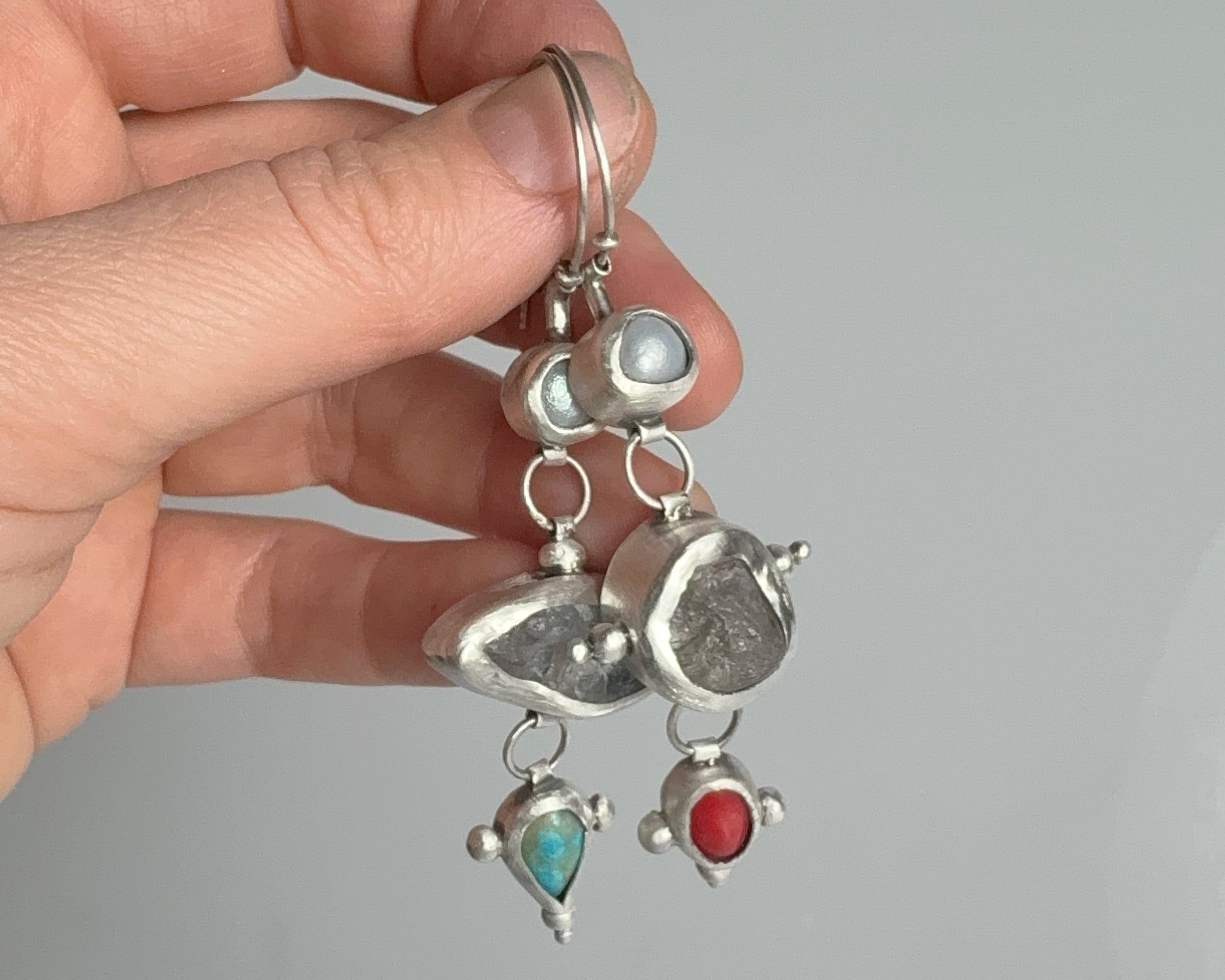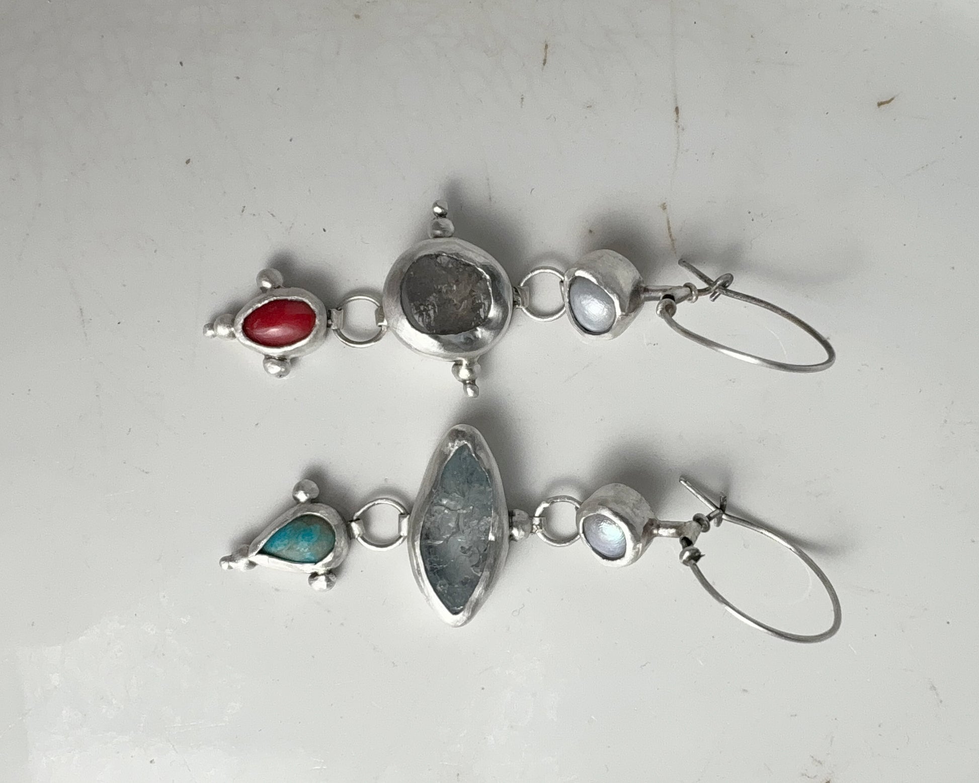 One earring features a combination of pearl, aquamarine, and turquoise—resembling the fluid tones of a river. The second combines pearl, white topaz, and coral—evoking the warmth of a flame.