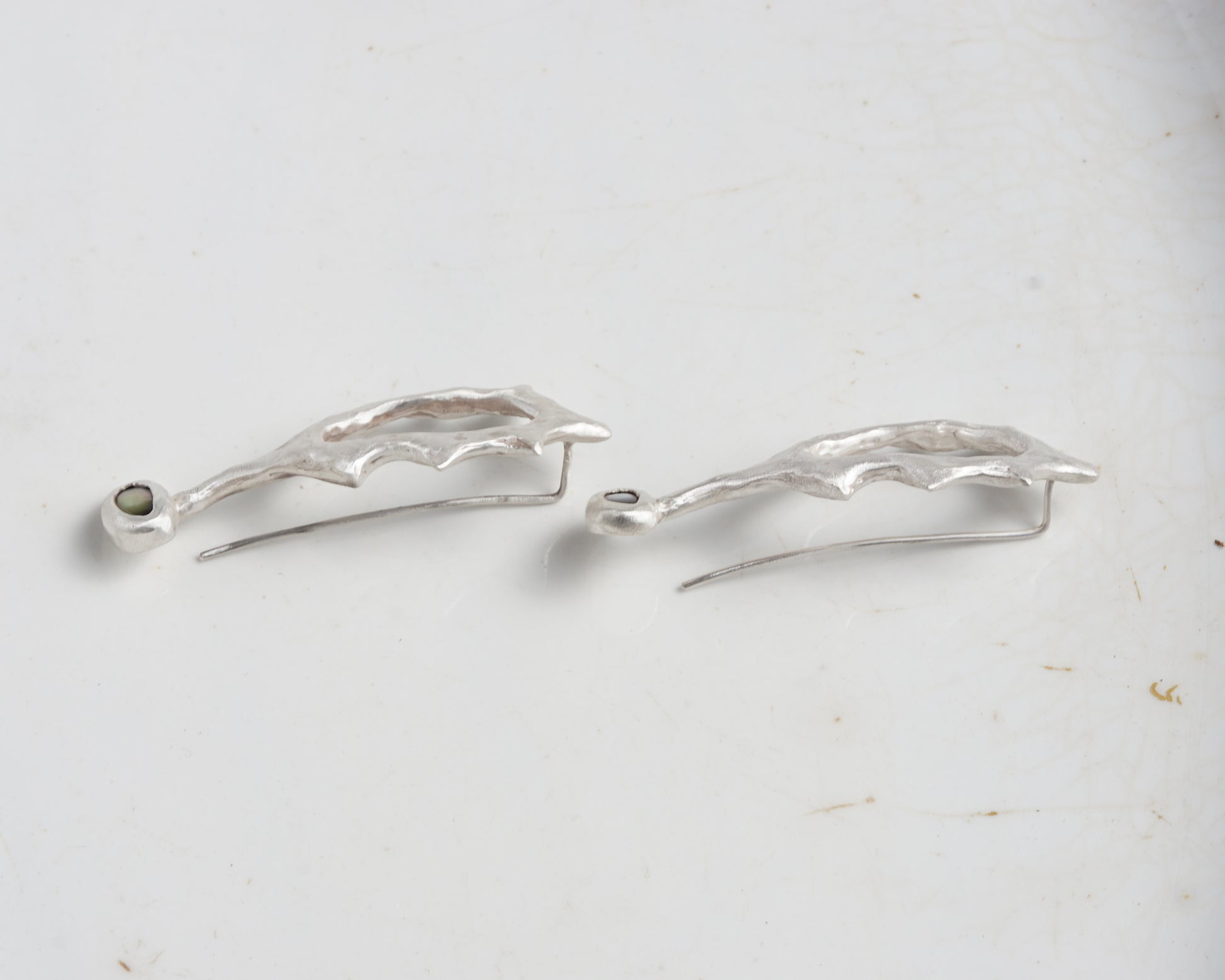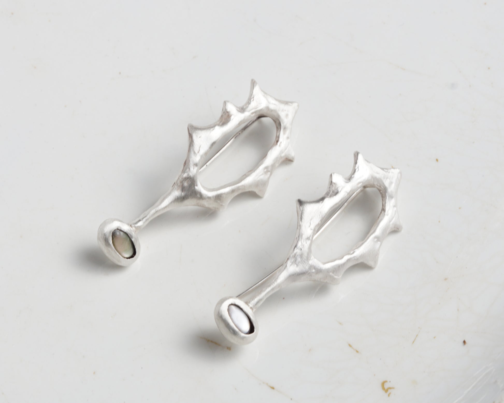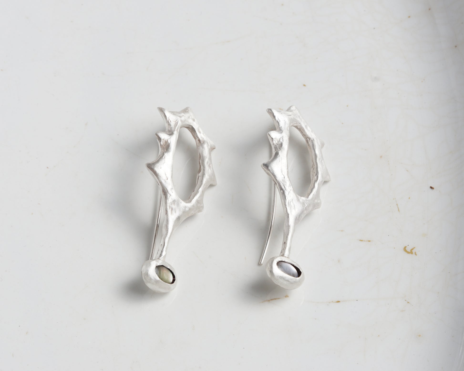 Earrings of an unusual sculptural form made from pure silver with a matte finish. Each piece is set with a Black Abalone shell cabochon, chosen for its natural depth of color. The earrings feature an extended hook design that helps them stay securely in the ear.