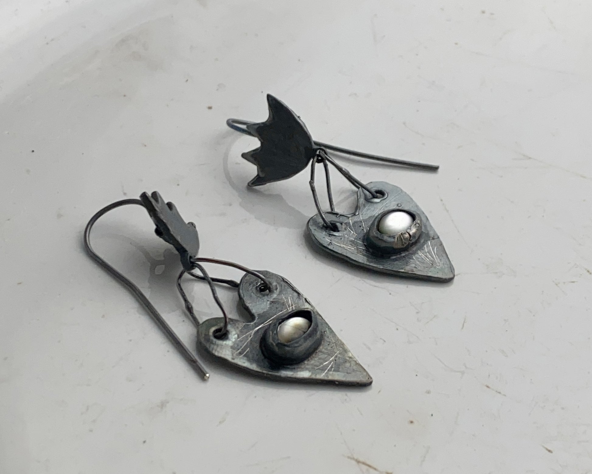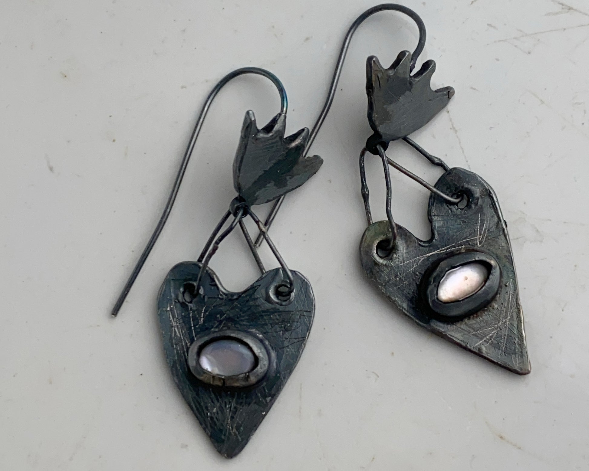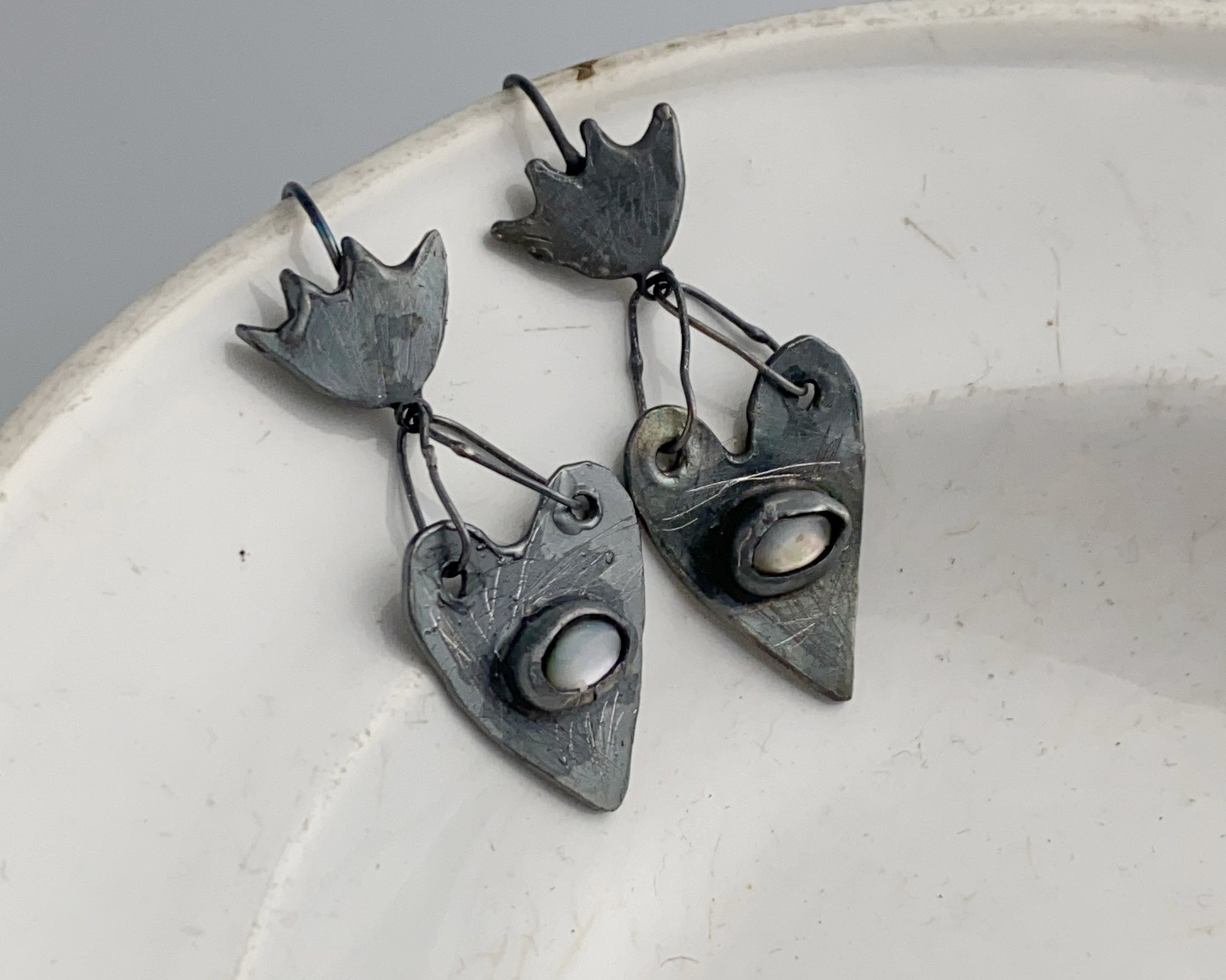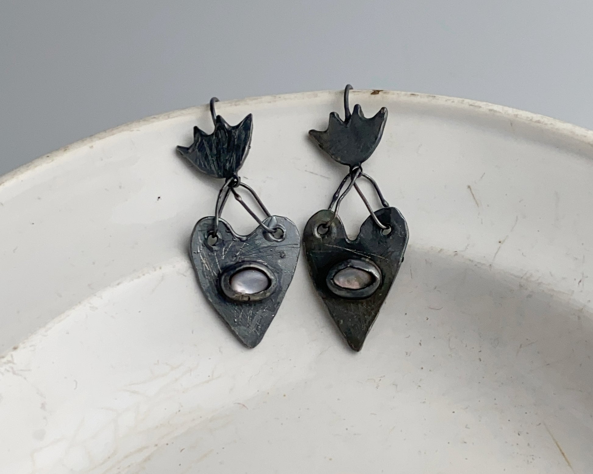 Handcrafted oxidized silver earrings with black abalone shell inlays. These earrings feature a rich, textured surface that accentuates the shell’s natural iridescence, creating a striking contrast against the dark patina.