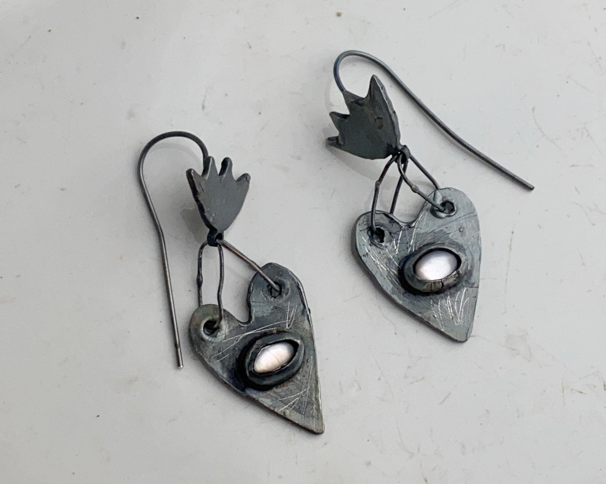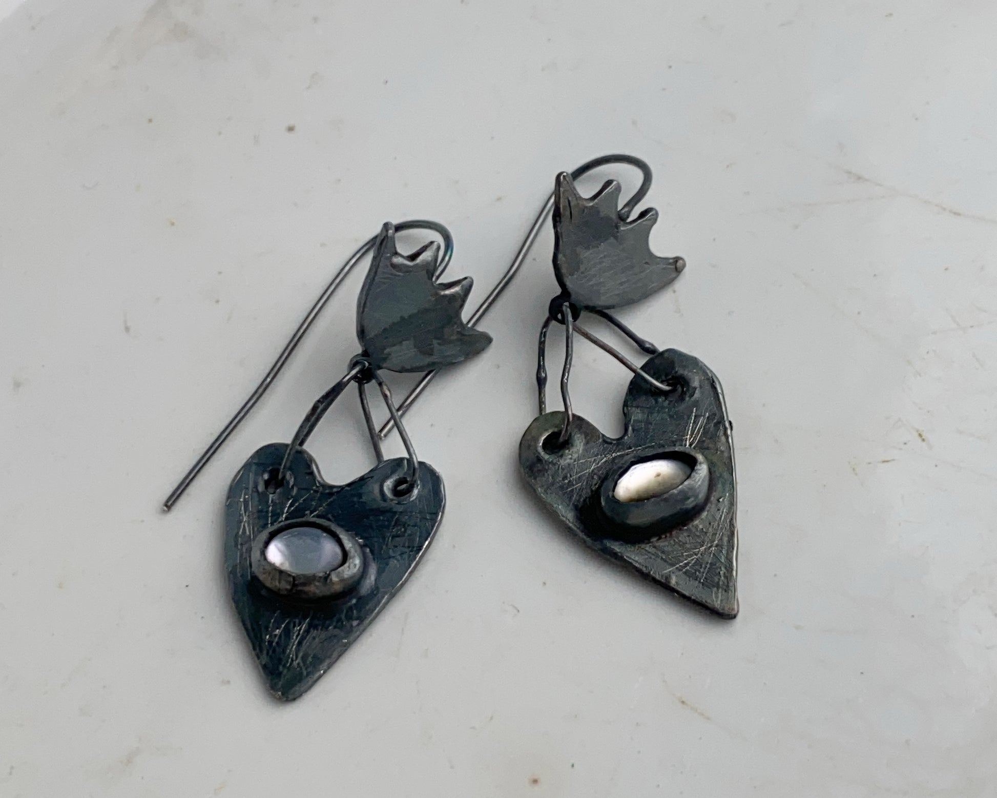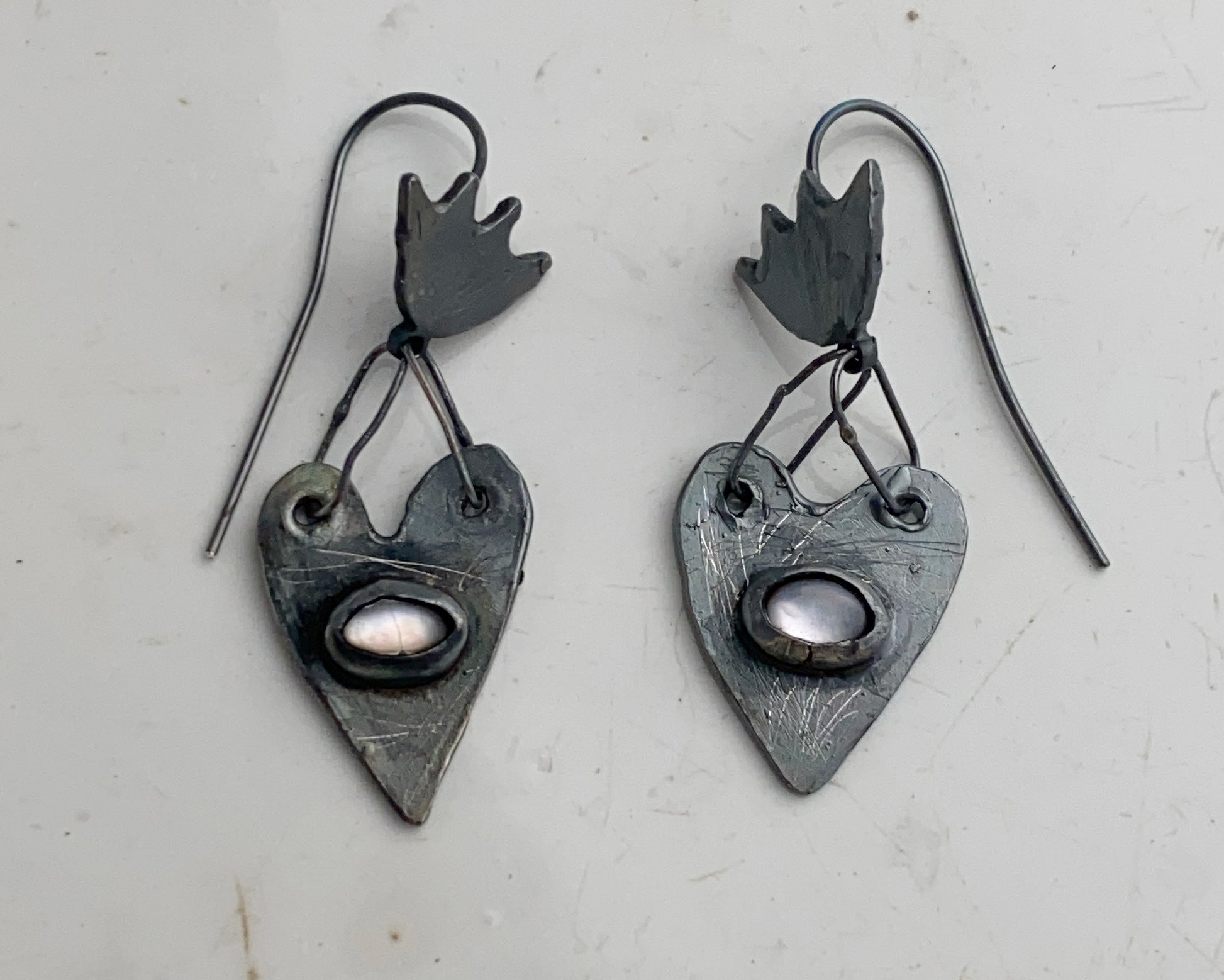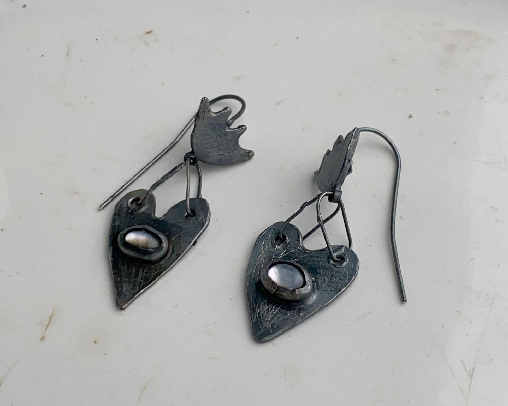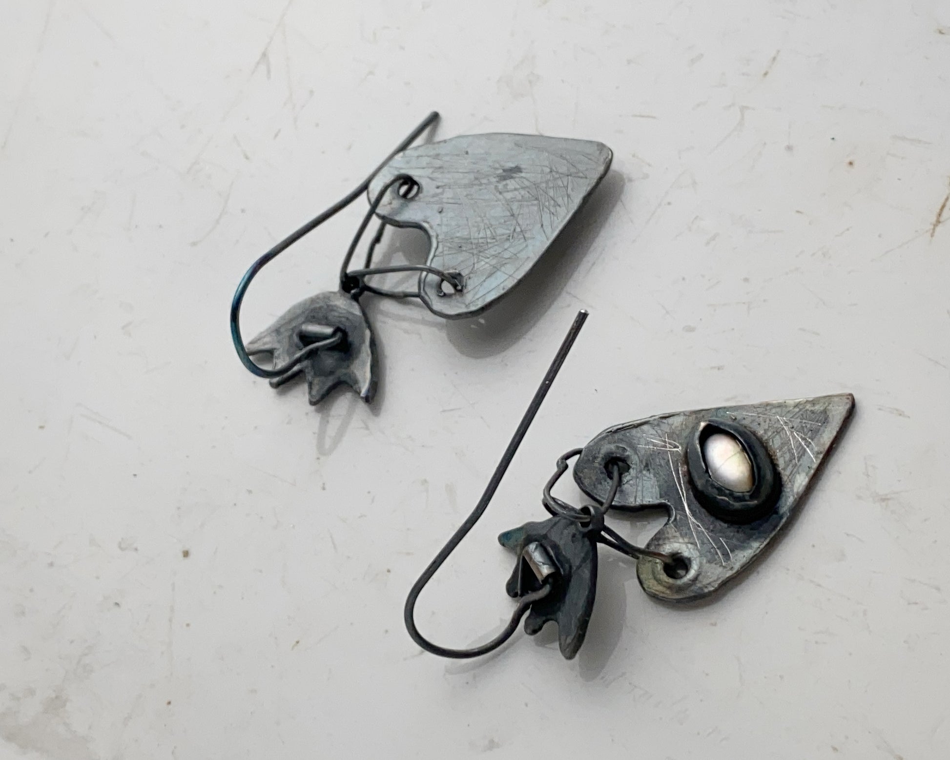 Handcrafted oxidized silver earrings with black abalone shell inlays. These earrings feature a rich, textured surface that accentuates the shell’s natural iridescence, creating a striking contrast against the dark patina.