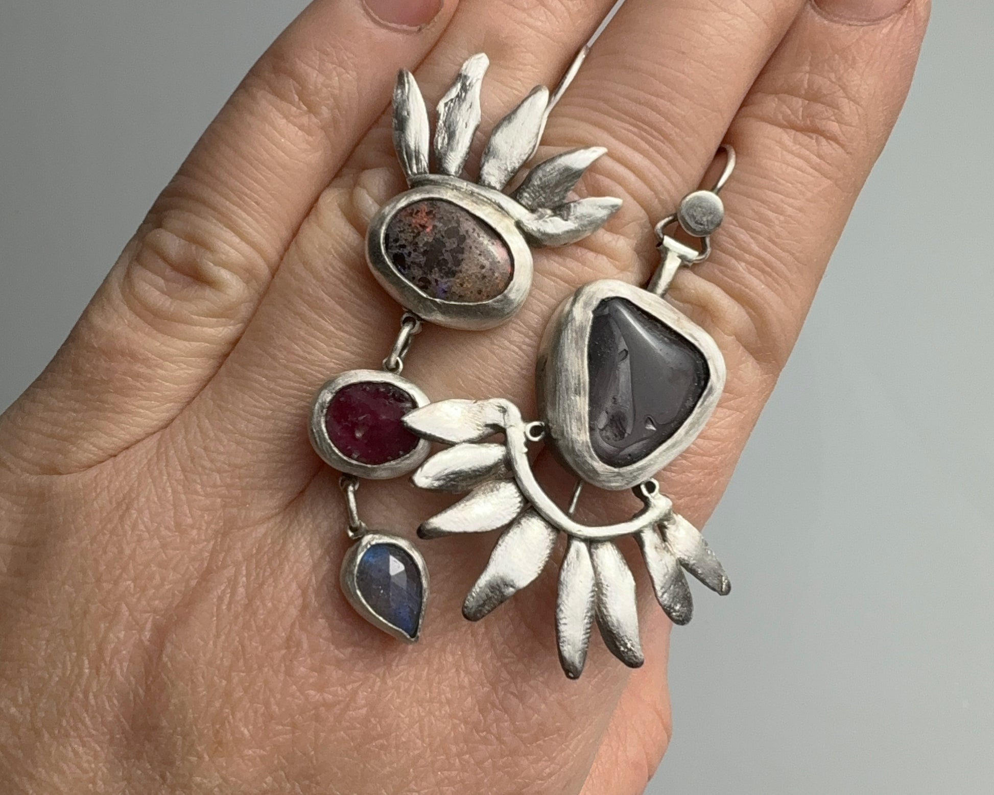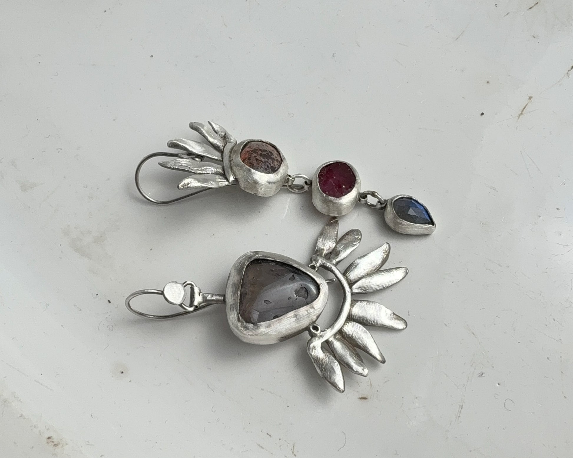 Handcrafted sterling silver earrings featuring asymmetric designs with natural gemstones. The left earring showcases a Iolite with radiating silver petals, while the right displays a vertical composition of opal, ruby, and teardrop labradorite