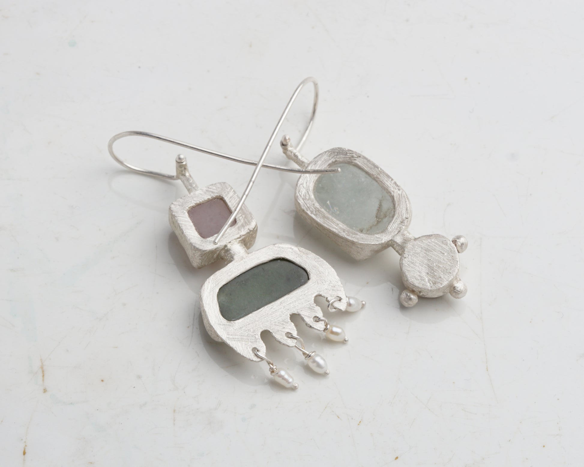 Handcrafted from 925 sterling silver, these mismatched earrings feature a distinct, organic texture. One earring is set with a translucent aquamarine and a raw sapphire. The companion piece features chalcedony and jade, finished with small river pearl dangles. This is a unique, one-of-a-kind set.