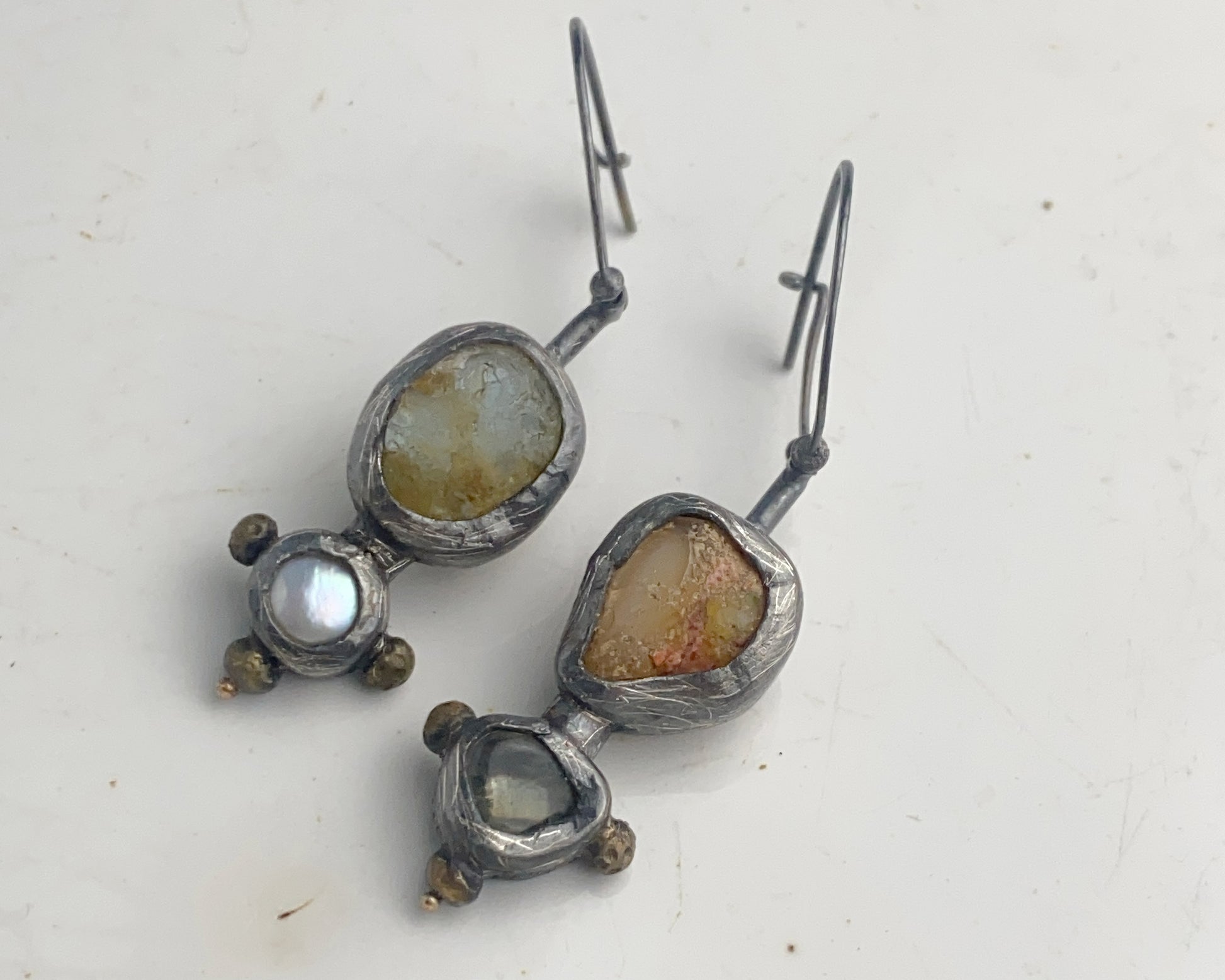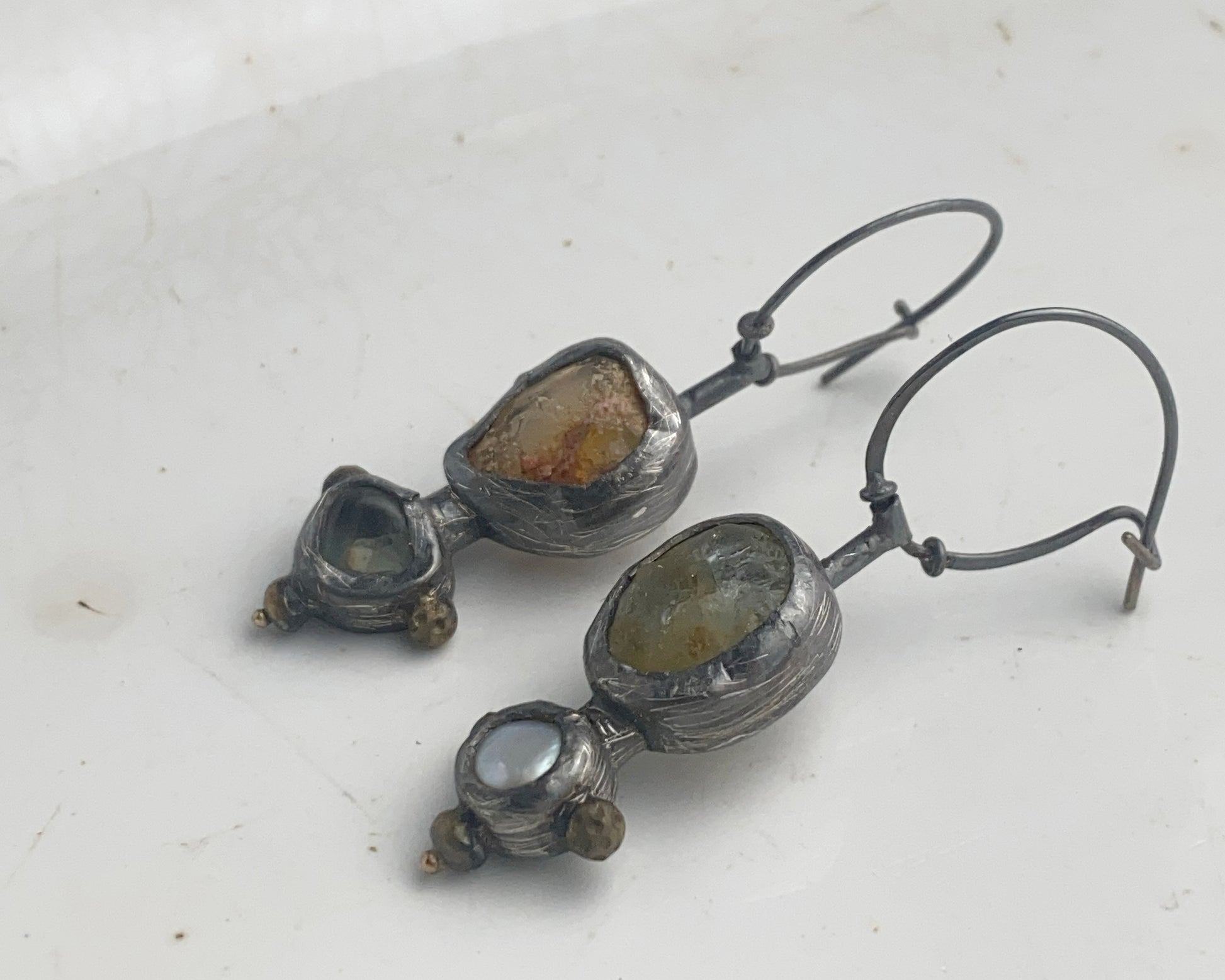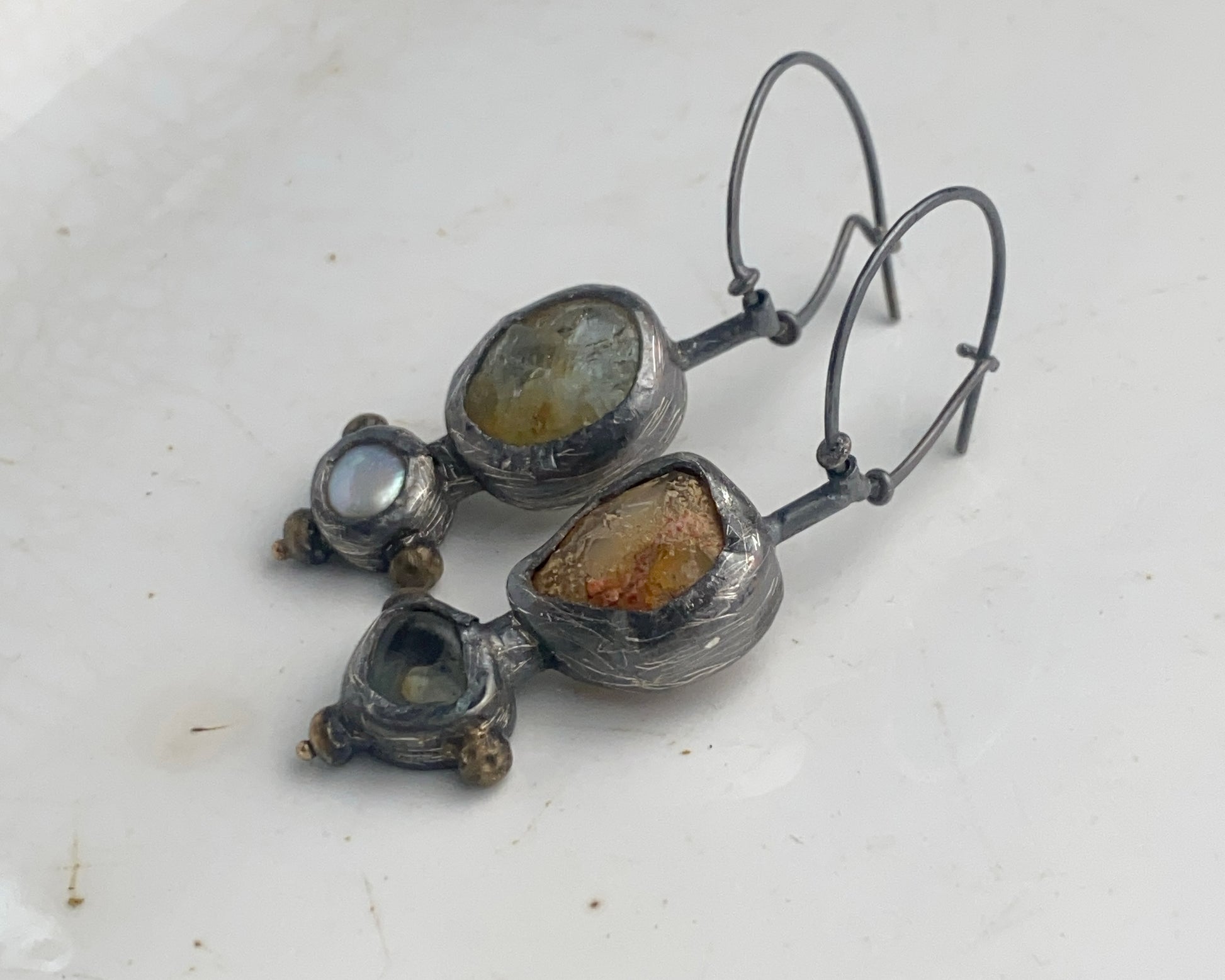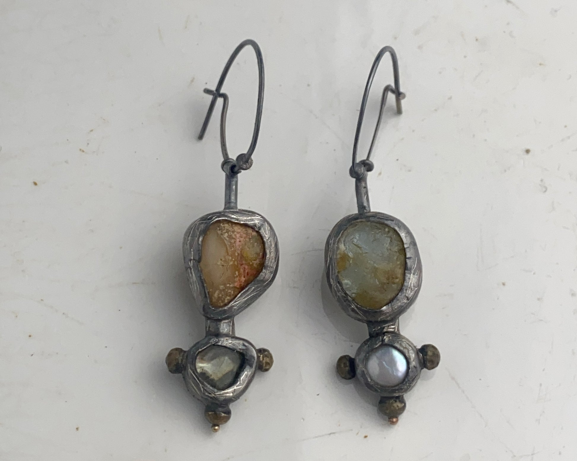 Earrings crafted from sterling silver with 18k gold details. Stones include fire opal, aquamarine, and pearl. Equipped with a secure clasp.