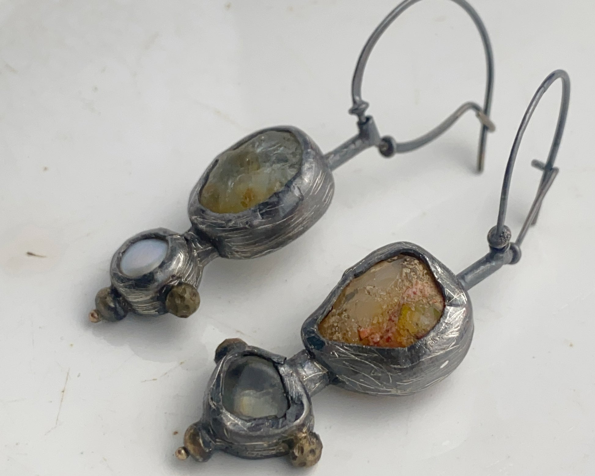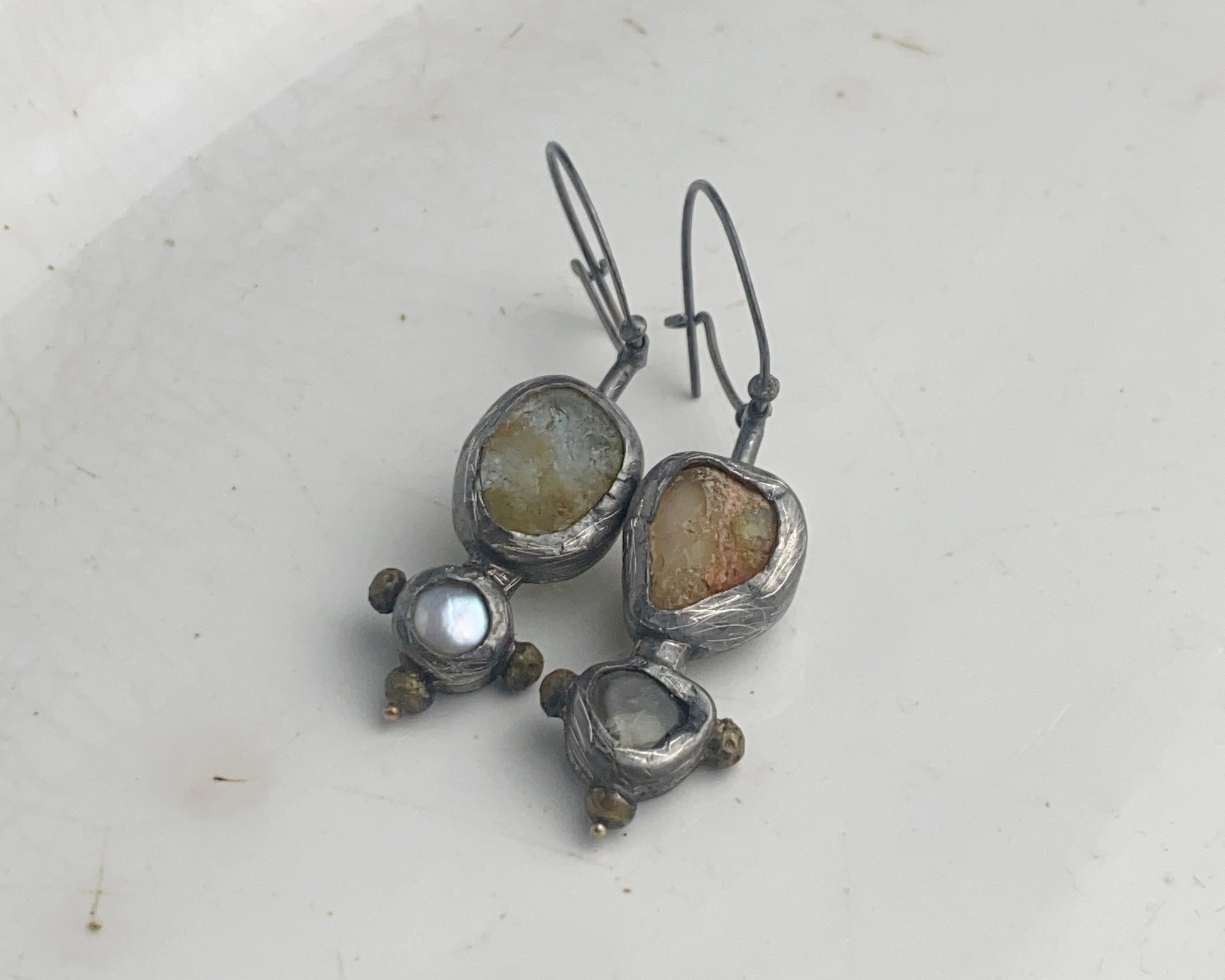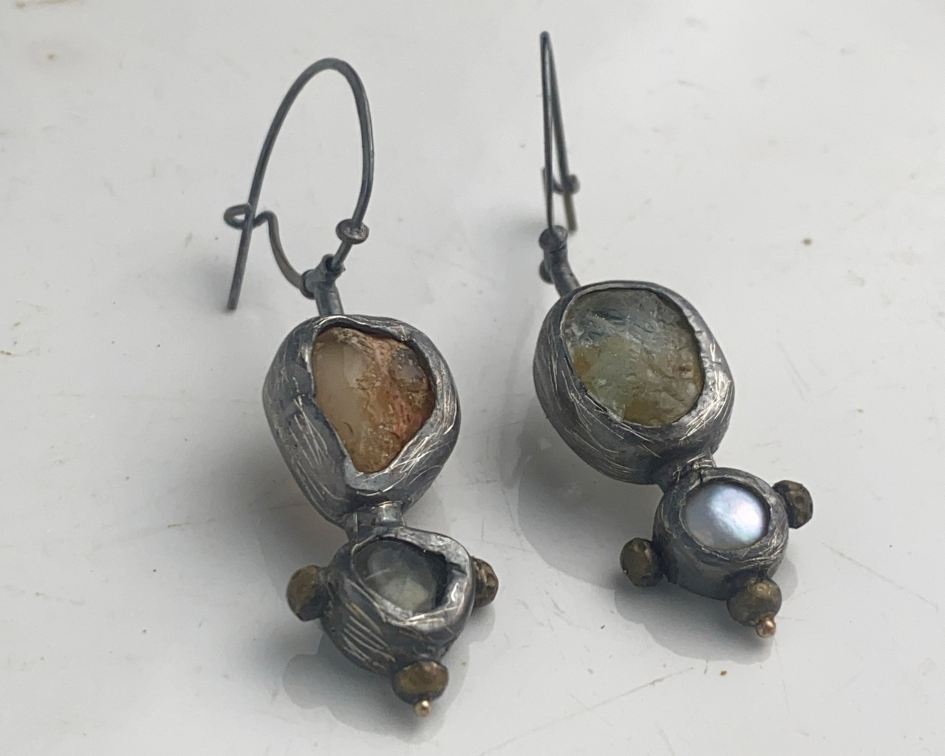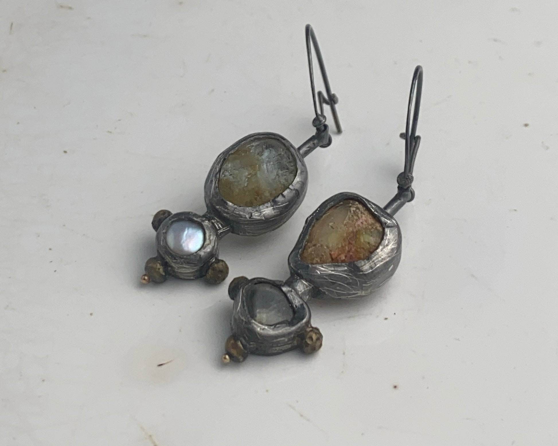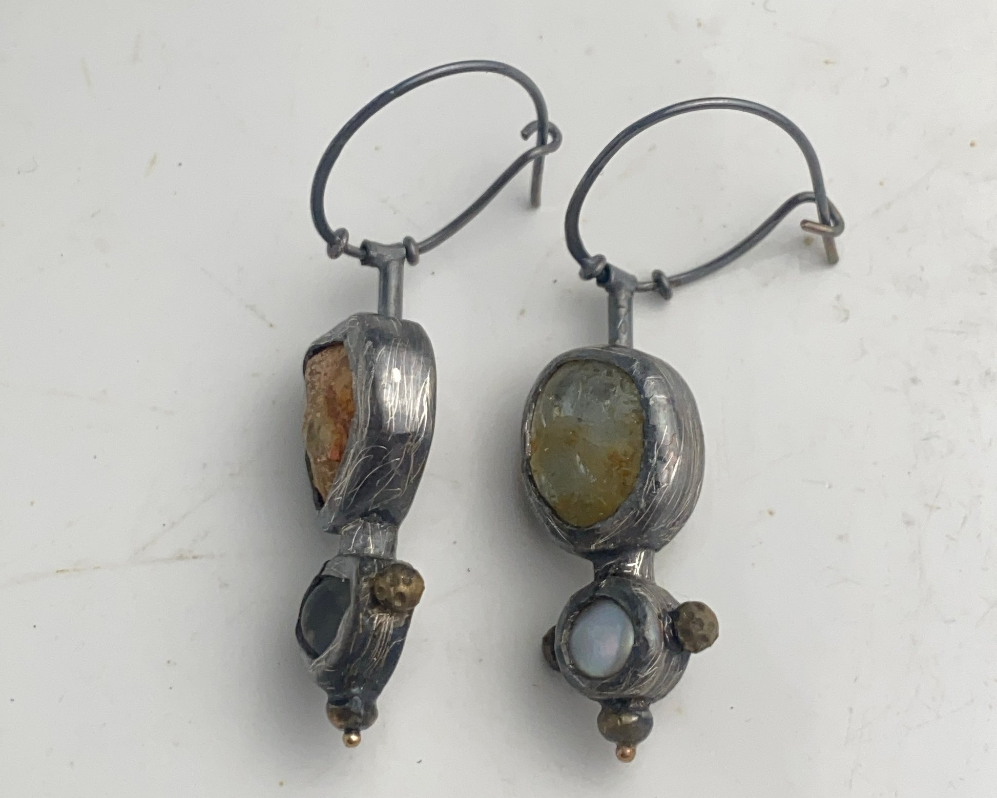 Earrings crafted from sterling silver with 18k gold details. Stones include fire opal, aquamarine, and pearl. Equipped with a secure clasp.