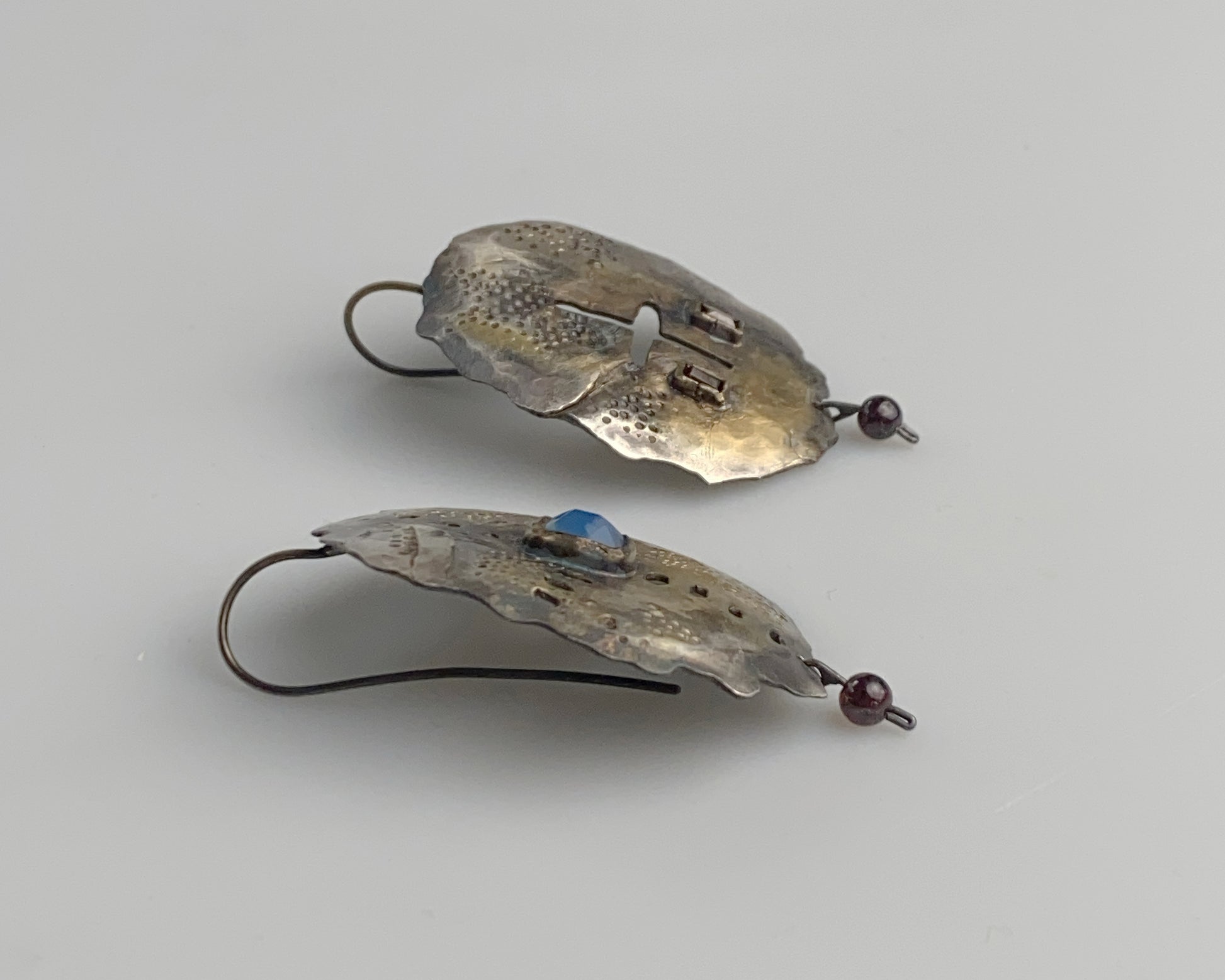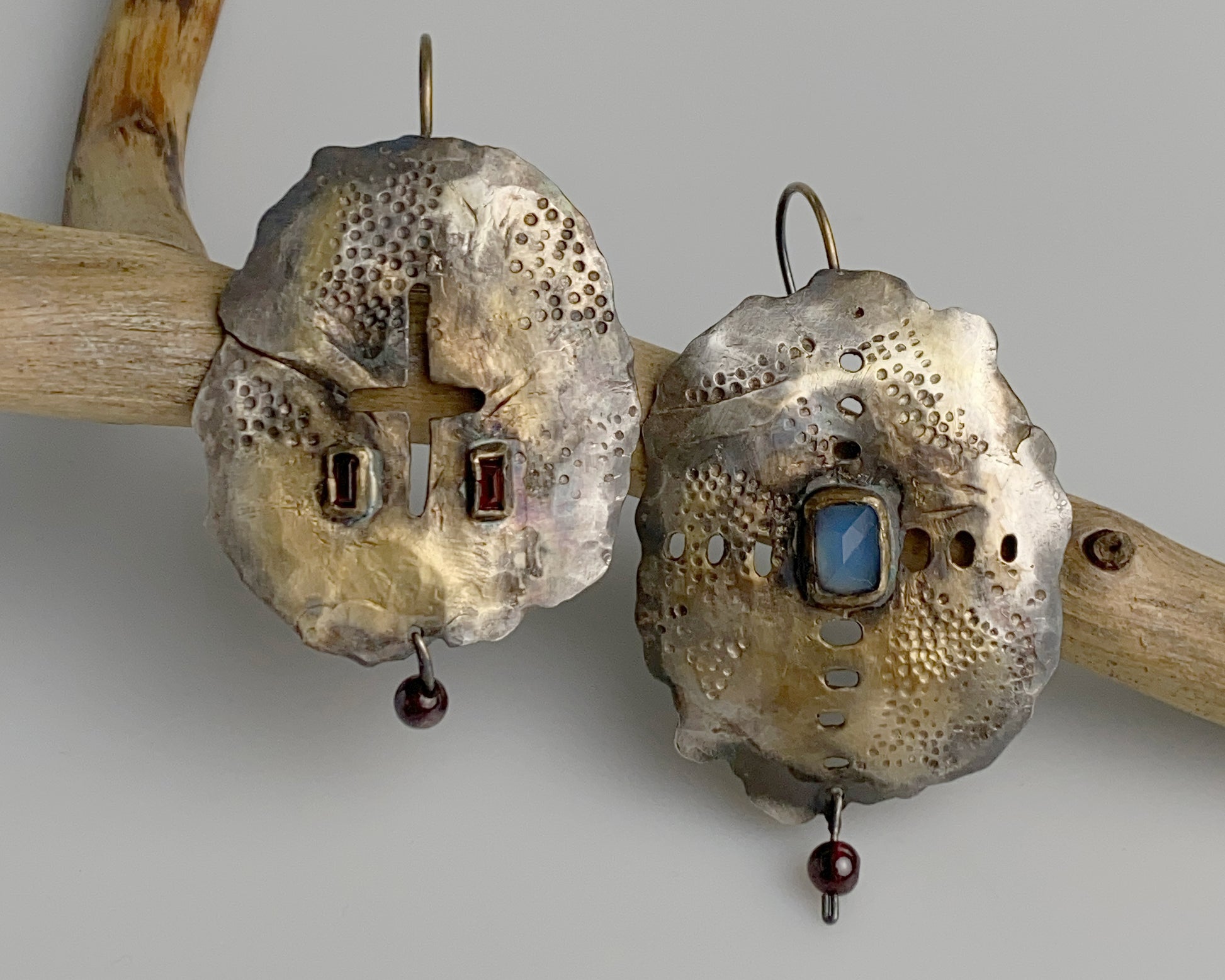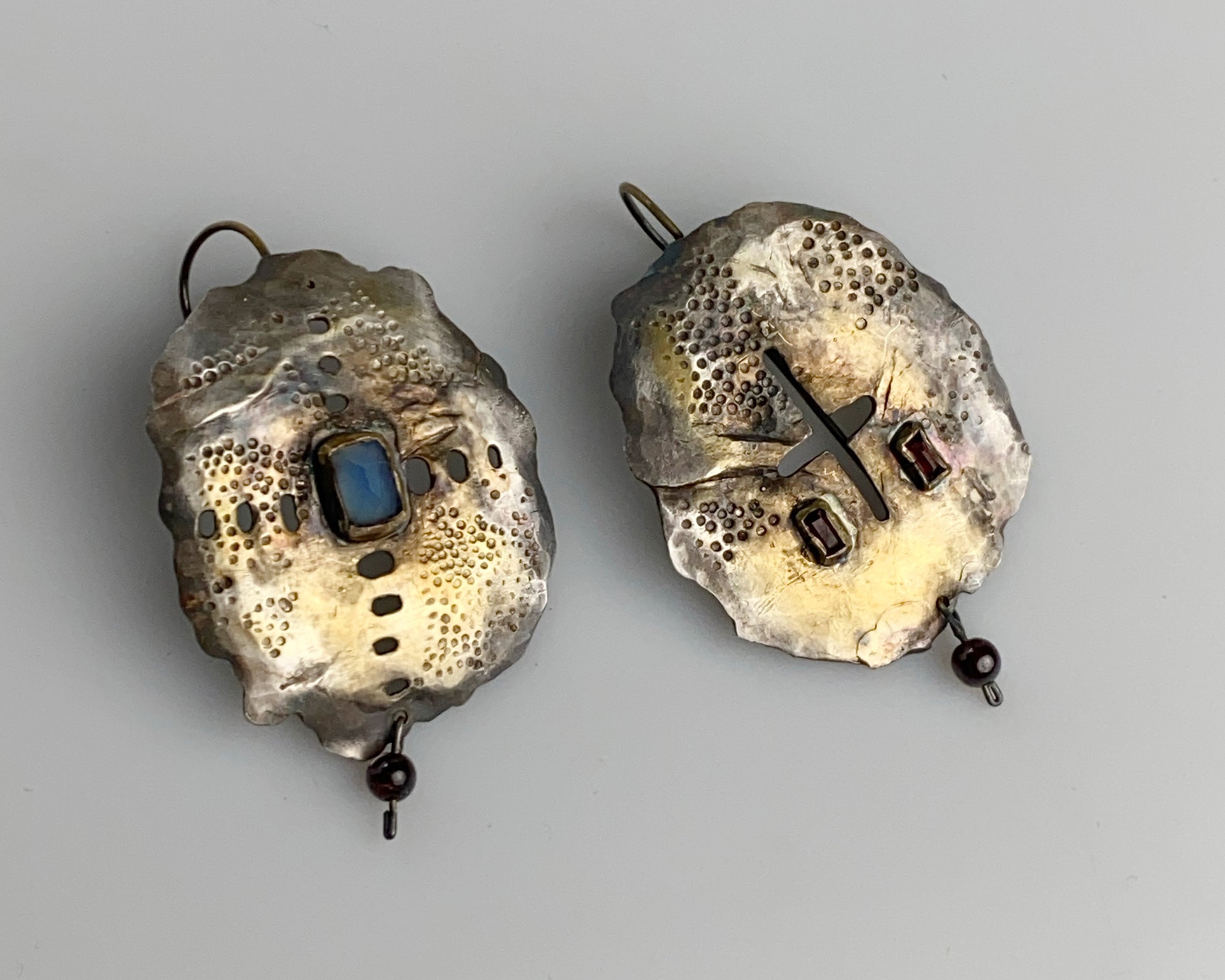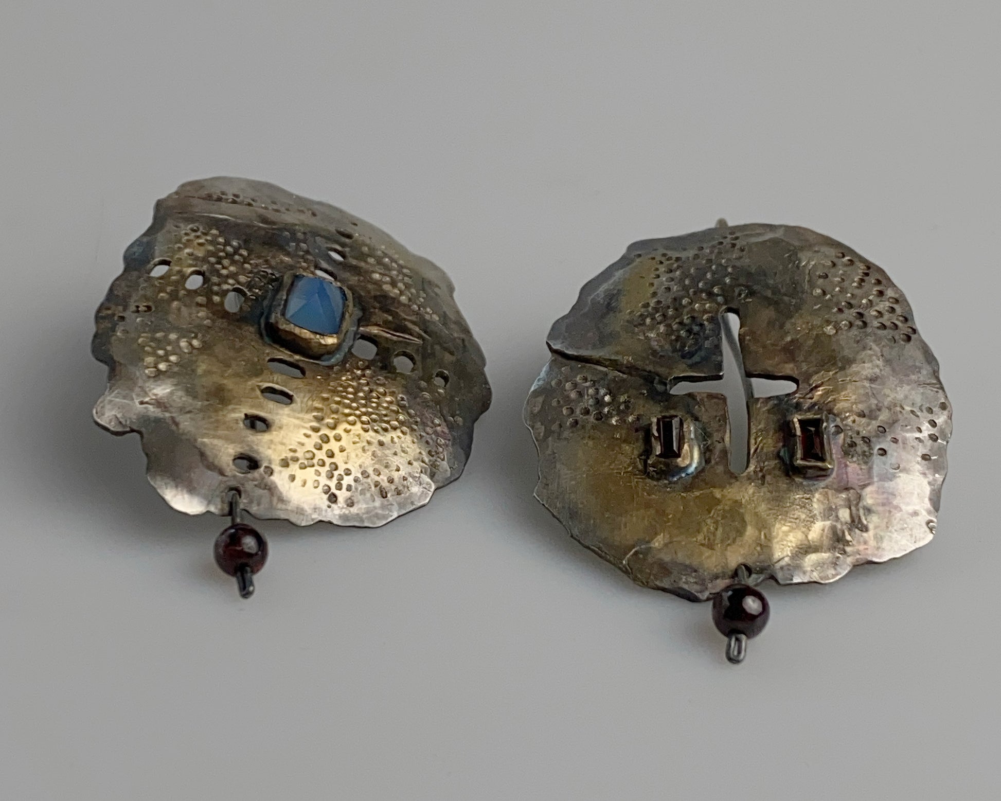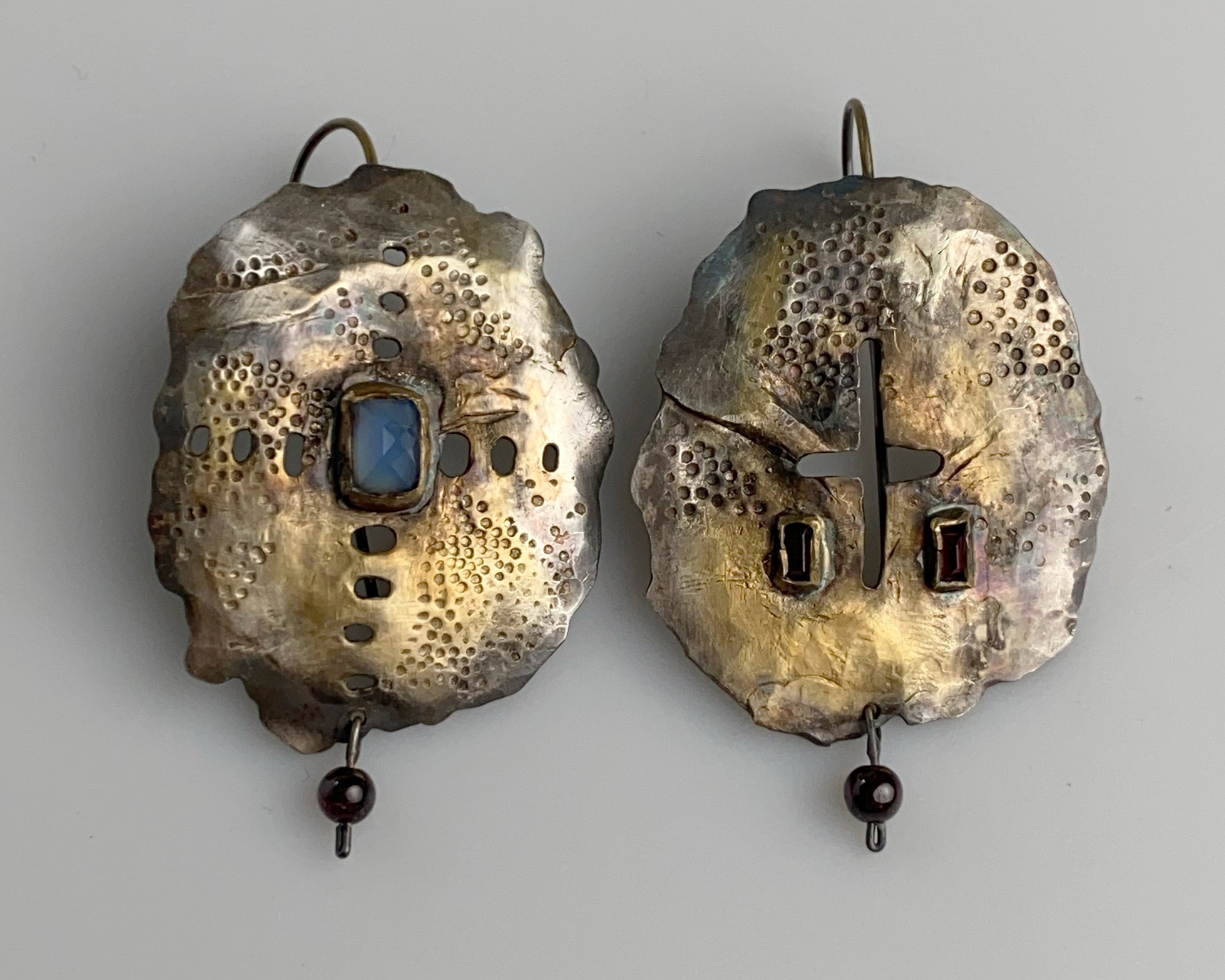 One earring features an oval-shaped sterling silver setting with a textured, hammered surface. It is set with a rectangular agate stone. Small ruby beads are incorporated into the design. The setting is decorated with tiny holes and indentations. The second earring has a similar textured silver surface with a vertical slot crossed by a horizontal bar, resembling a cross. It also includes small rectangular rubies and textured details. Both earrings have hooks at the top for wearing and a small round bead at the bottom. The items are handcrafted with a checkered pattern and are gold-plated with 24-karat gold. They are made from sterling silver and are unique pieces.
