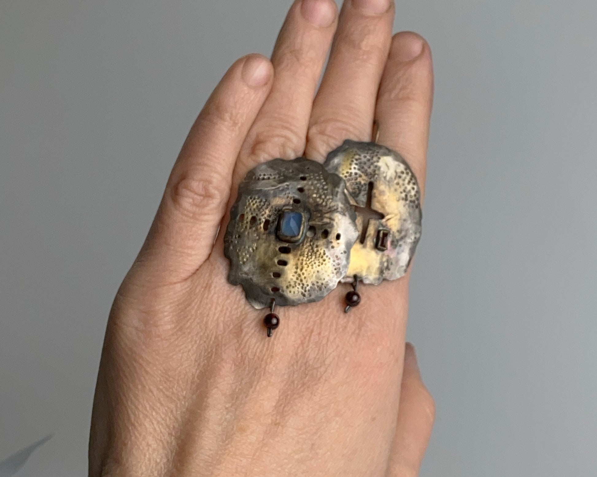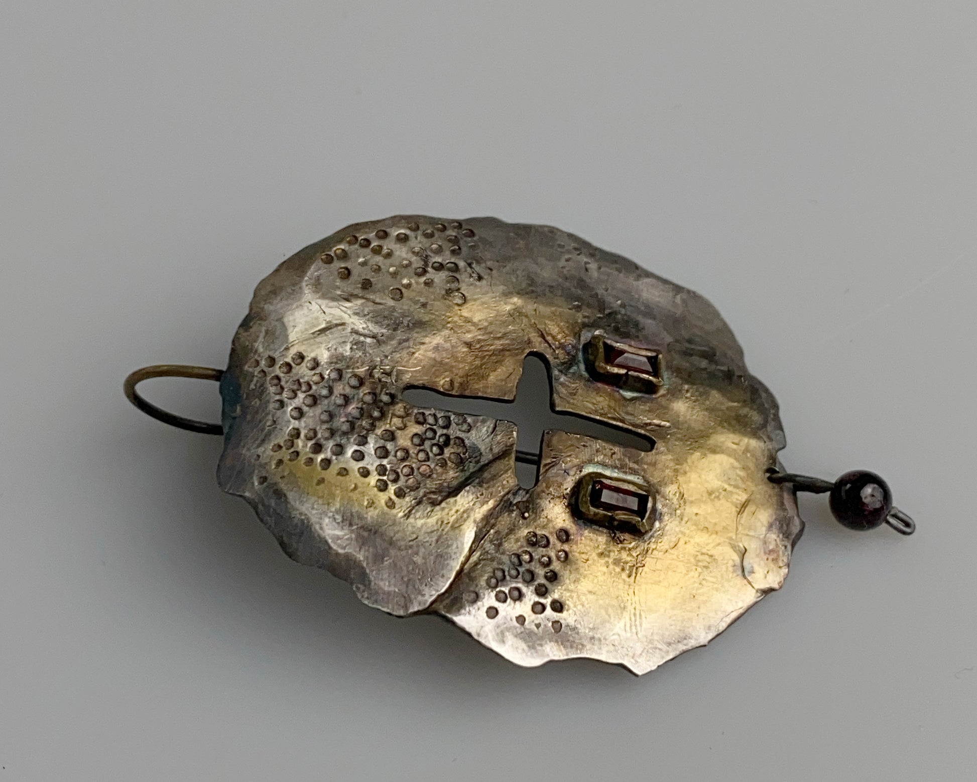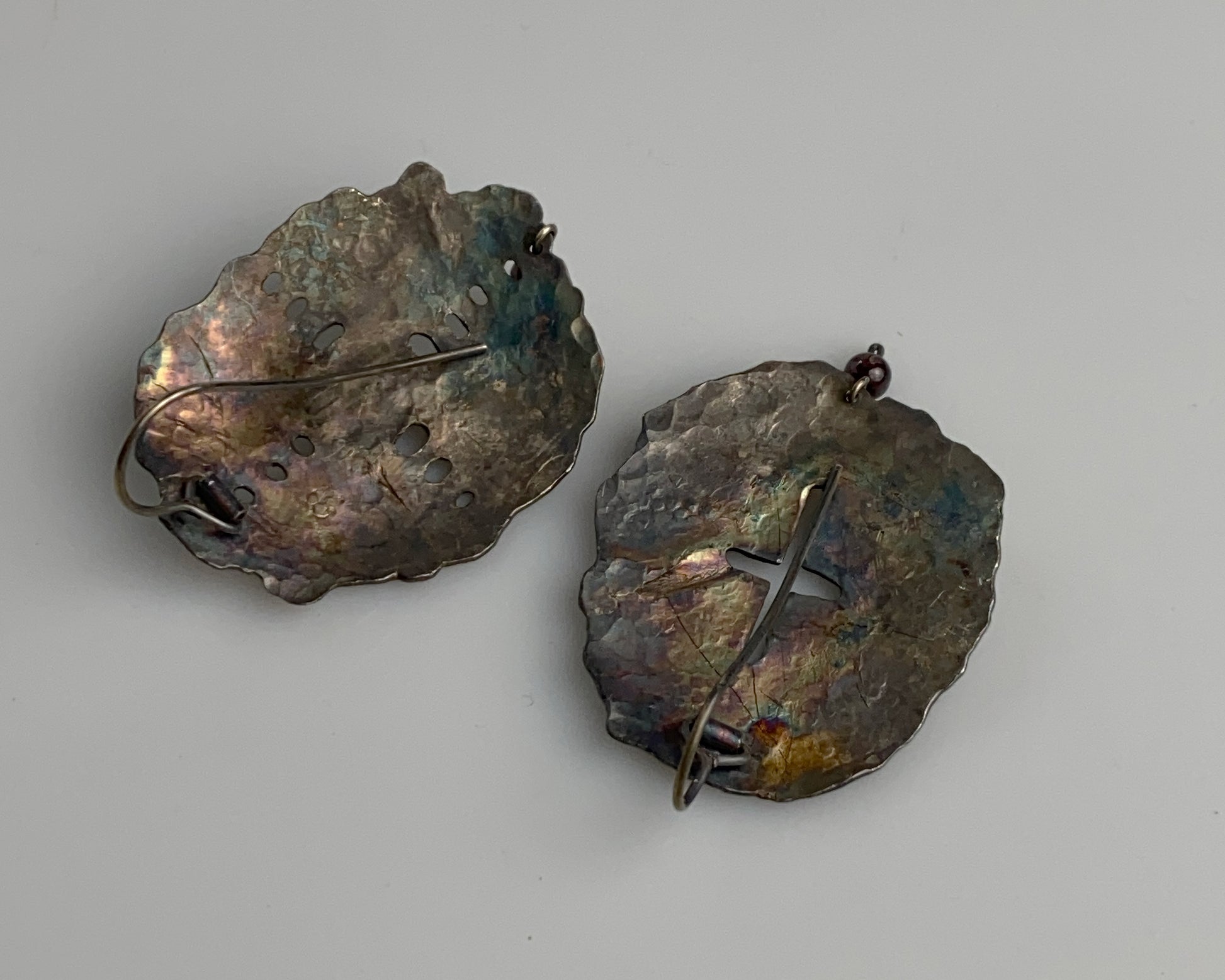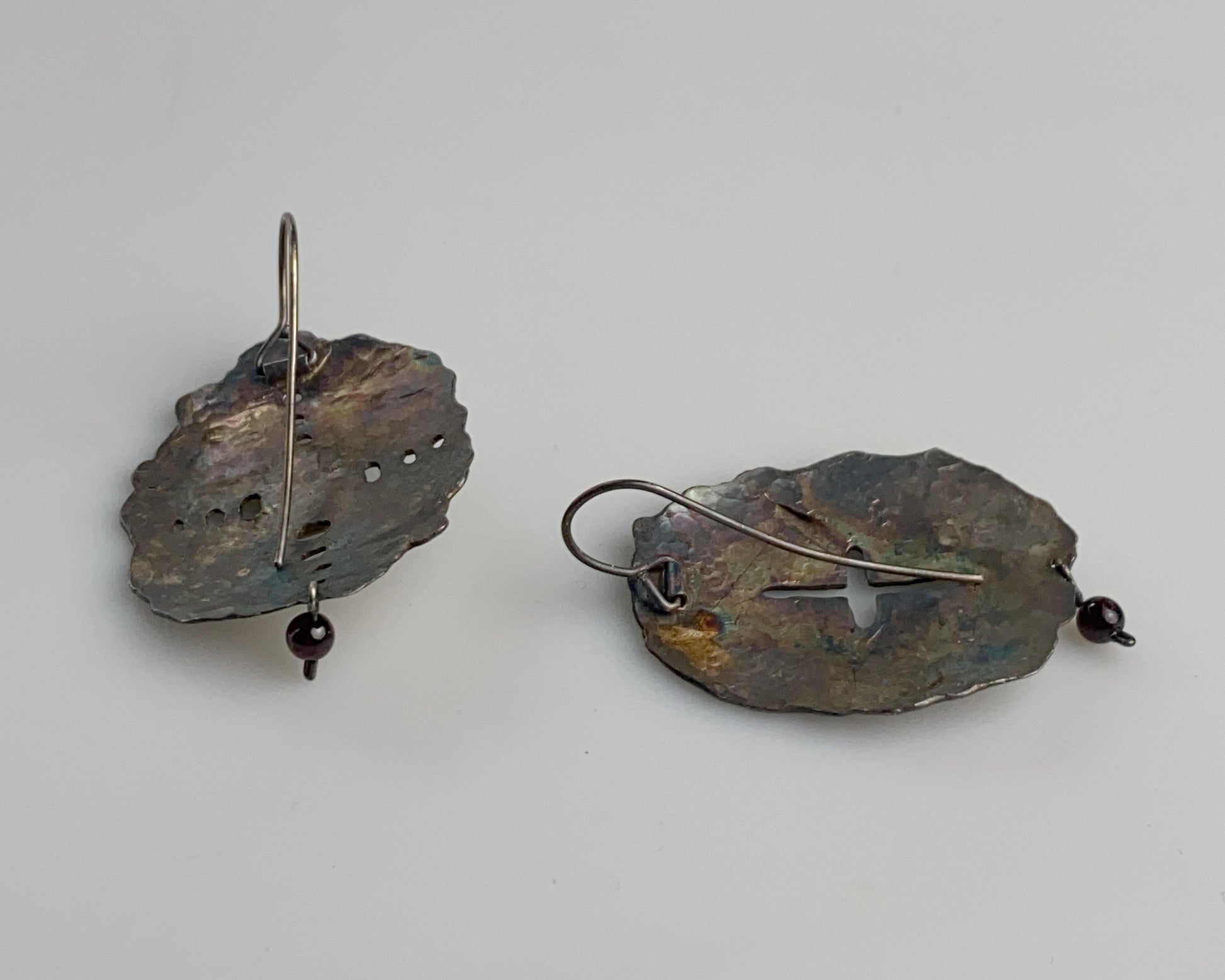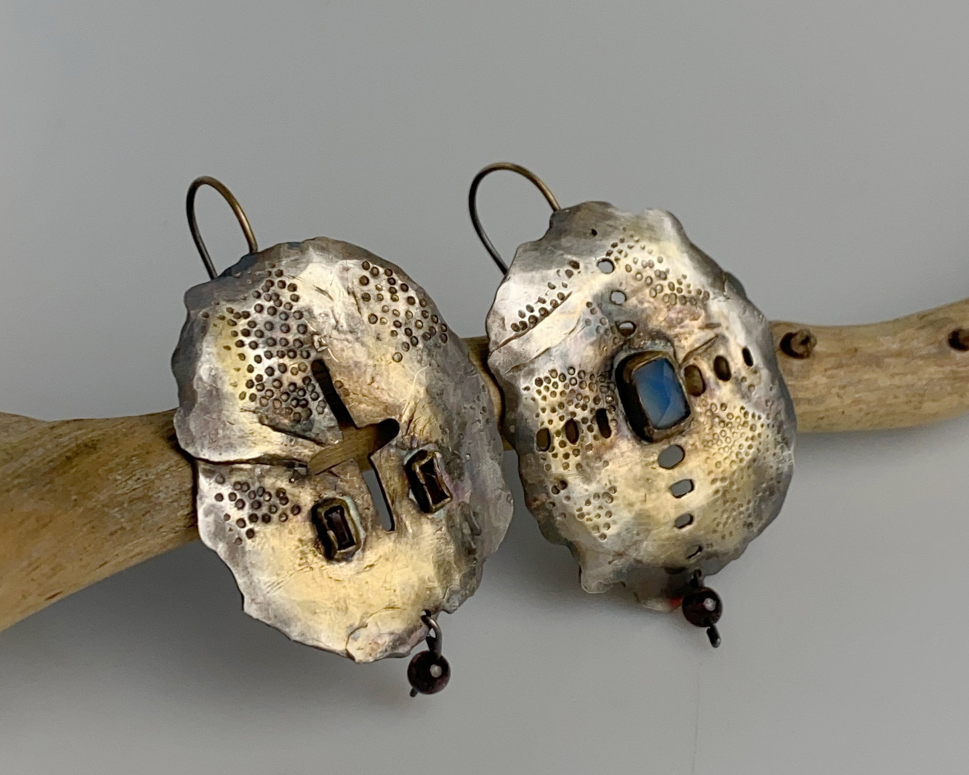 One earring features an oval-shaped sterling silver setting with a textured, hammered surface. It is set with a rectangular agate stone. Small ruby beads are incorporated into the design. The setting is decorated with tiny holes and indentations. The second earring has a similar textured silver surface with a vertical slot crossed by a horizontal bar, resembling a cross. It also includes small rectangular rubies and textured details. Both earrings have hooks at the top for wearing and a small round bead at the bottom. The items are handcrafted with a checkered pattern and are gold-plated with 24-karat gold. They are made from sterling silver and are unique pieces.