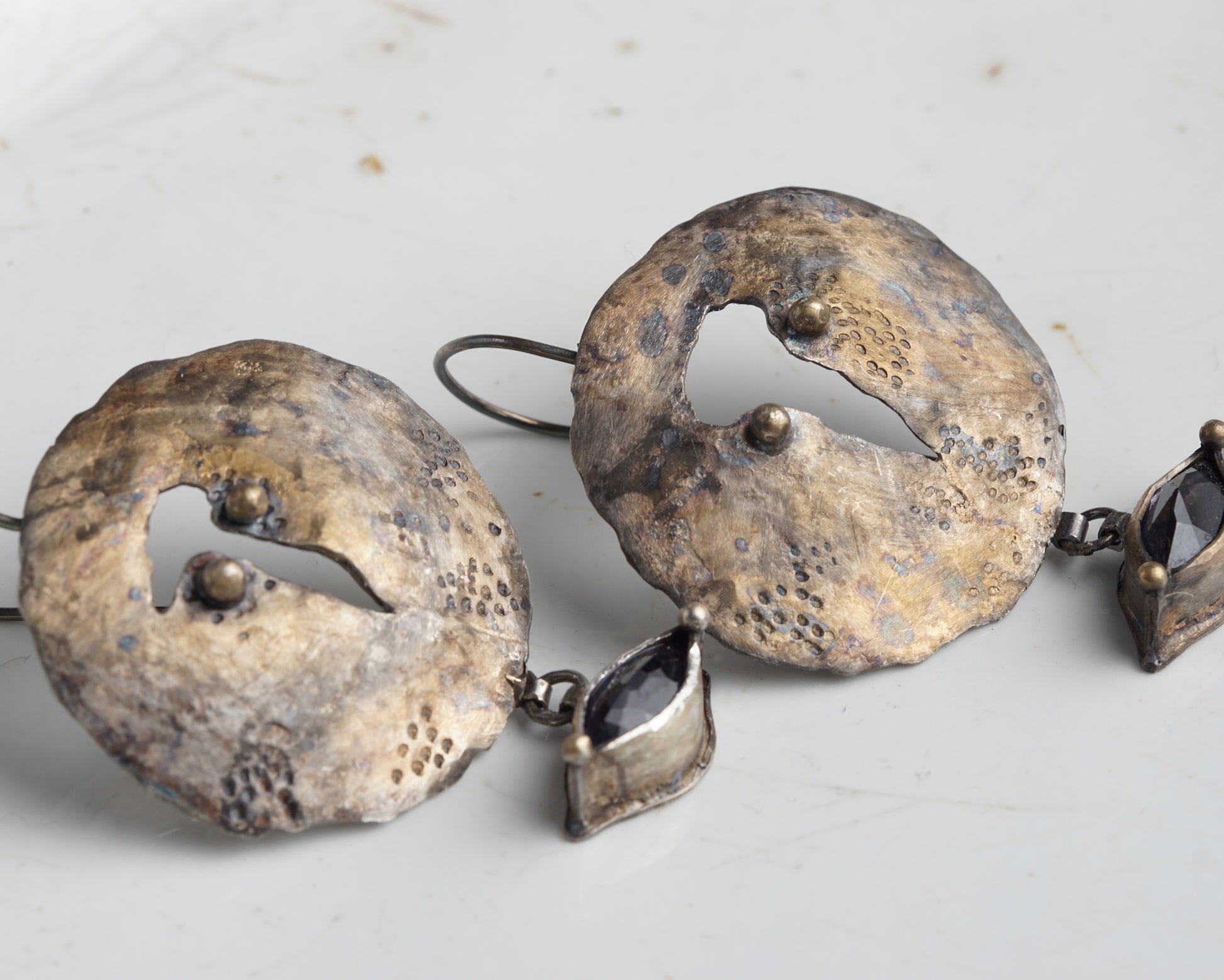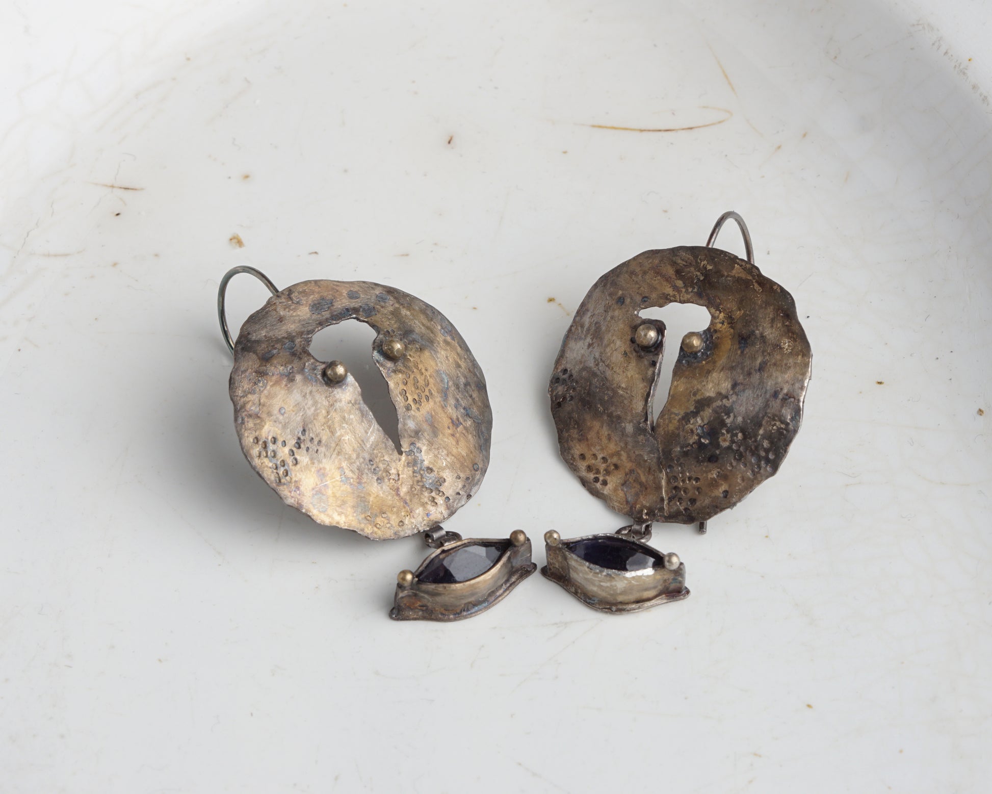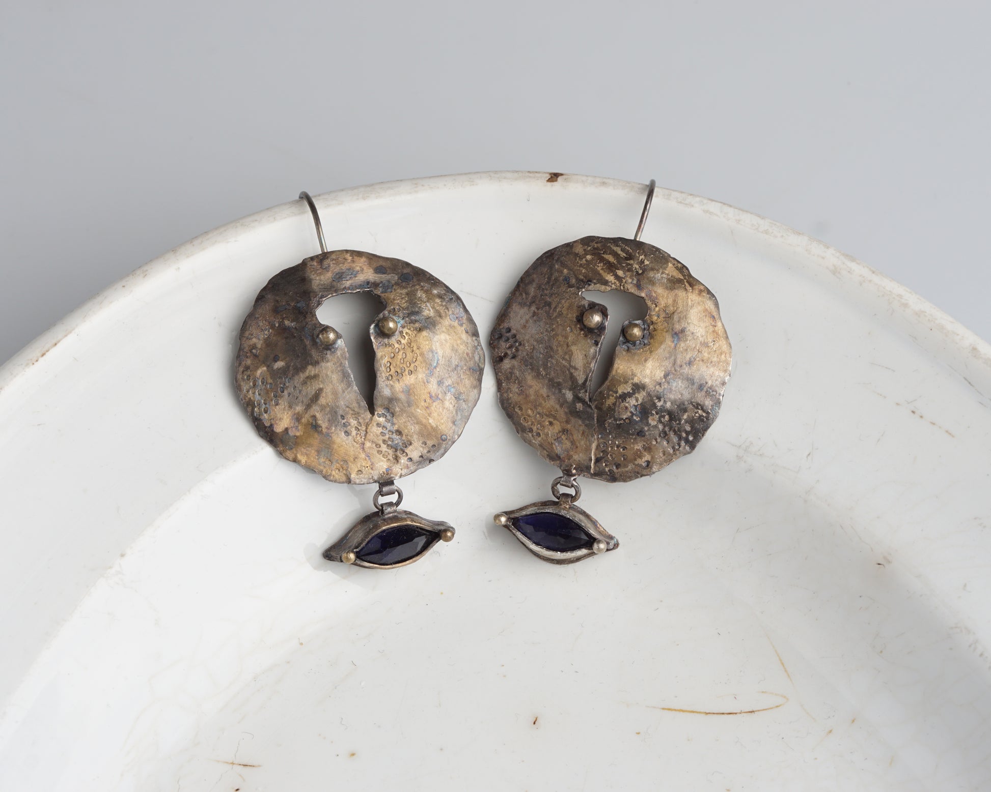 Handcrafted Forged Silver Earrings with Gold Plating and Marquise Iolite