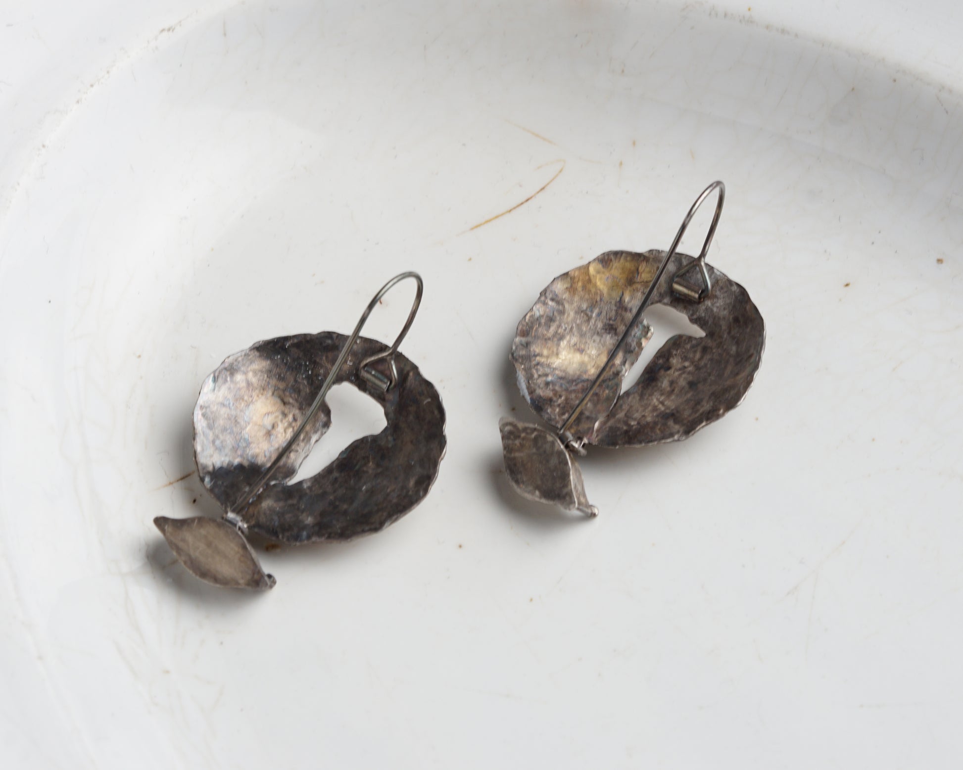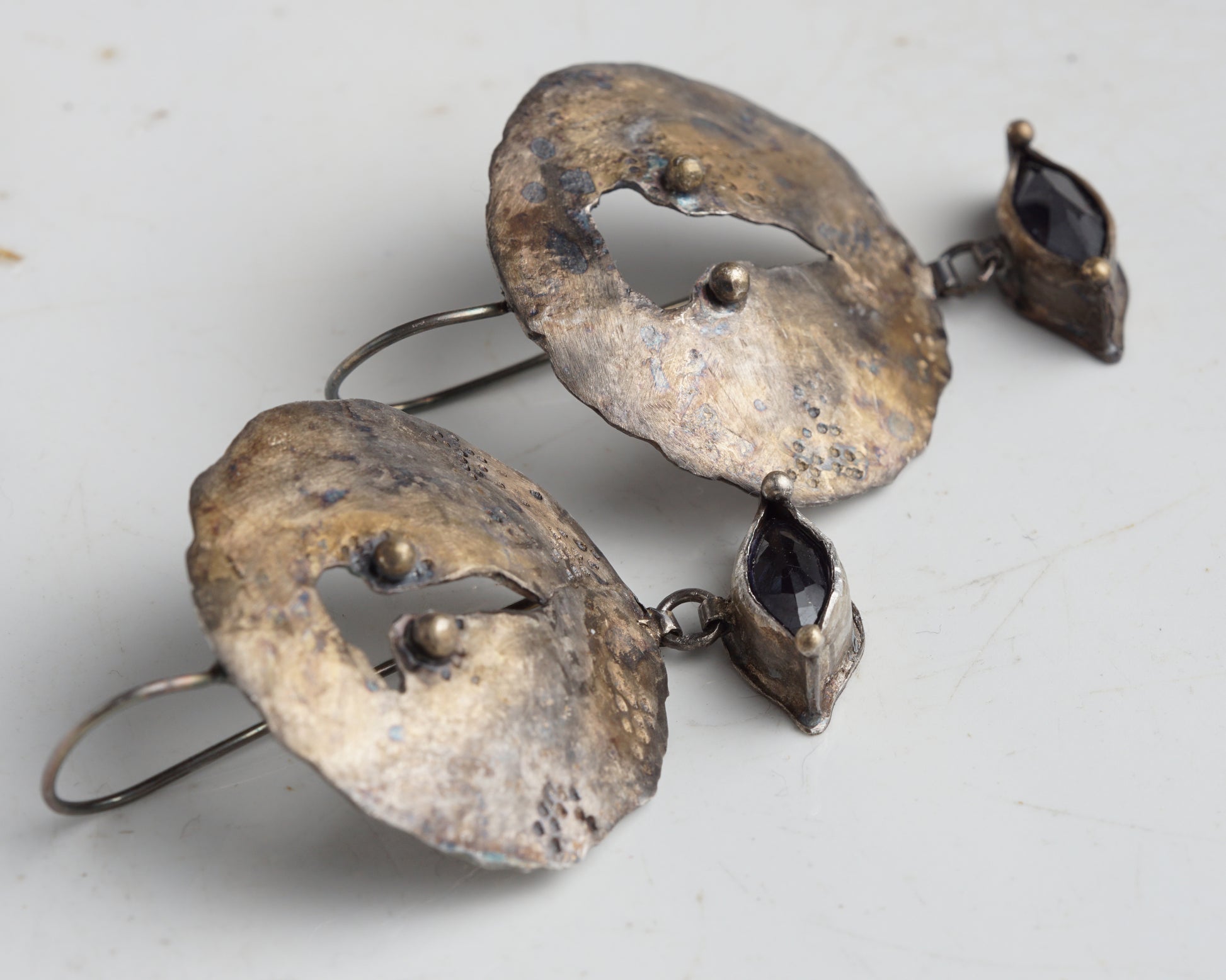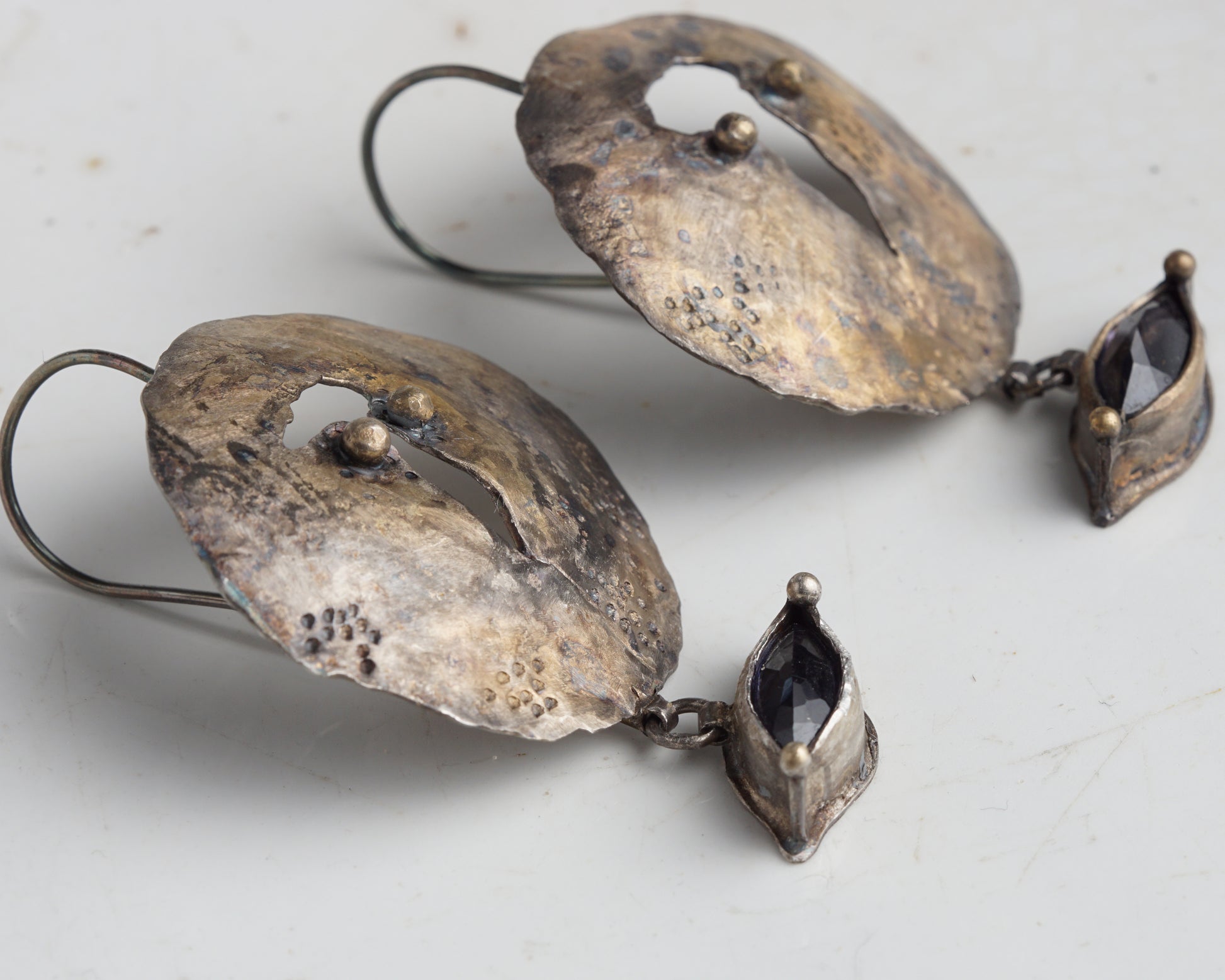 Handcrafted Forged Silver Earrings with Gold Plating and Marquise Iolite