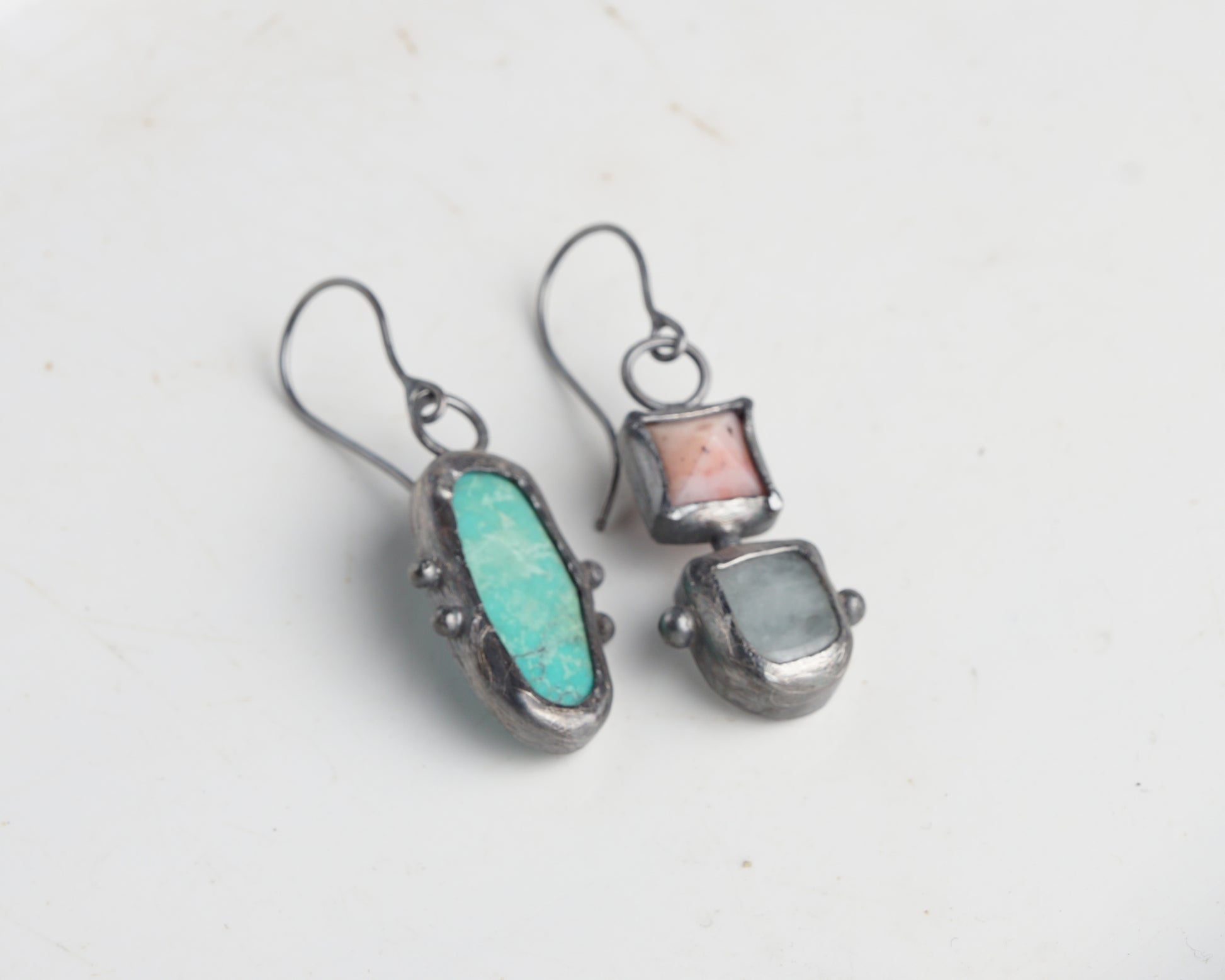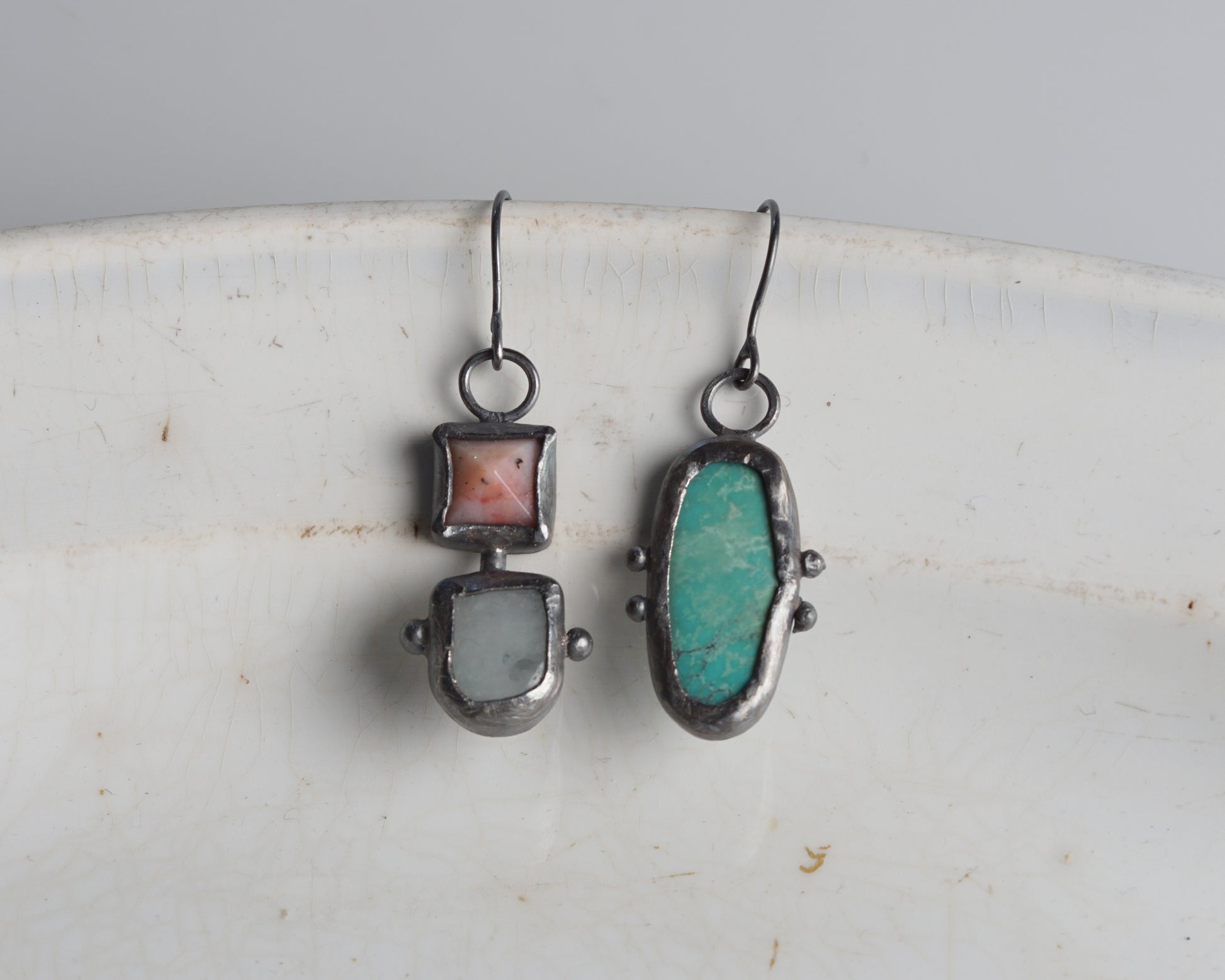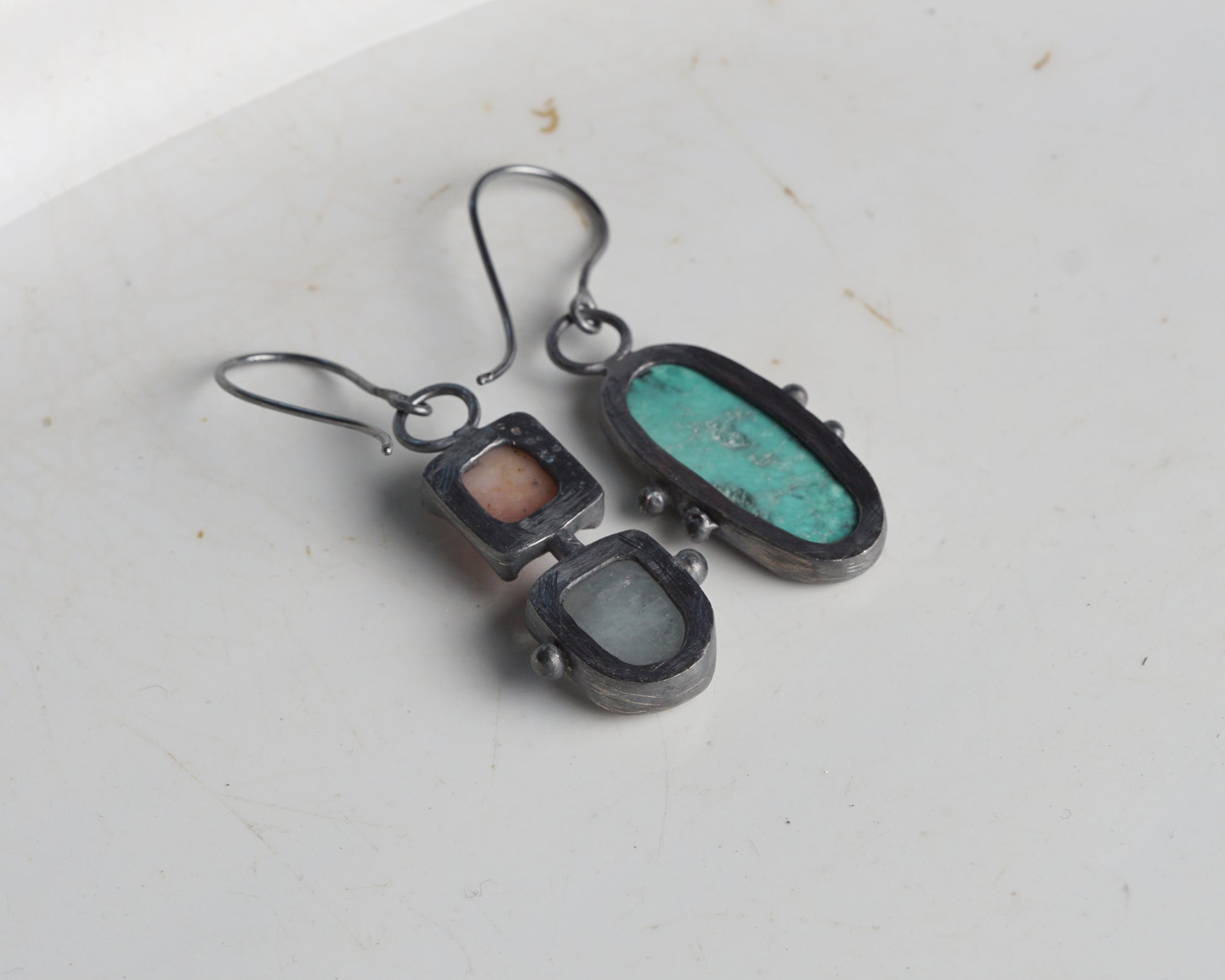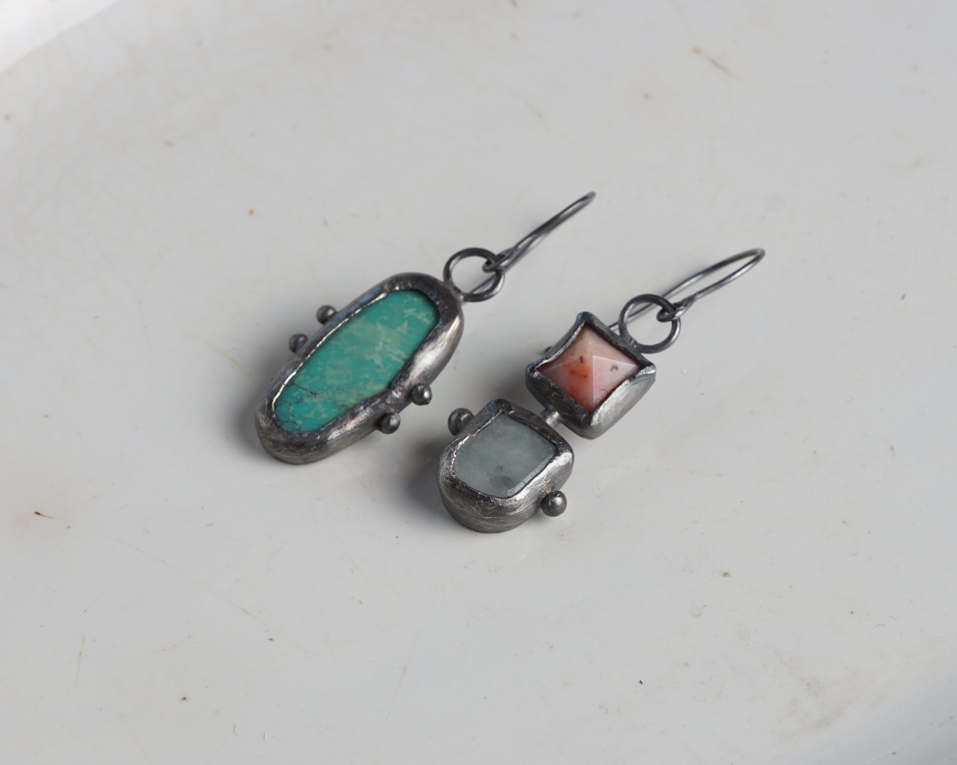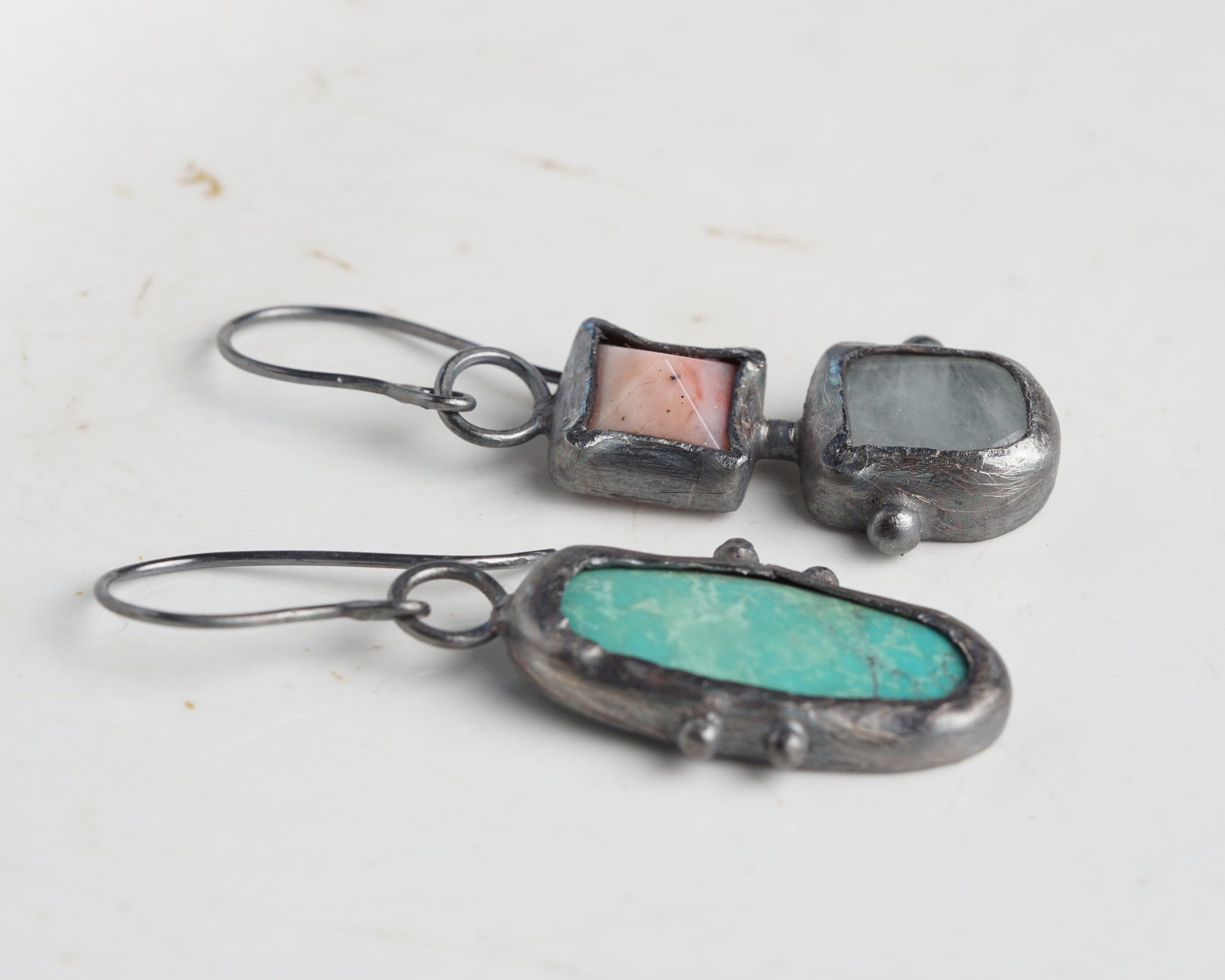 Summer Handcrafted Opal, Aquamarine & Turquoise Oxidized Silver Mismatched Earrings