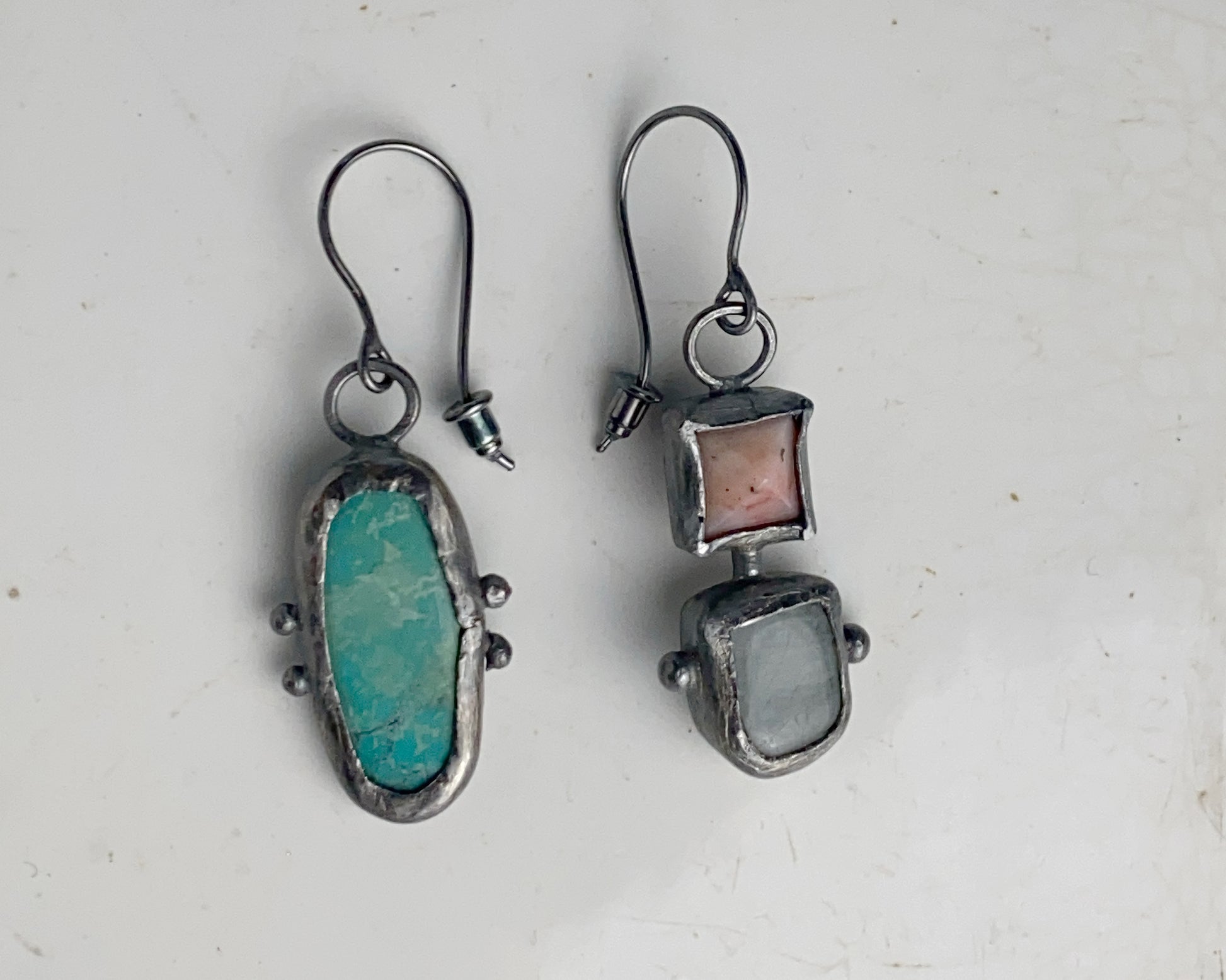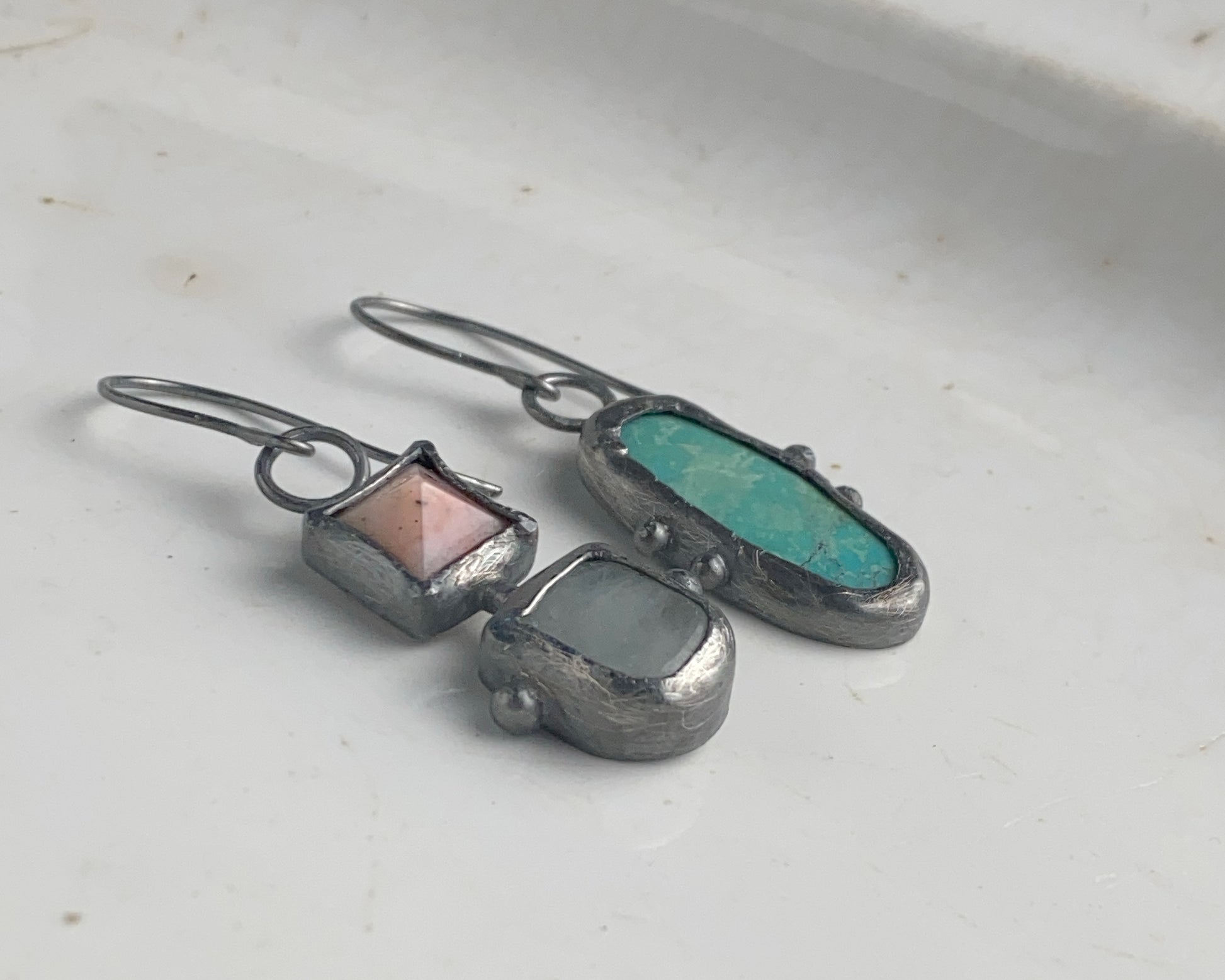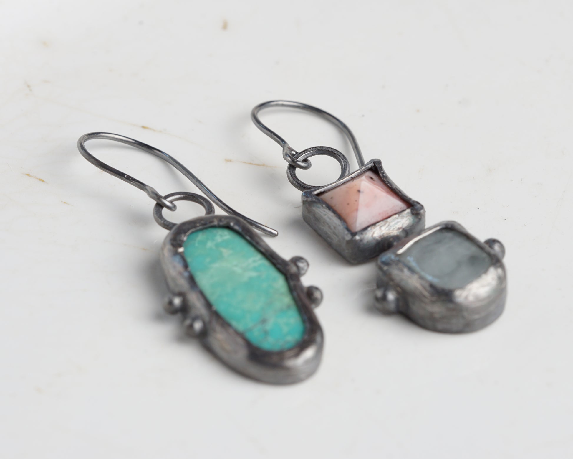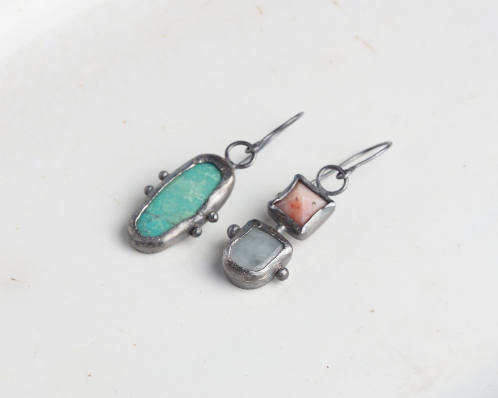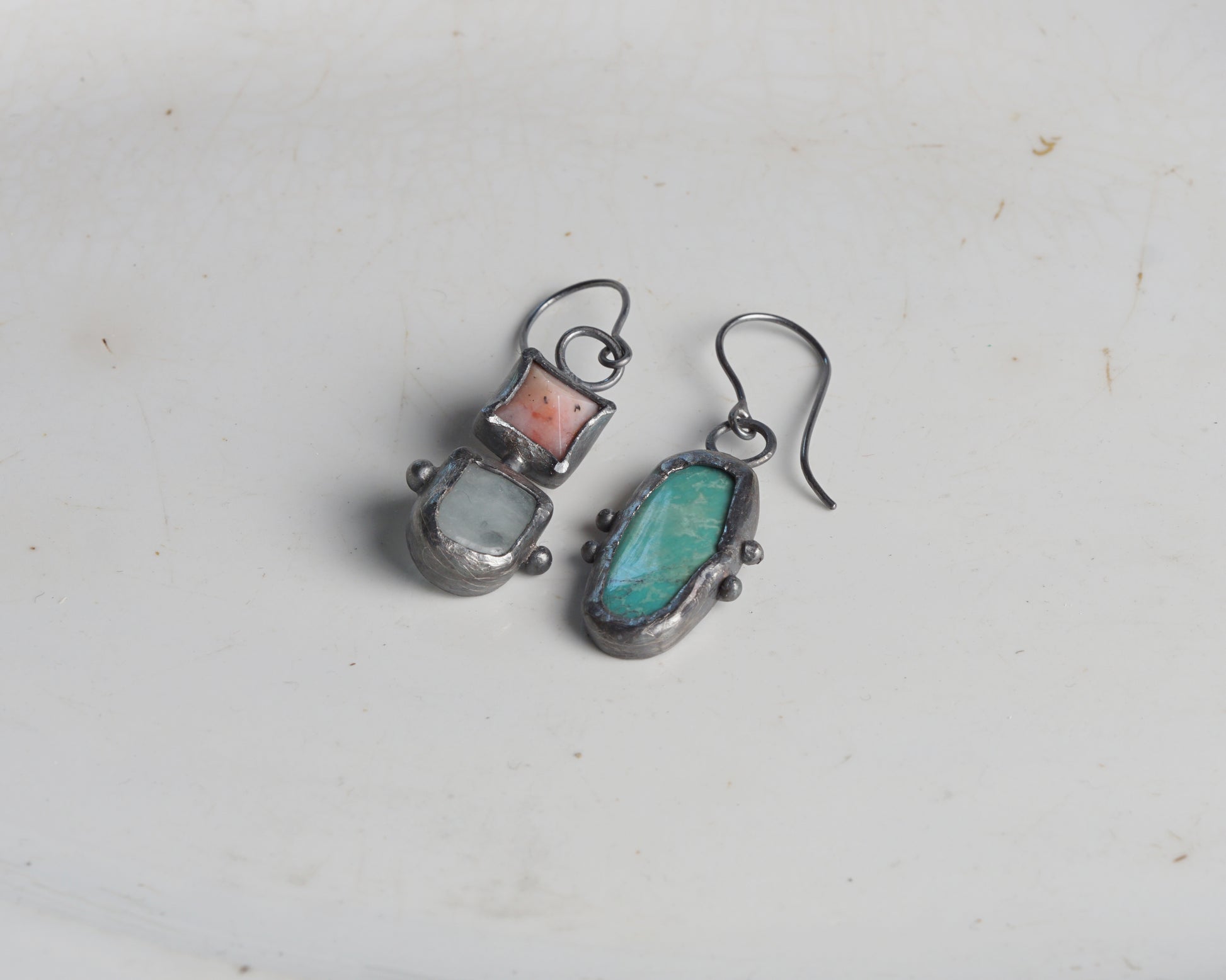 Summer Handcrafted Opal, Aquamarine & Turquoise Oxidized Silver Mismatched Earrings