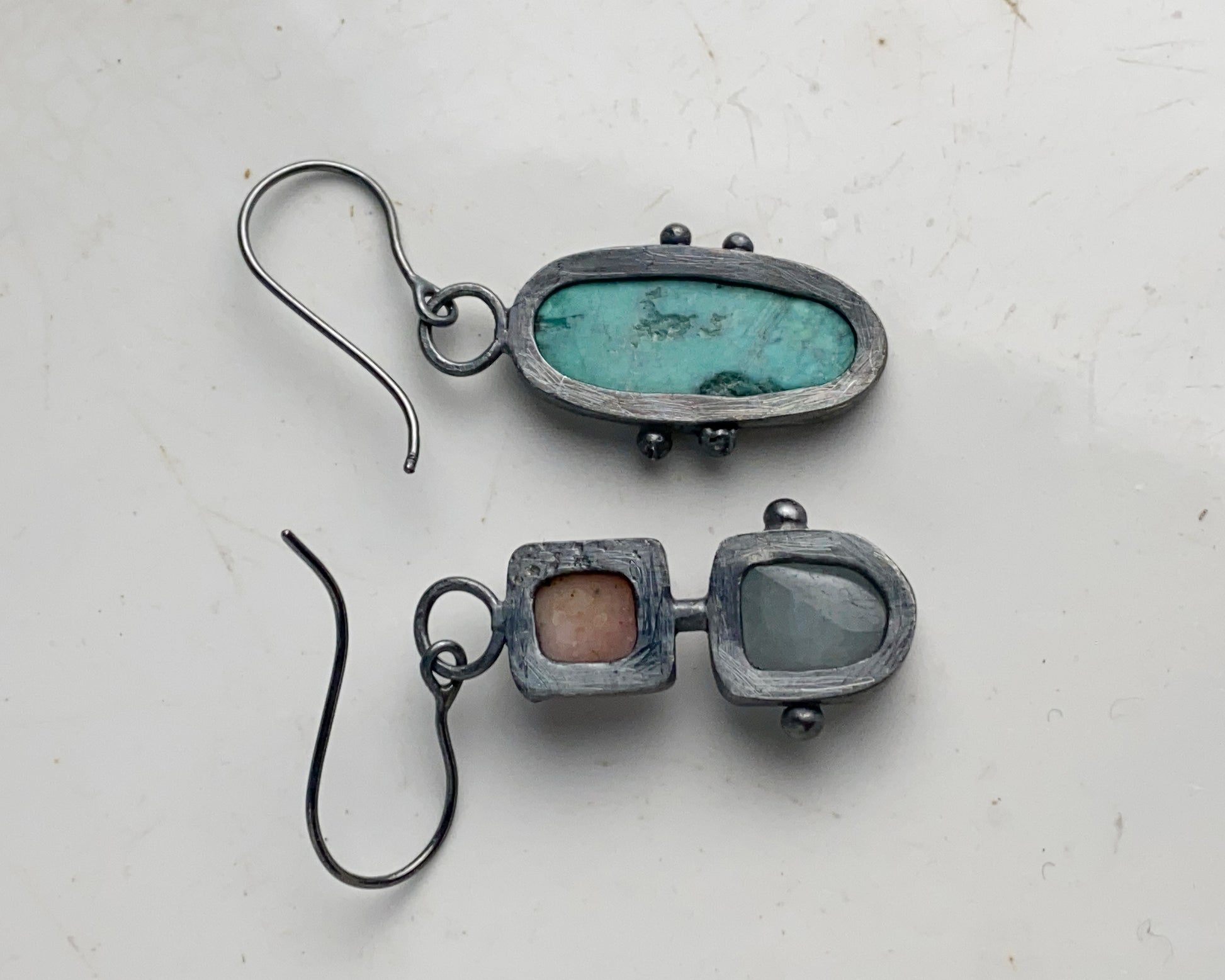 Handcrafted oxidized silver earrings featuring two distinct mineral combinations. One earring showcases a square opal above a soft-blue aquamarine, while the other displays an oval turquoise cabochon. The subtle dark patina of the oxidized silver frame enhances the natural hues of each stone, creating a balanced yet asymmetrical look ideal for everyday wear.