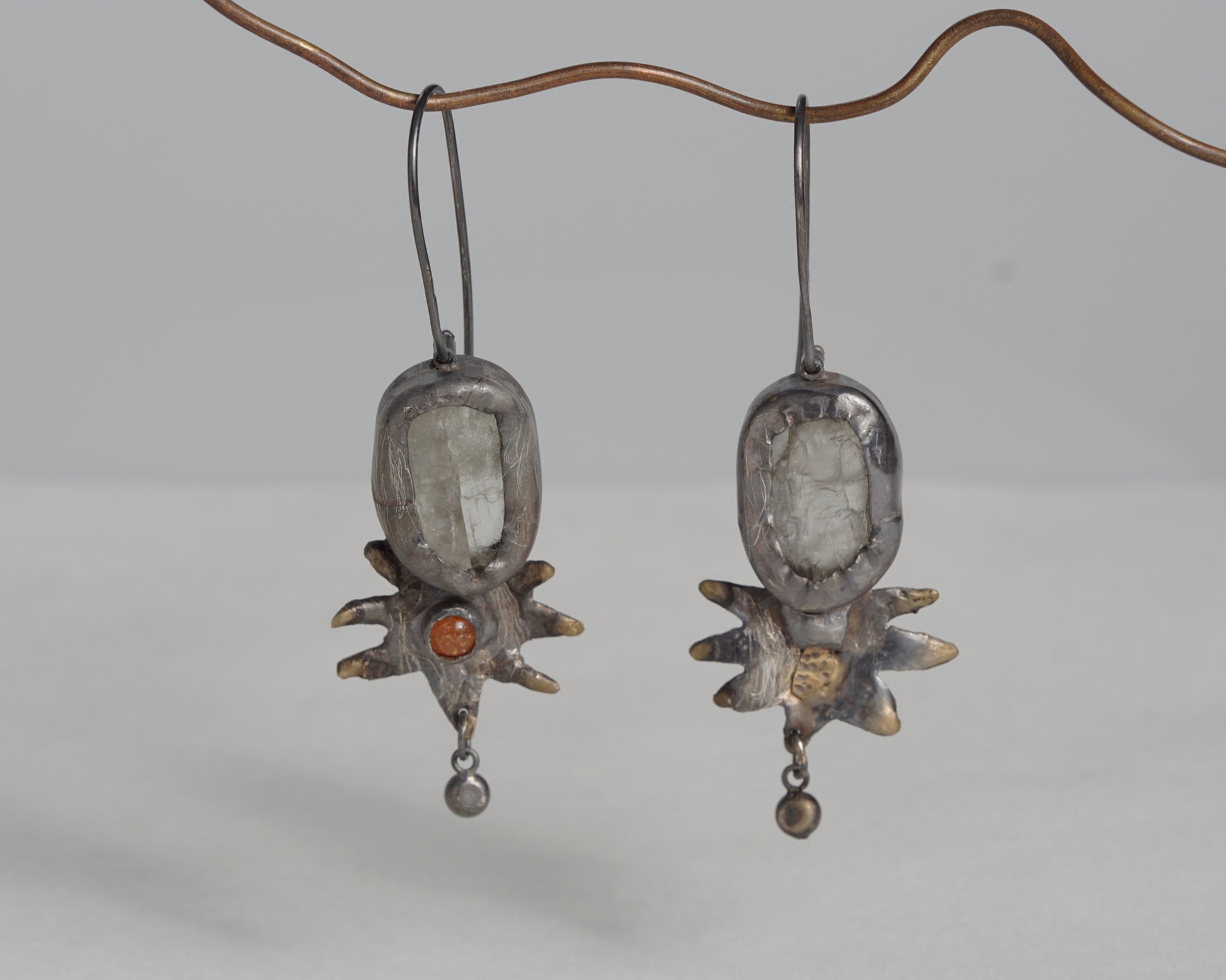 Handcrafted earrings made of oxidized silver with golden details. The stones featured are Sunstone and Kunzite, creating a striking contrast between warm and cool tones. The irregular, organic form gives each earring a sculptural character, making them a distinctive piece of wearable art.