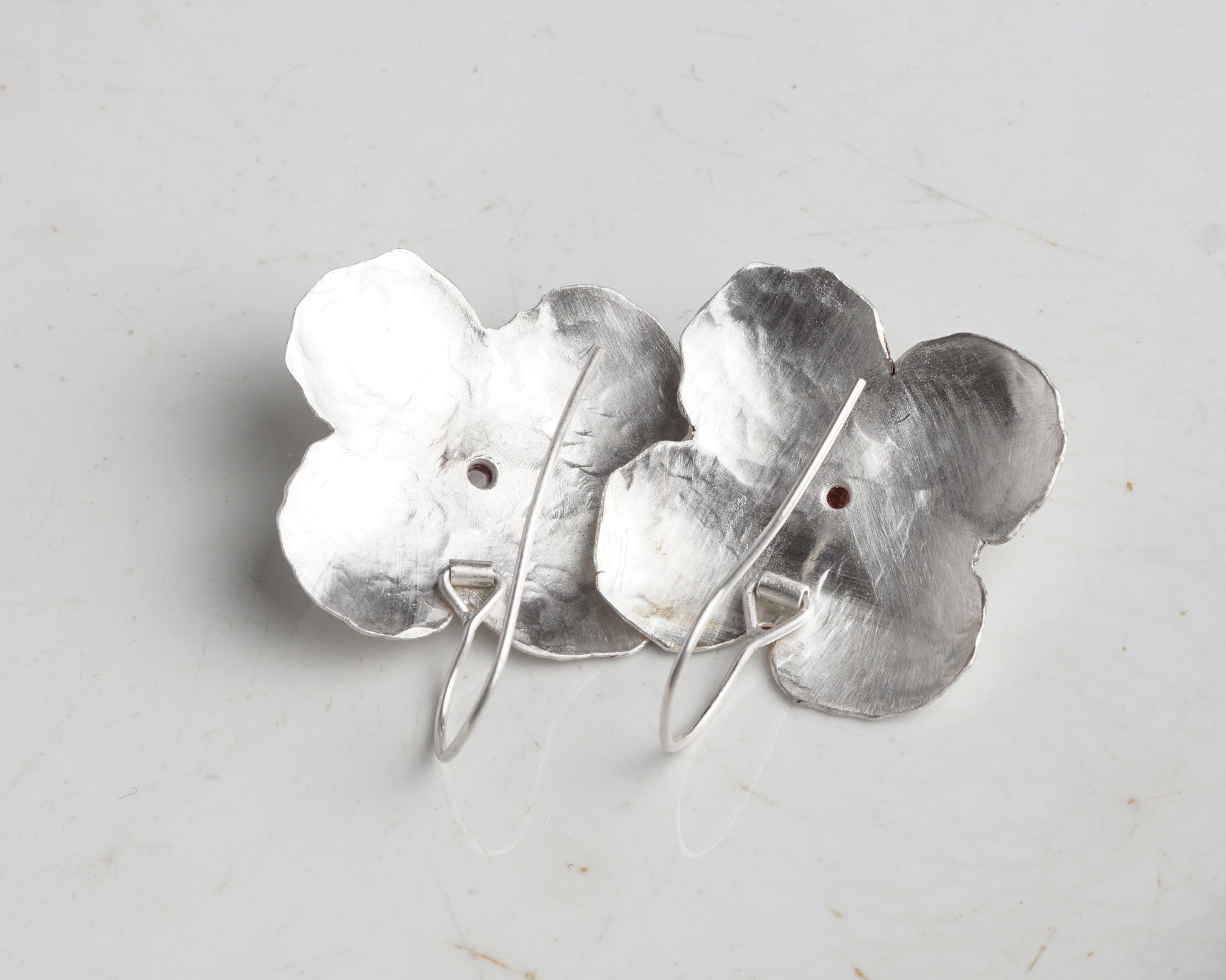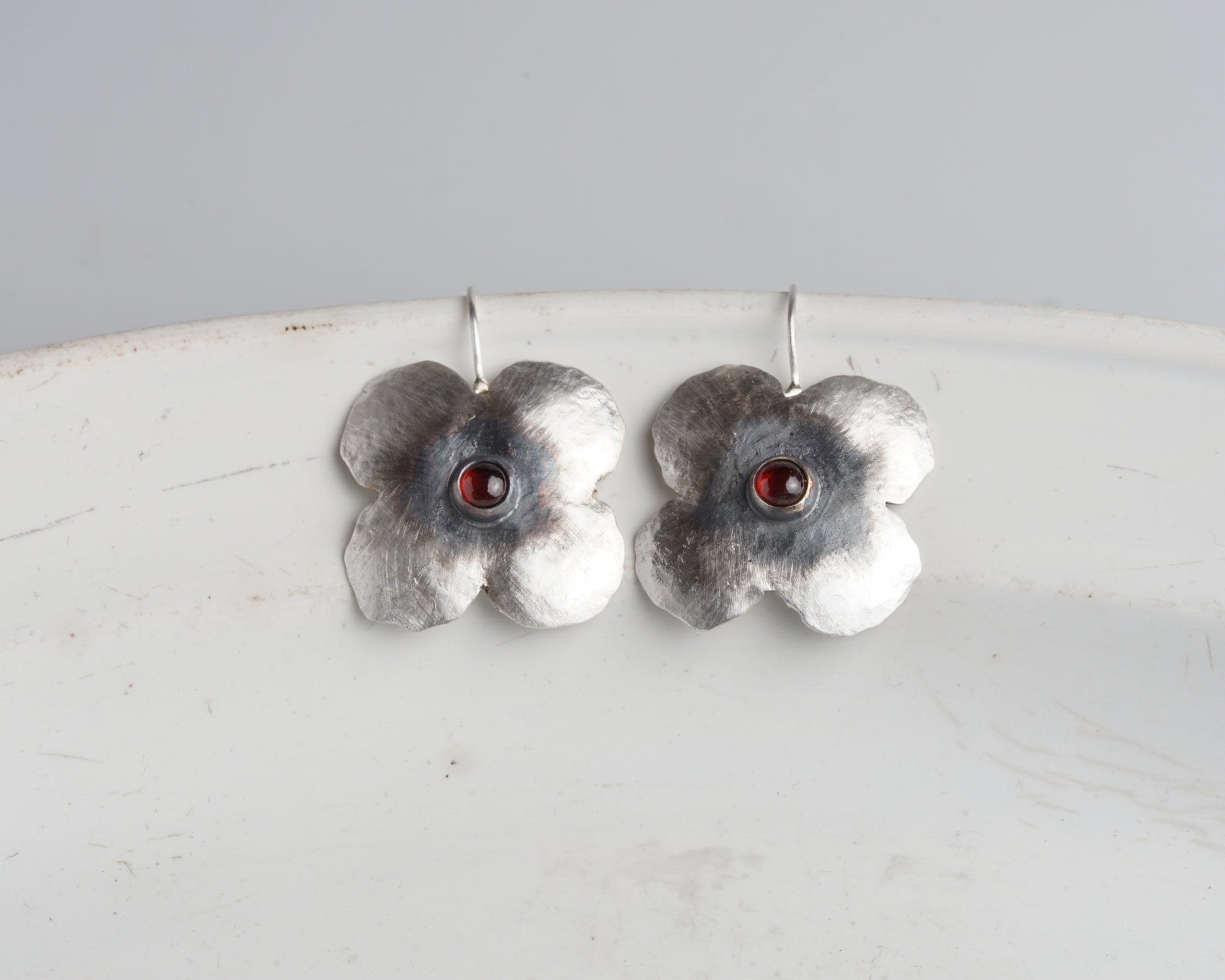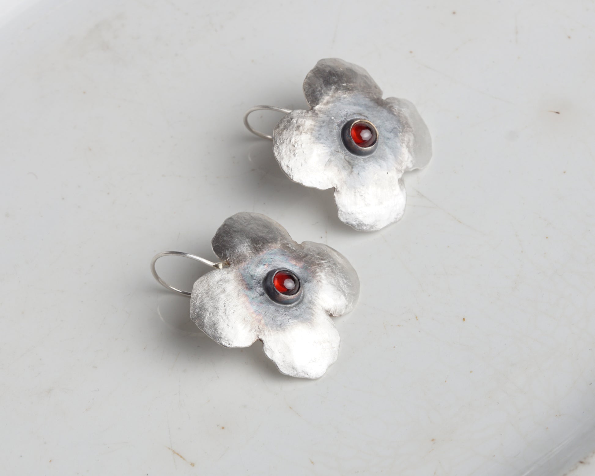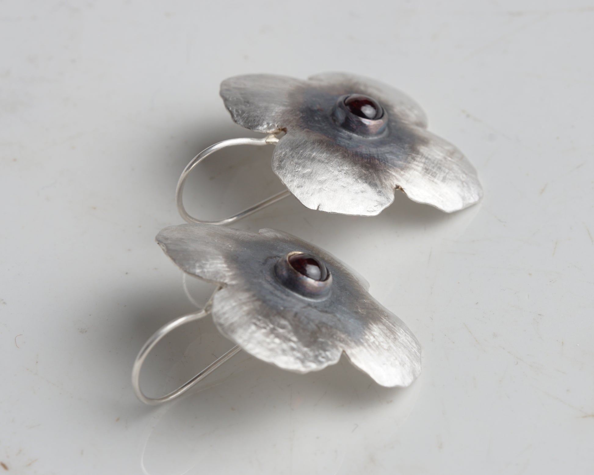 Handcrafted silver earrings in the shape of delicate blossoms. Each piece is forged by hand and set with a natural ruby at the center. The surface carries a subtle, textured finish that highlights the artisanal character of the work.