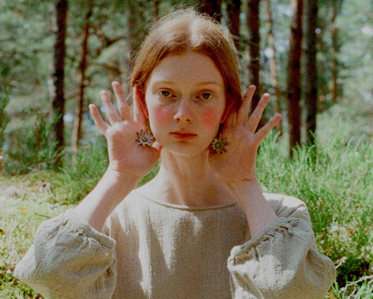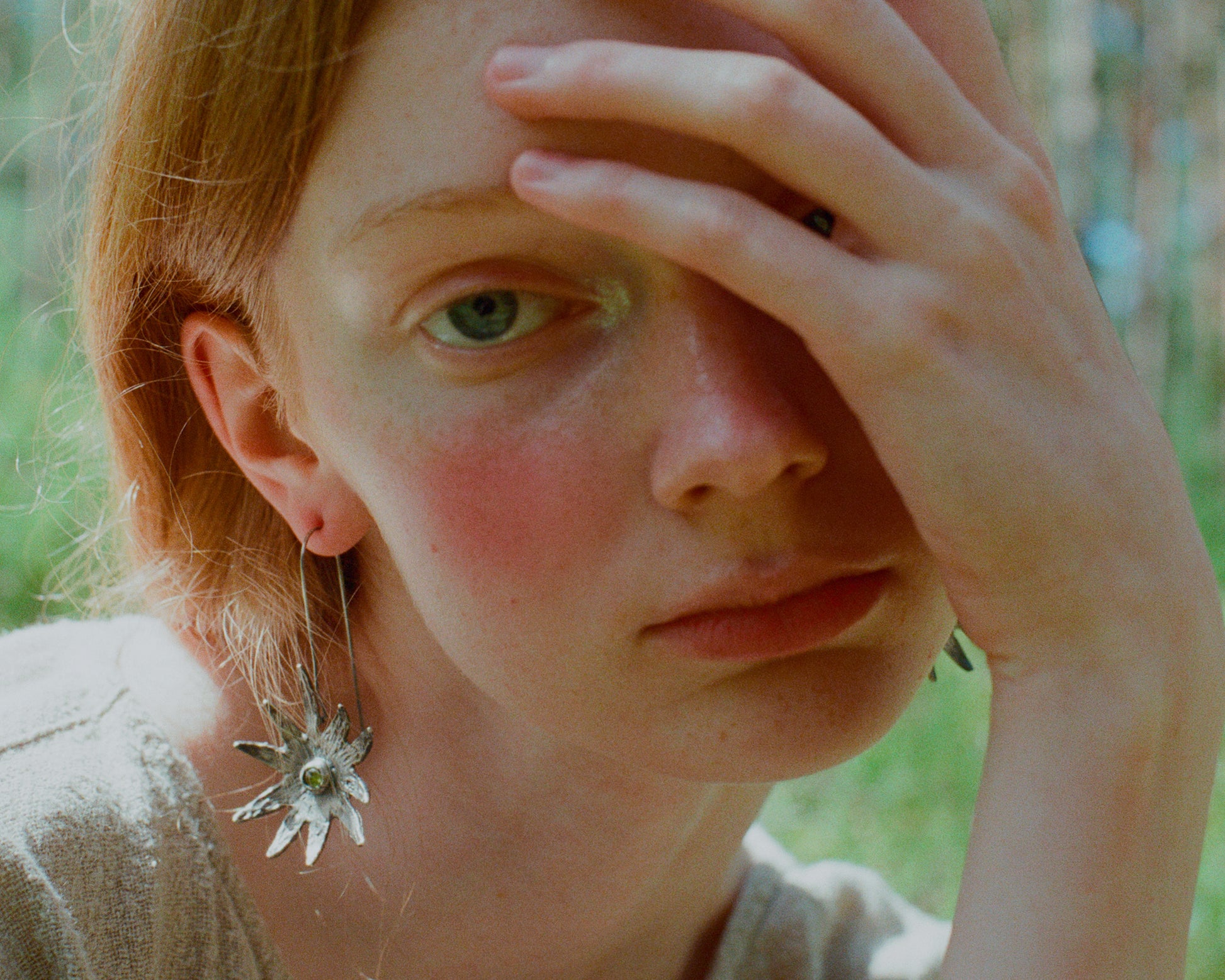 Sterling silver handcrafted earrings in the shape of a star or flower, with a bright green natural peridot stone in the center of each earring.