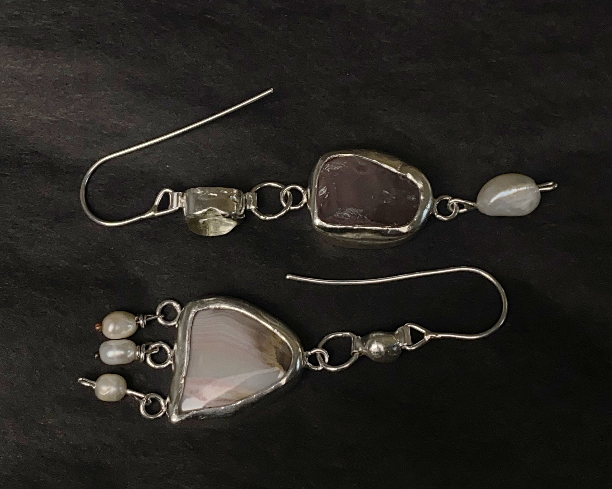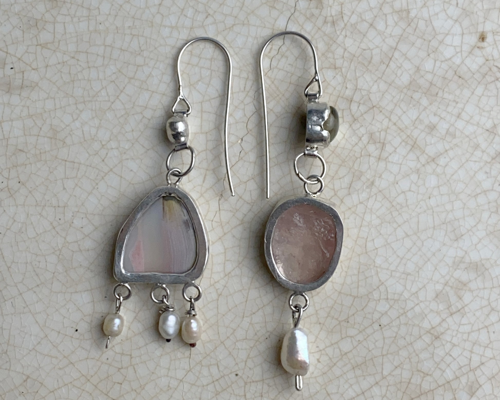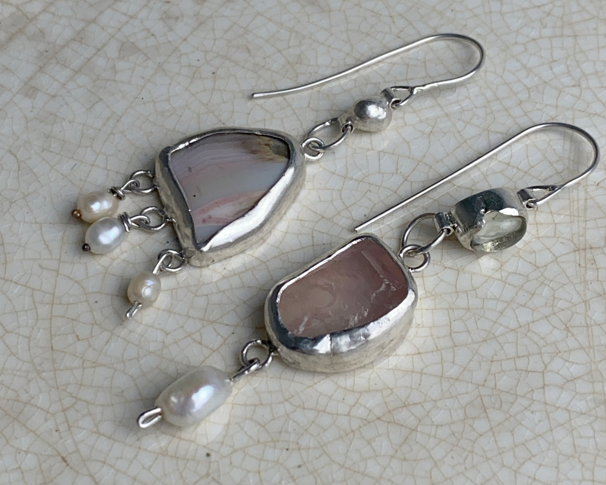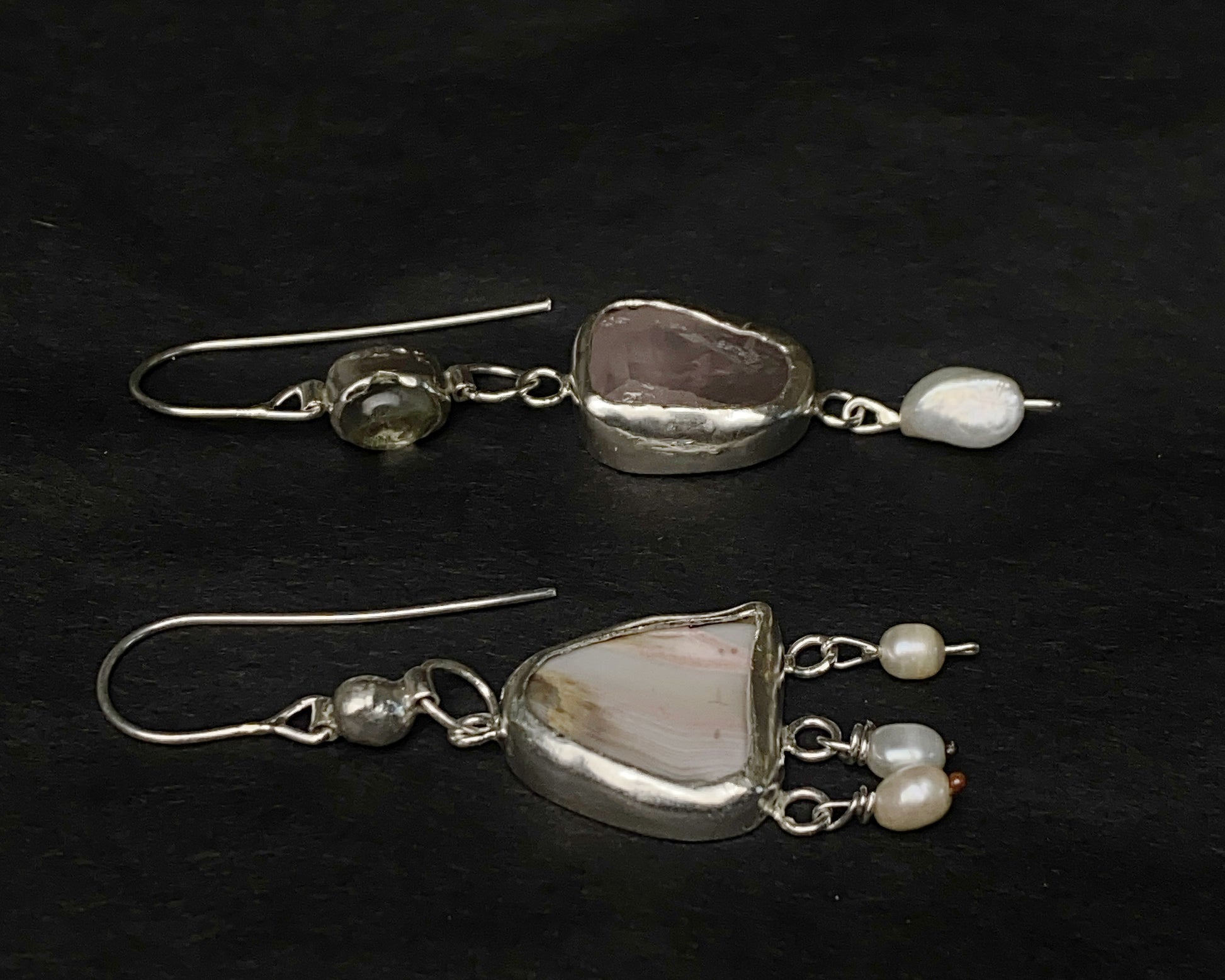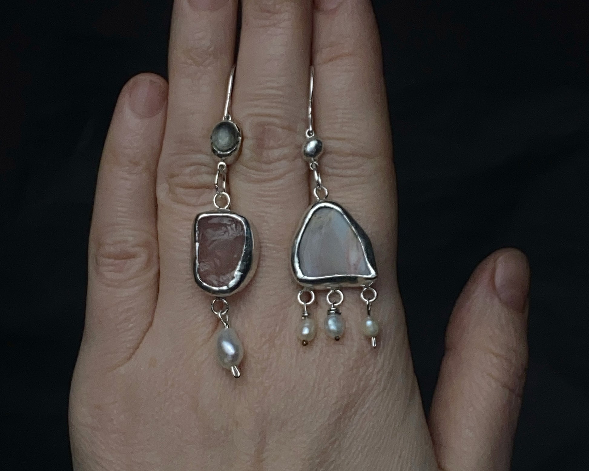 Sterling silver asymmetric dangle earrings featuring natural stones and pearls. Each piece is uniquely designed: one earring displays rose agate with a pearl drop, while the companion piece combines pink quartz with three delicate pearl dangles. White topaz accents add subtle sparkle to the top. All stones are set in handcrafted sterling silver bezels.