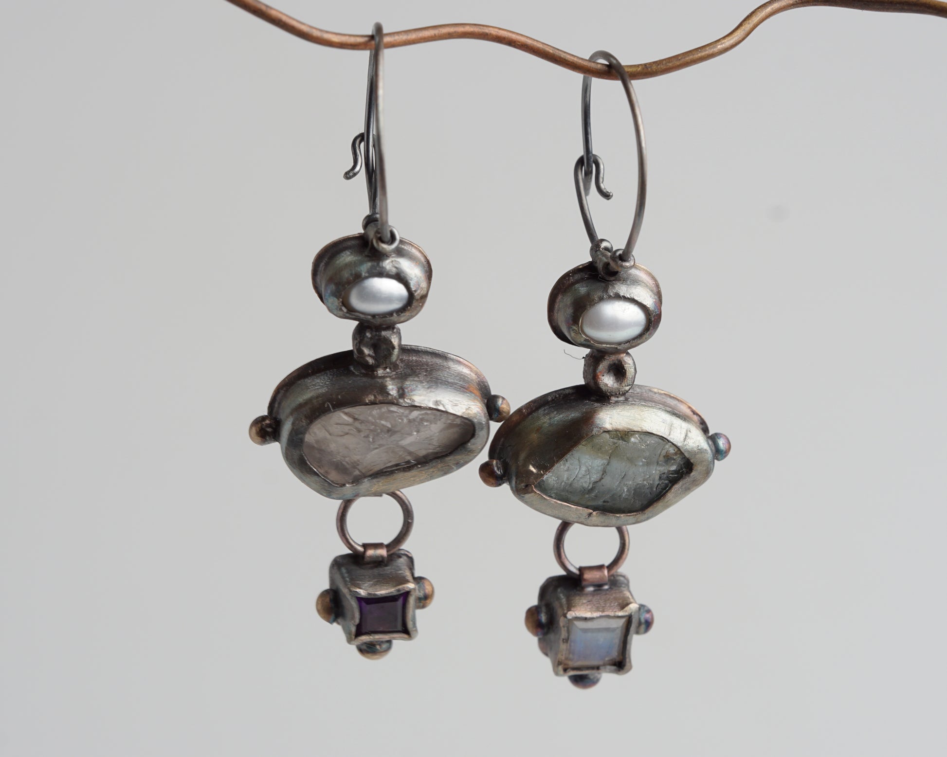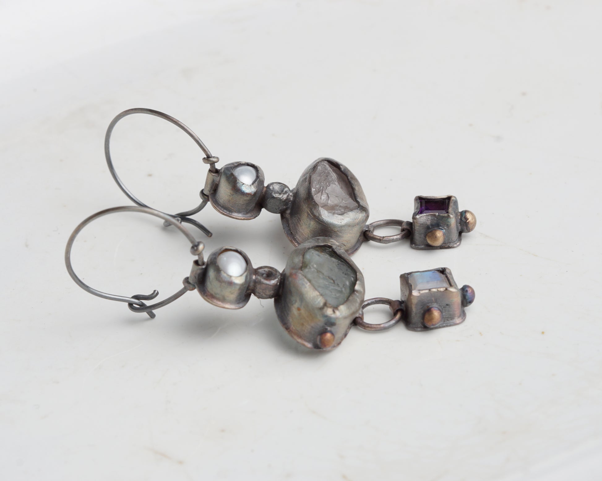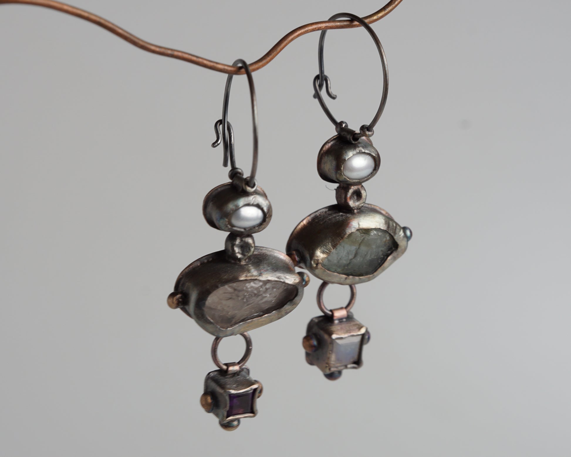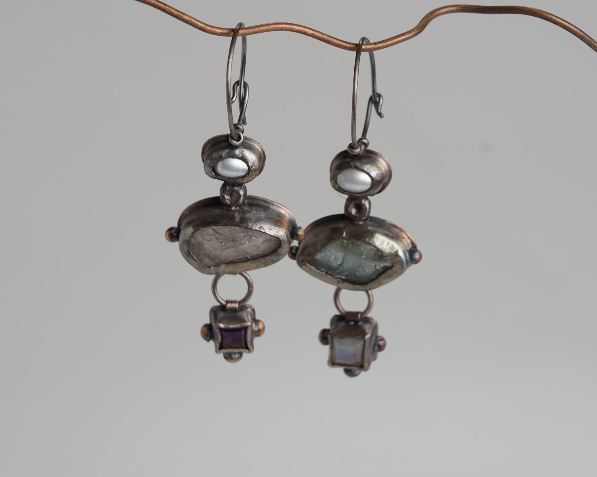 This handcrafted pair of earrings features an intentionally mismatched design. One earring is composed of aquamarine, moonstone, and a freshwater pearl. The other pairs rose quartz with amethyst and a matching freshwater pearl. Each stone is set in patinated silver, giving the earrings a raw, organic feel. Subtle asymmetry and natural gemstone textures highlight their handcrafted character.