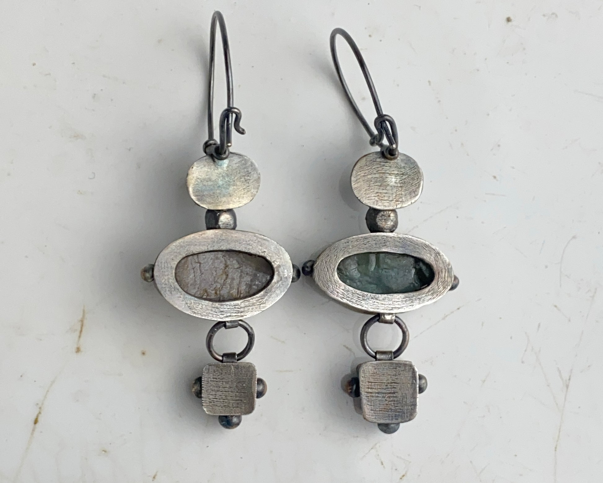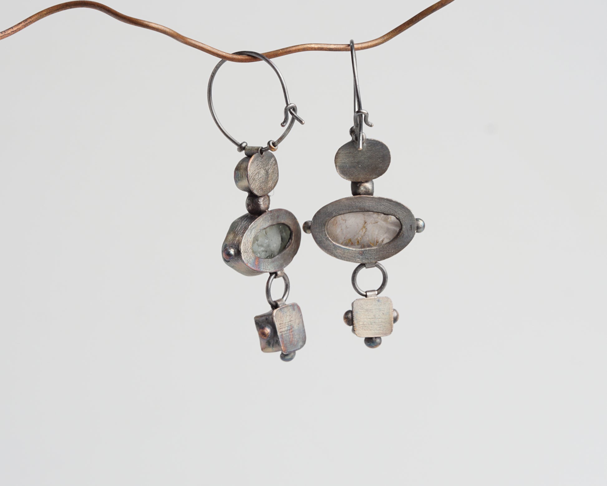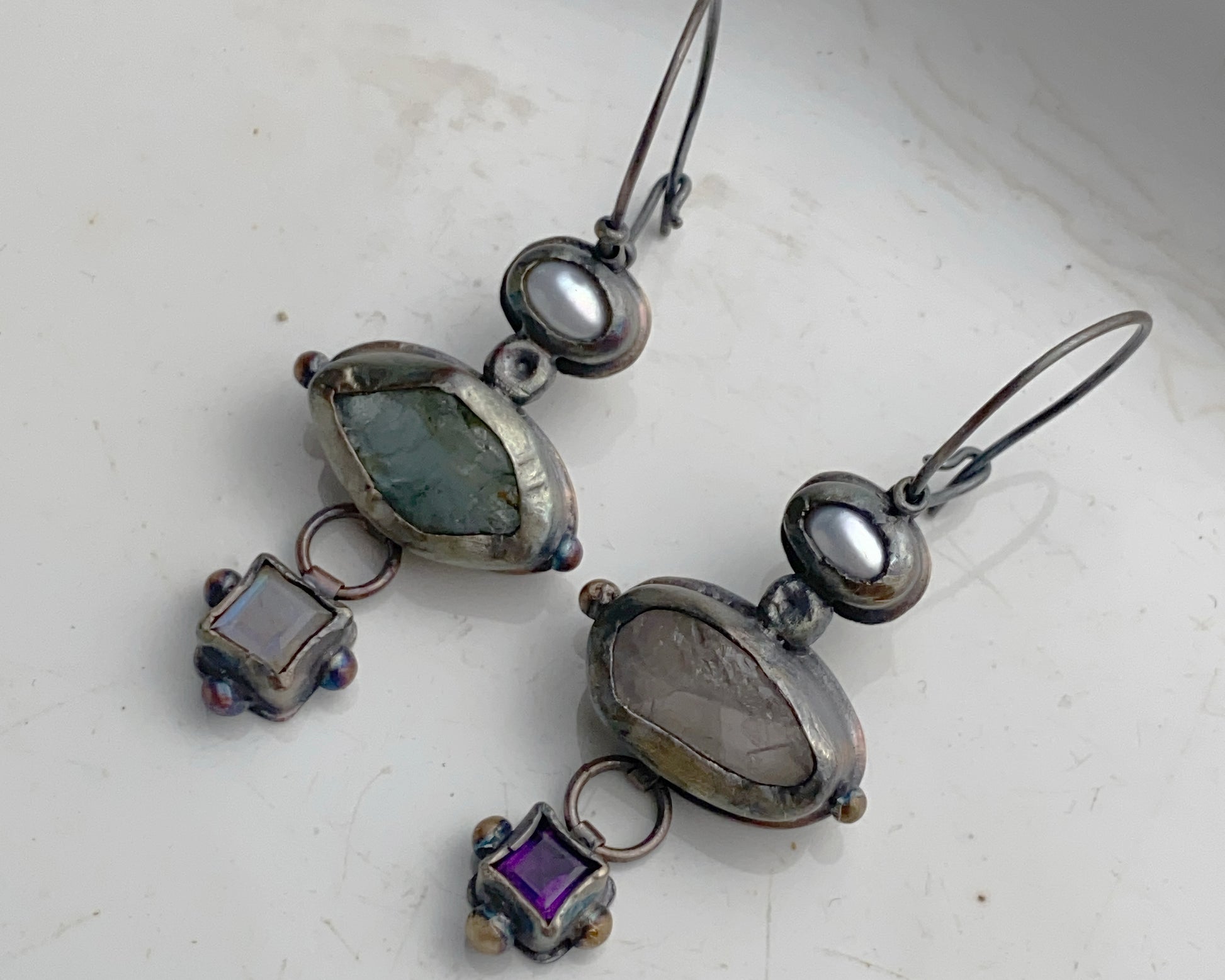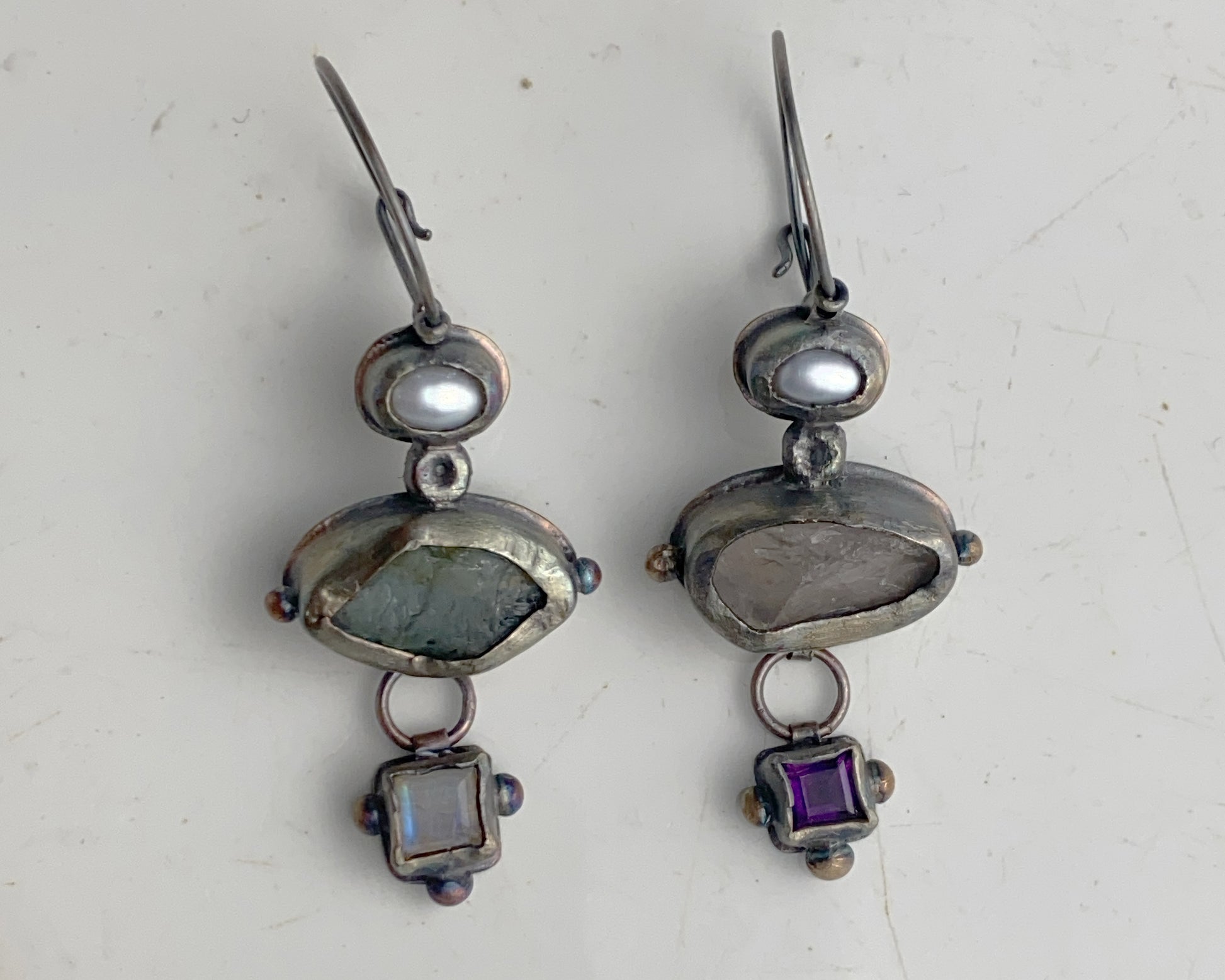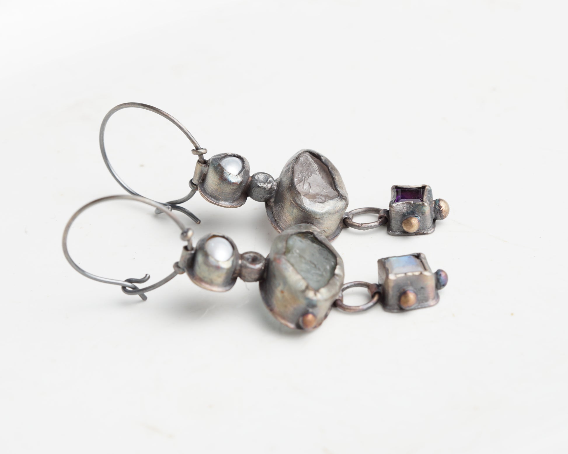 This handcrafted pair of earrings features an intentionally mismatched design. One earring is composed of aquamarine, moonstone, and a freshwater pearl. The other pairs rose quartz with amethyst and a matching freshwater pearl. Each stone is set in patinated silver, giving the earrings a raw, organic feel. Subtle asymmetry and natural gemstone textures highlight their handcrafted character.