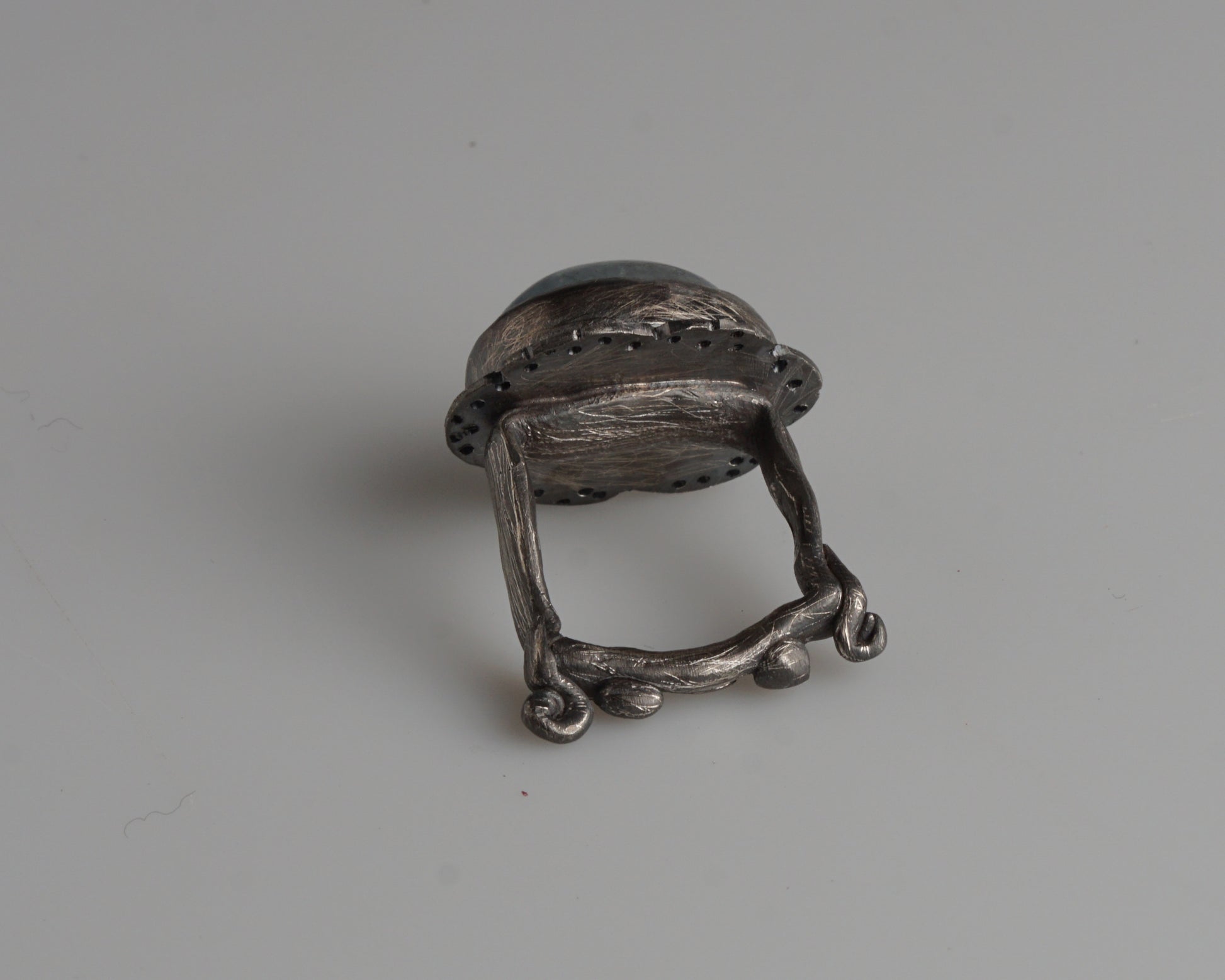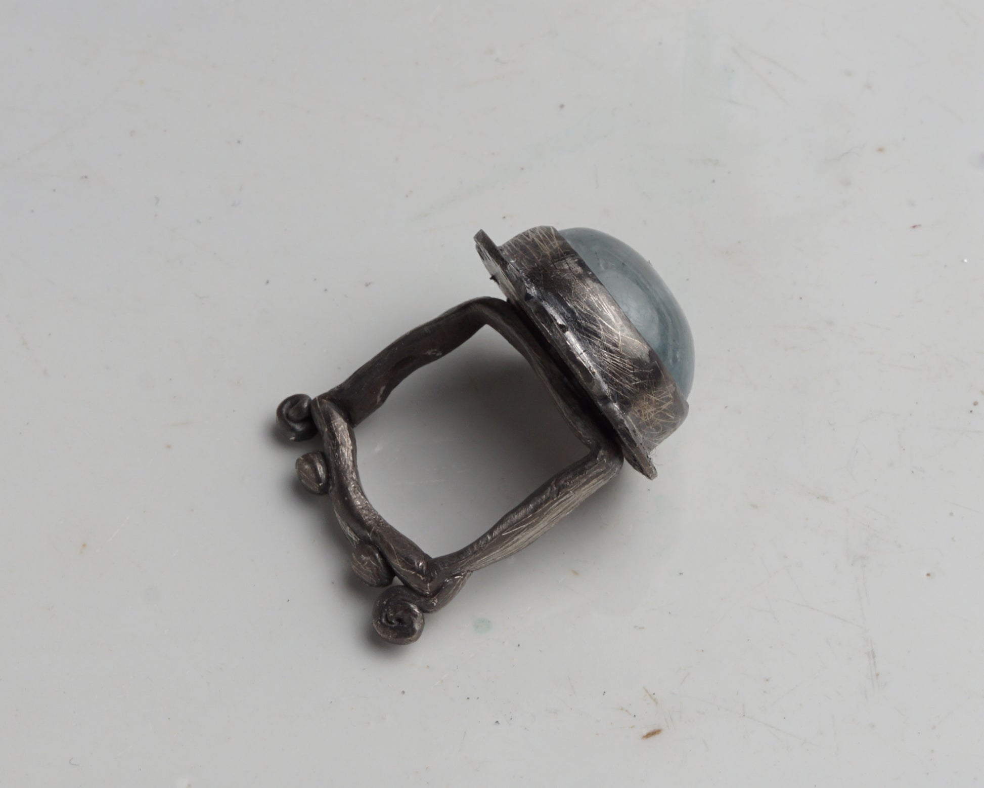 A handcrafted silver ring set with a translucent aquamarine cabochon. The piece is made from oxidized sterling silver, featuring an organic, scratched texture. The design is finished with a unique, square-shaped band accented by small scroll details at the base.