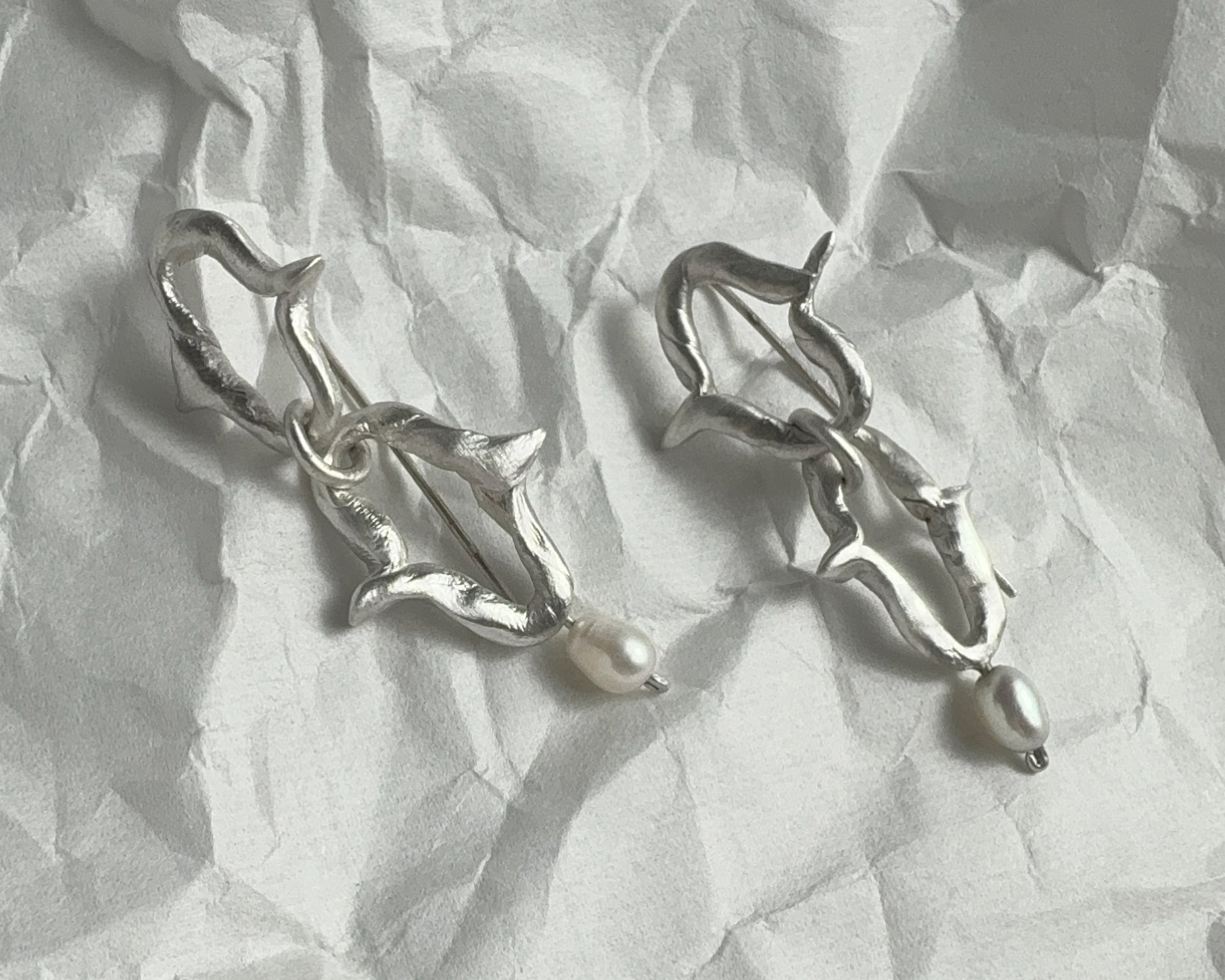 Handcrafted silver earrings composed of sculpted linked elements, finished with a small freshwater pearl at the bottom. The surface has a matte texture, and the earrings are fitted with a comfortable hook.