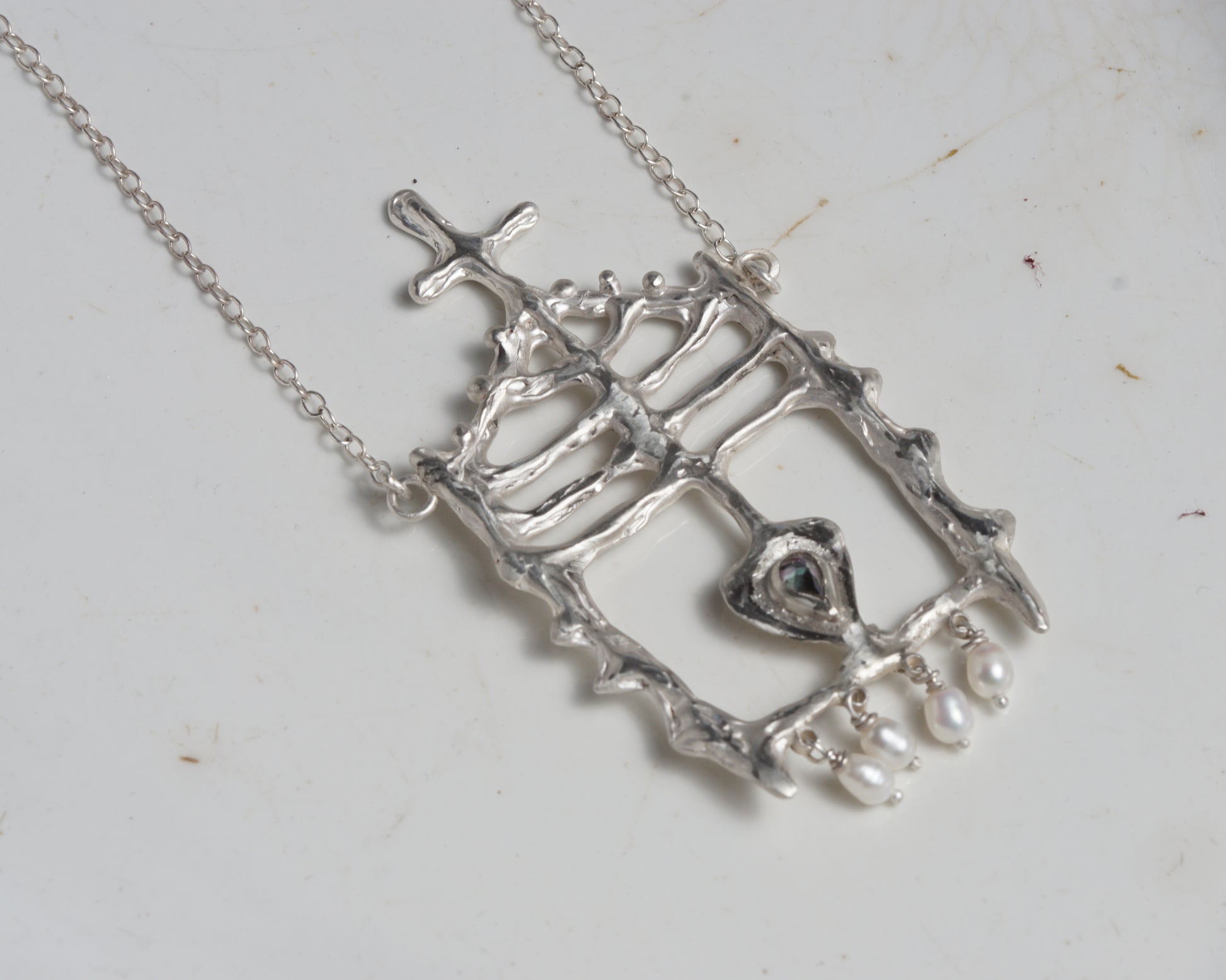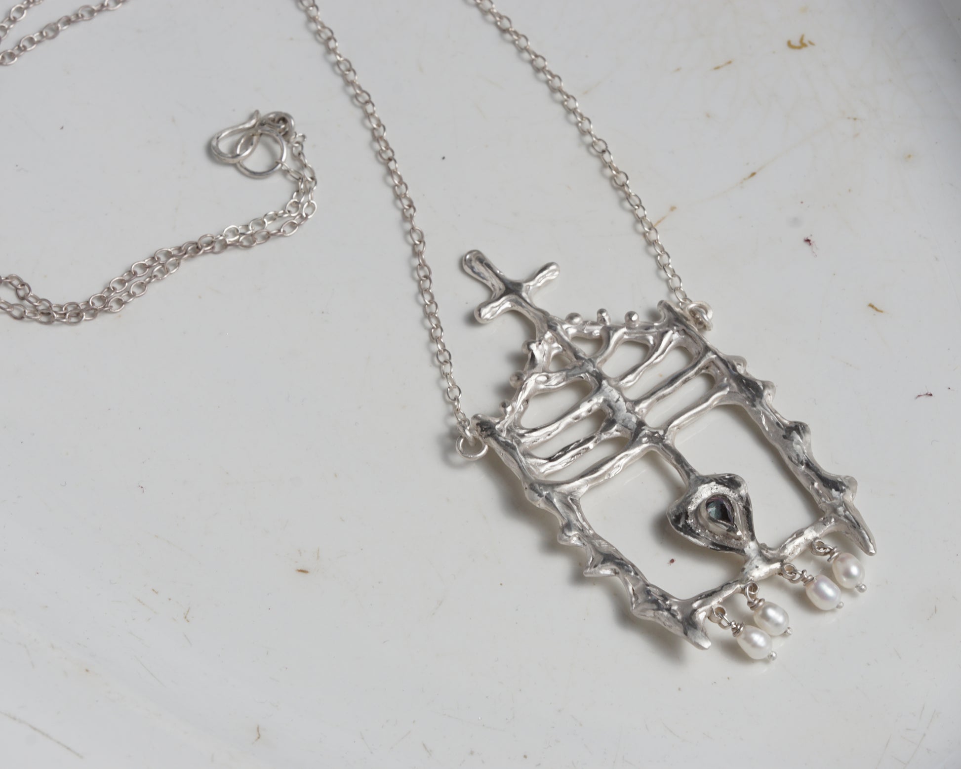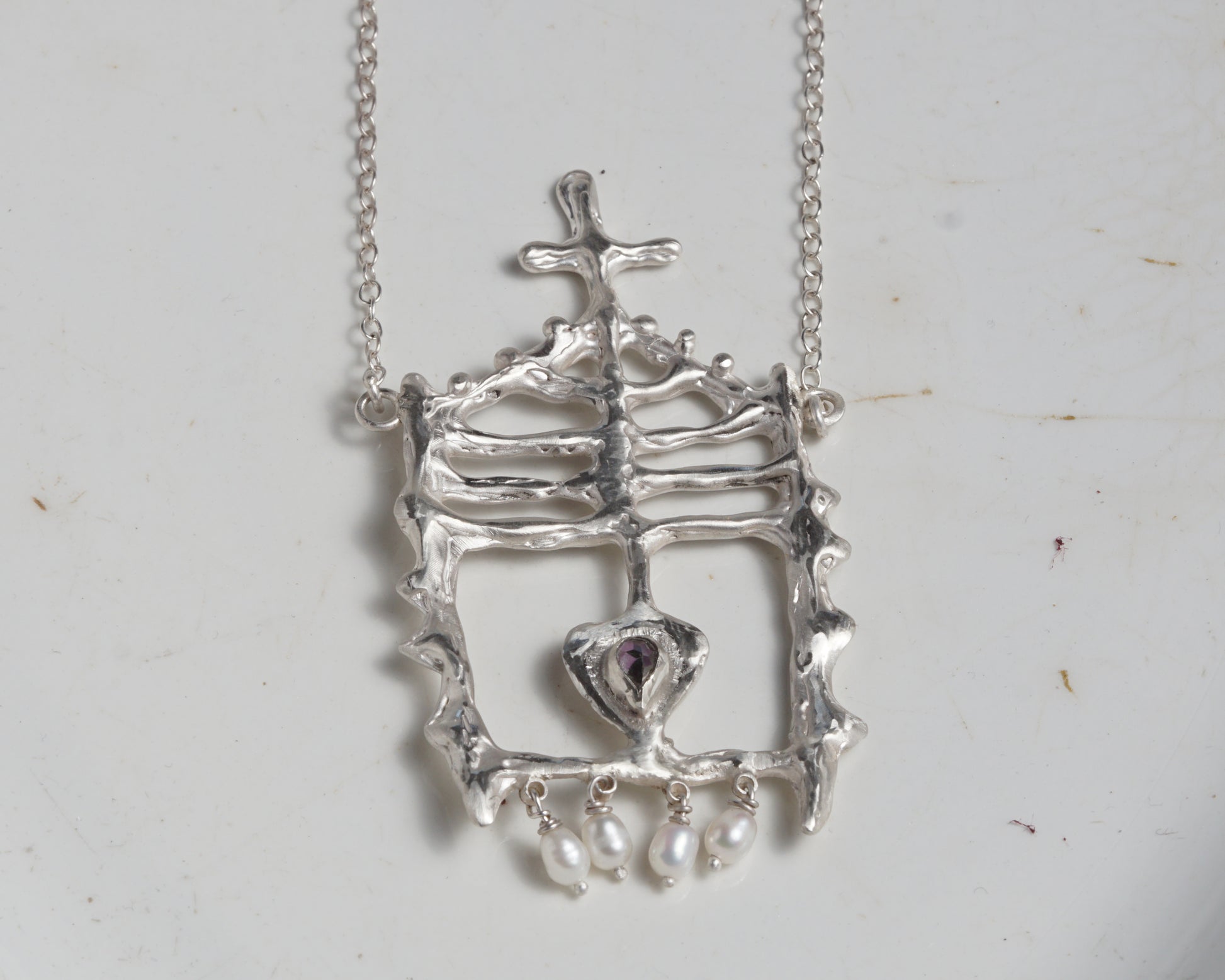 Handcrafted silver necklace featuring an openwork pendant shaped as an architectural frame with a cross at the top. The pendant is adorned with a Mystical Topaz in a heart-shaped bezel at the center, with four freshwater pearls suspended below. This one-of-a-kind piece.