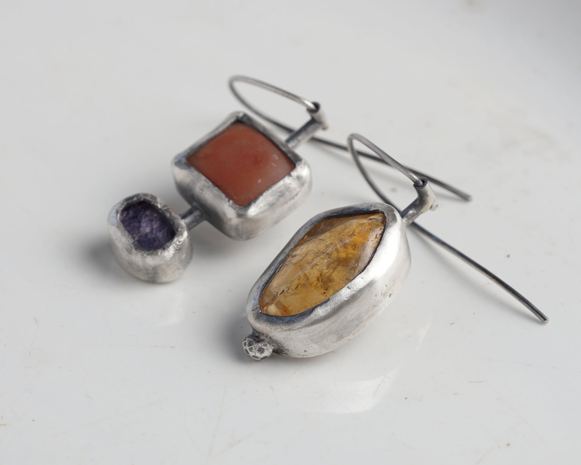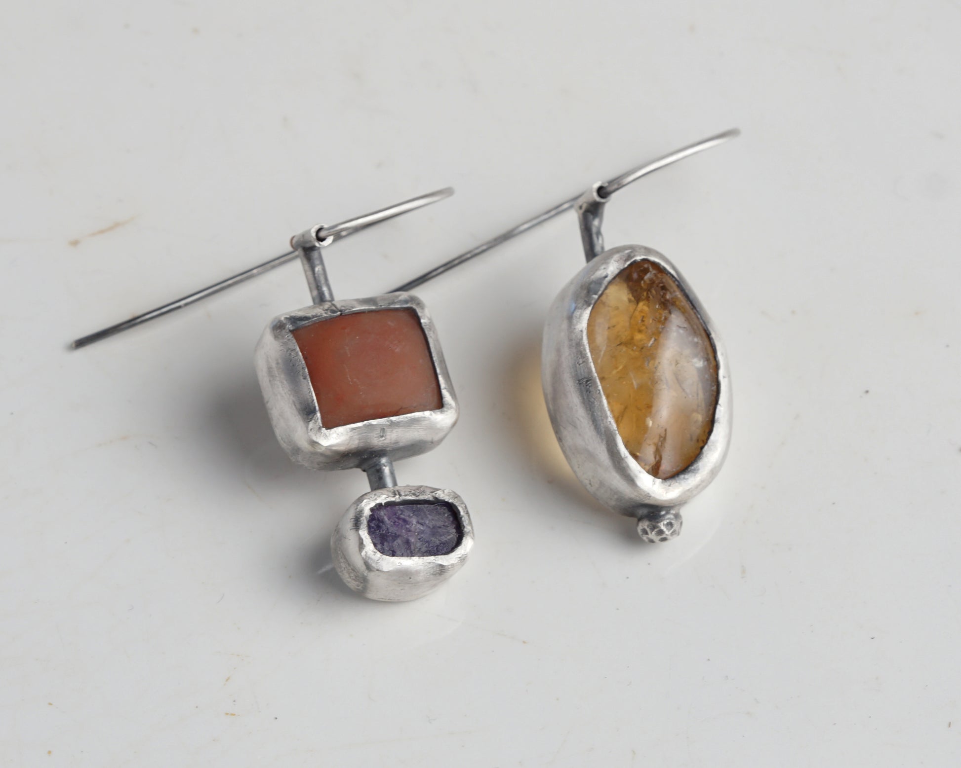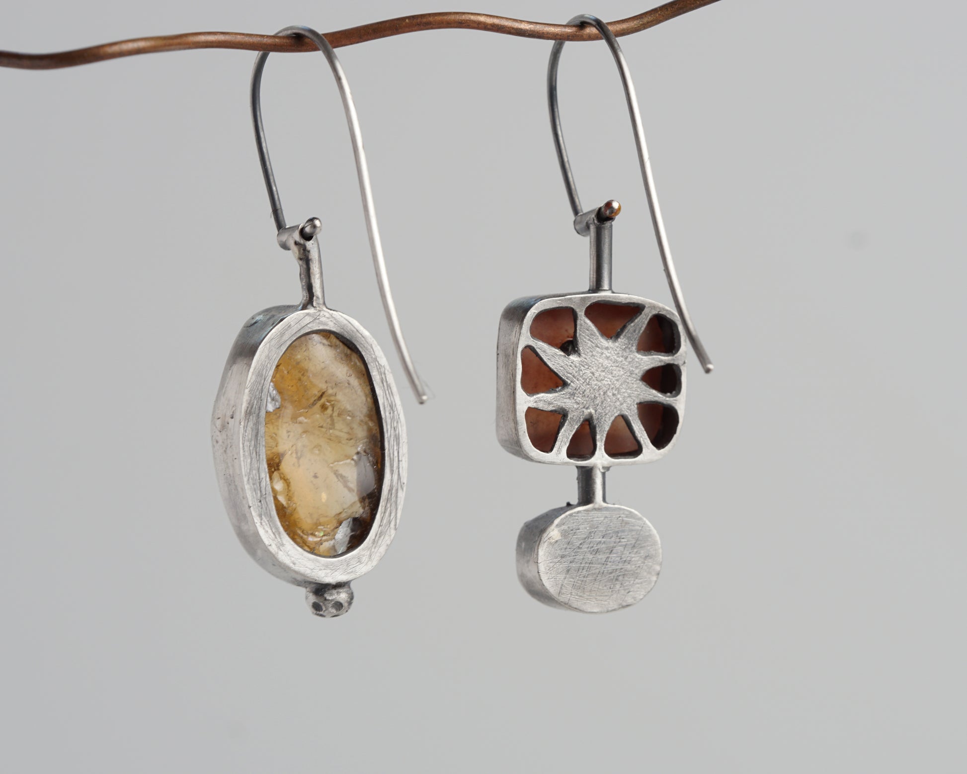 Sterling silver asymmetric earrings featuring natural gemstones. One earring showcases a warm carnelian stone, while its companion combines chalcedony and sapphire. The unique geometric star pattern adorns the reverse side, adding architectural interest to the design. Each stone is carefully set in hand-crafted silver bezels, creating a harmonious blend of organic and geometric forms.