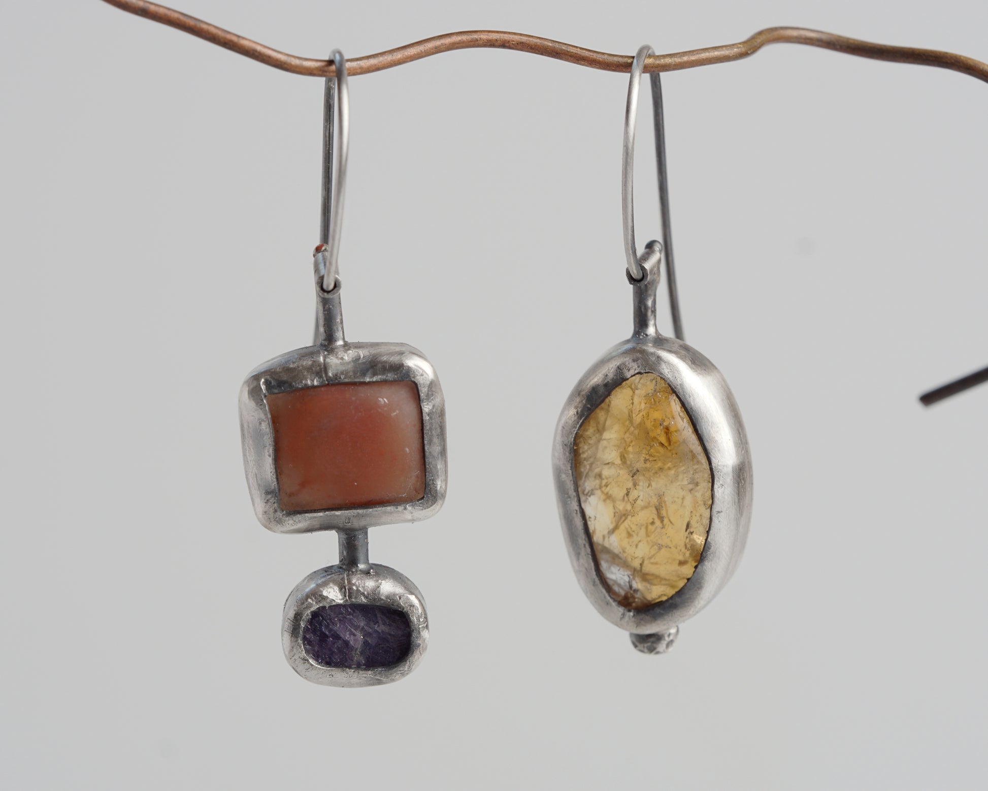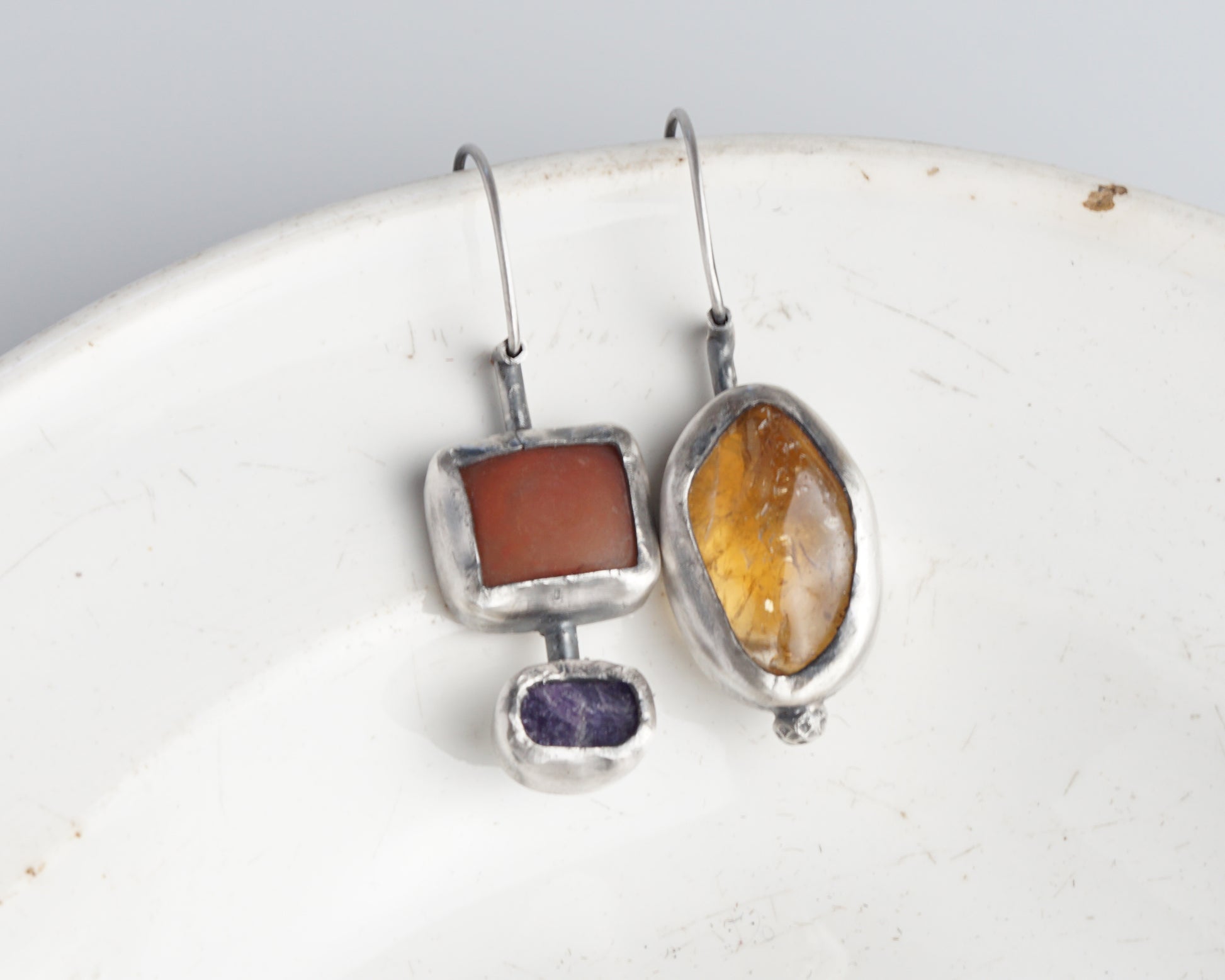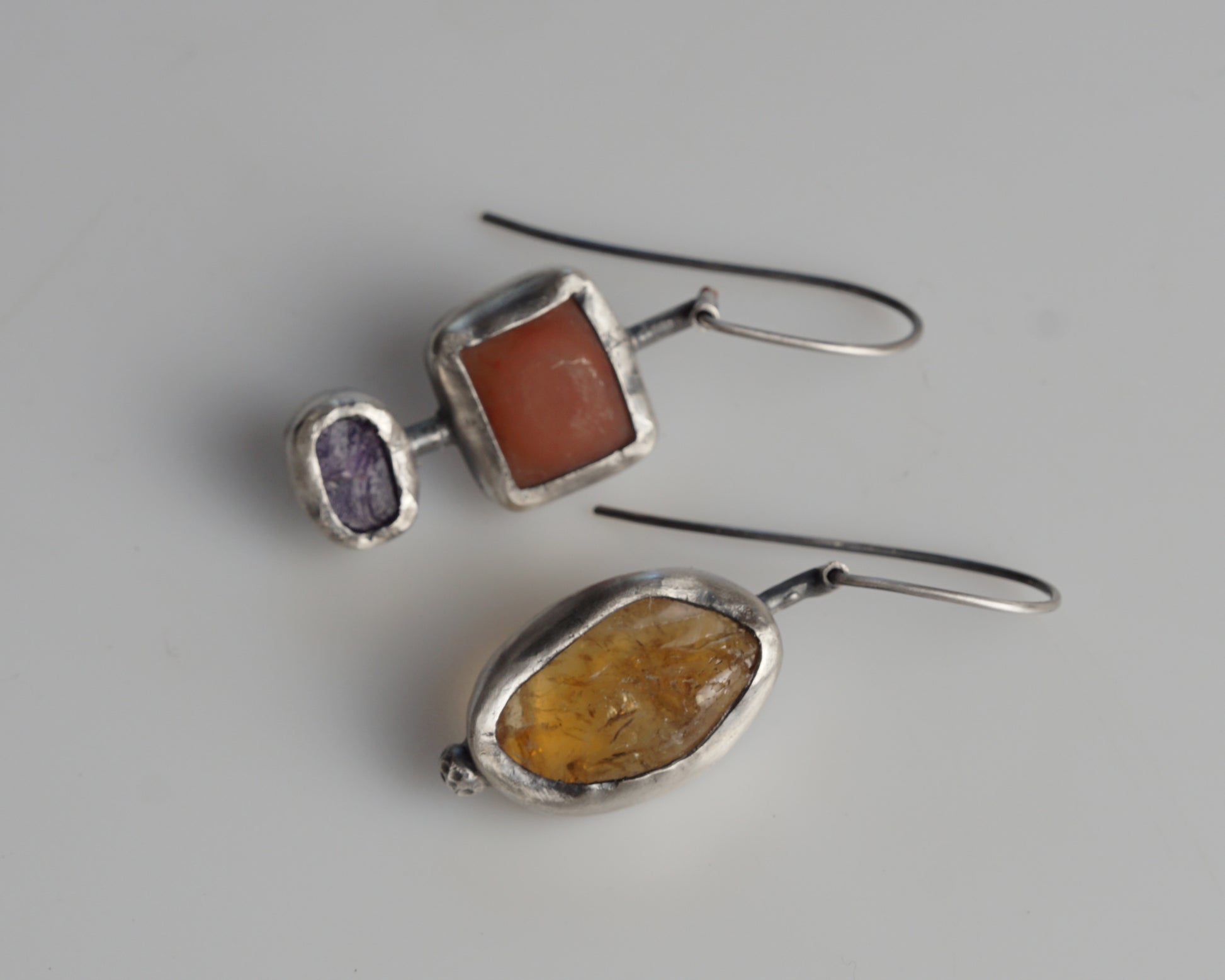 Sterling silver asymmetric earrings featuring natural gemstones. One earring showcases a warm carnelian stone, while its companion combines chalcedony and sapphire. The unique geometric star pattern adorns the reverse side, adding architectural interest to the design. Each stone is carefully set in hand-crafted silver bezels, creating a harmonious blend of organic and geometric forms.