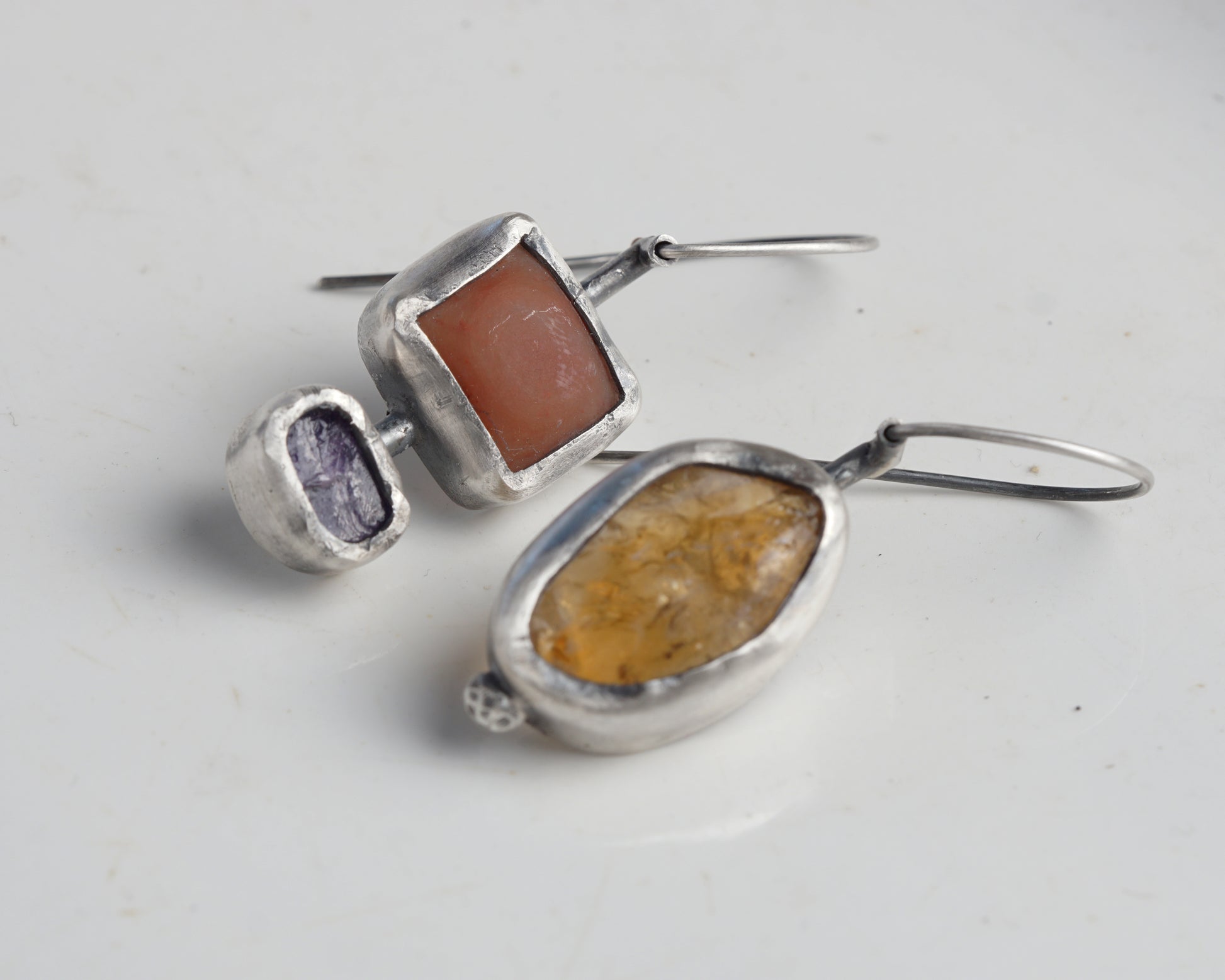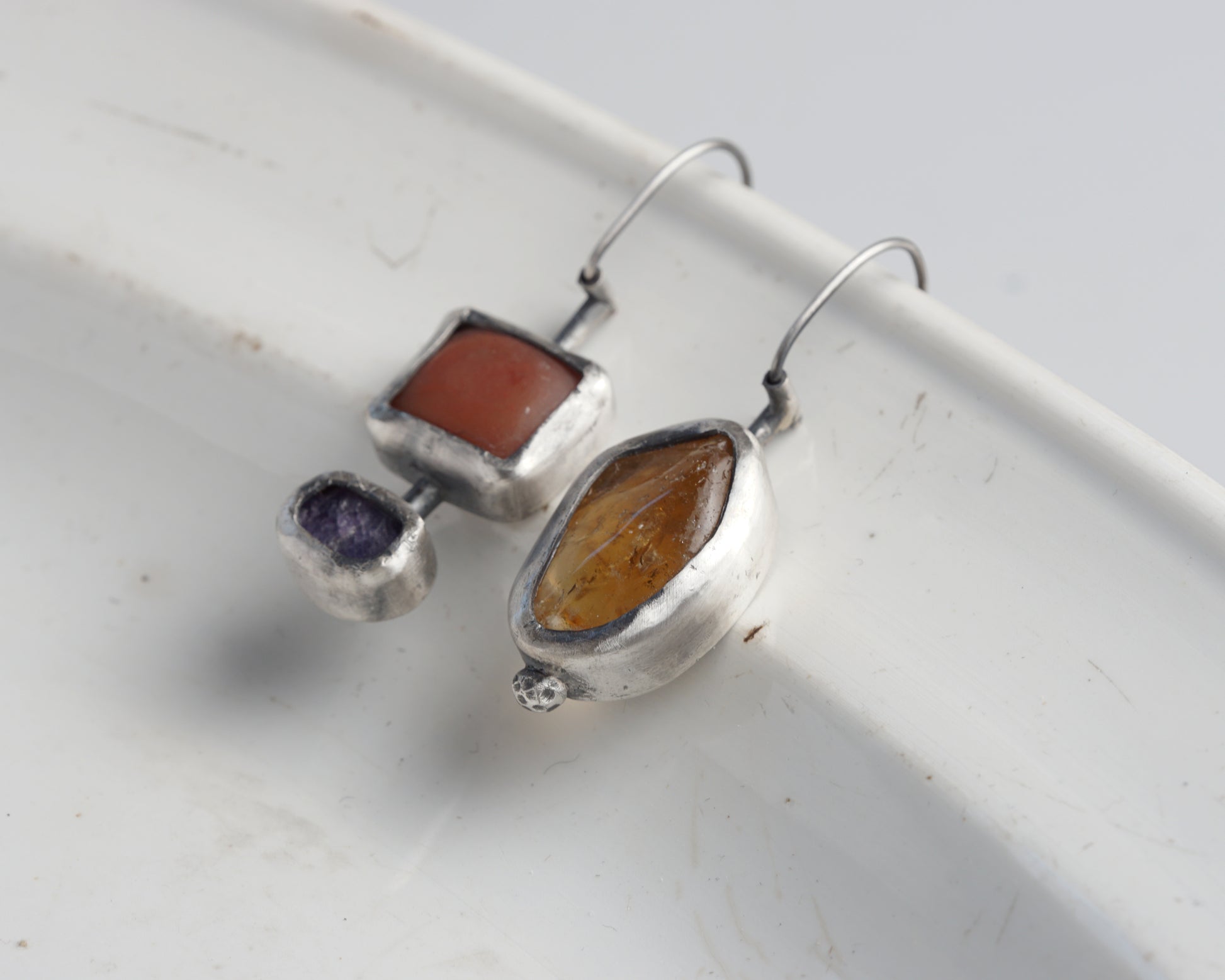 Sterling Silver Carnelian Chalcedony Sapphire Asymmetrical Earrings