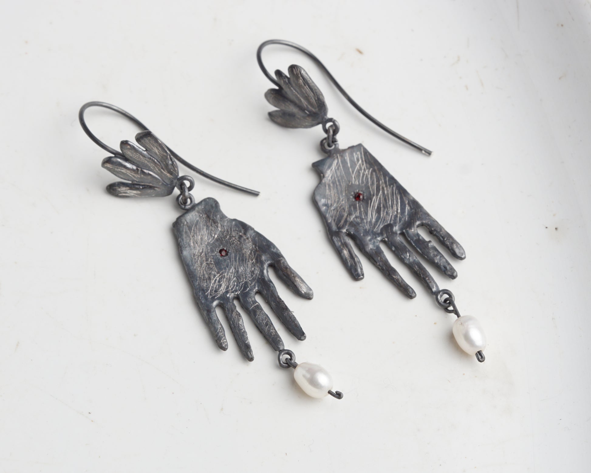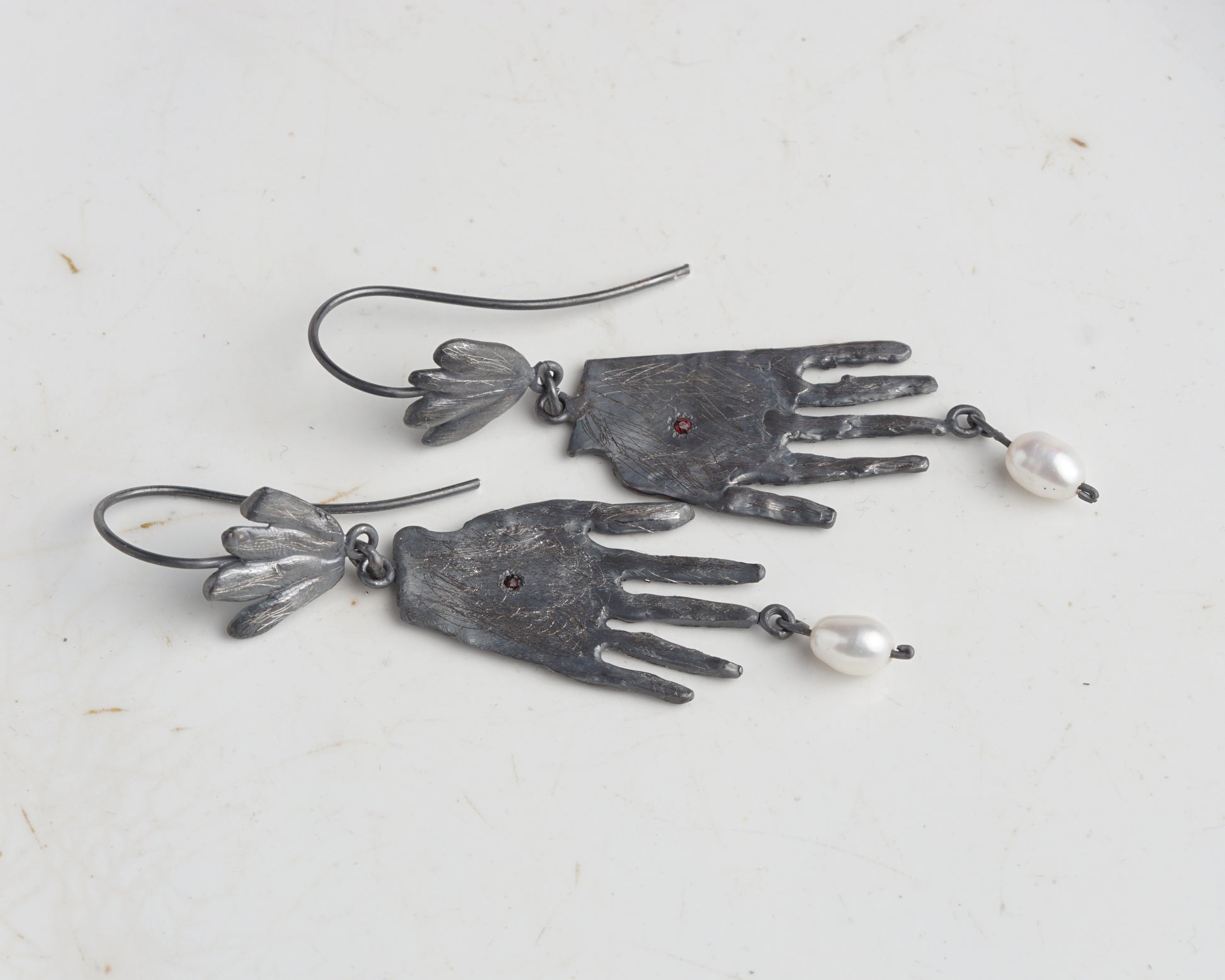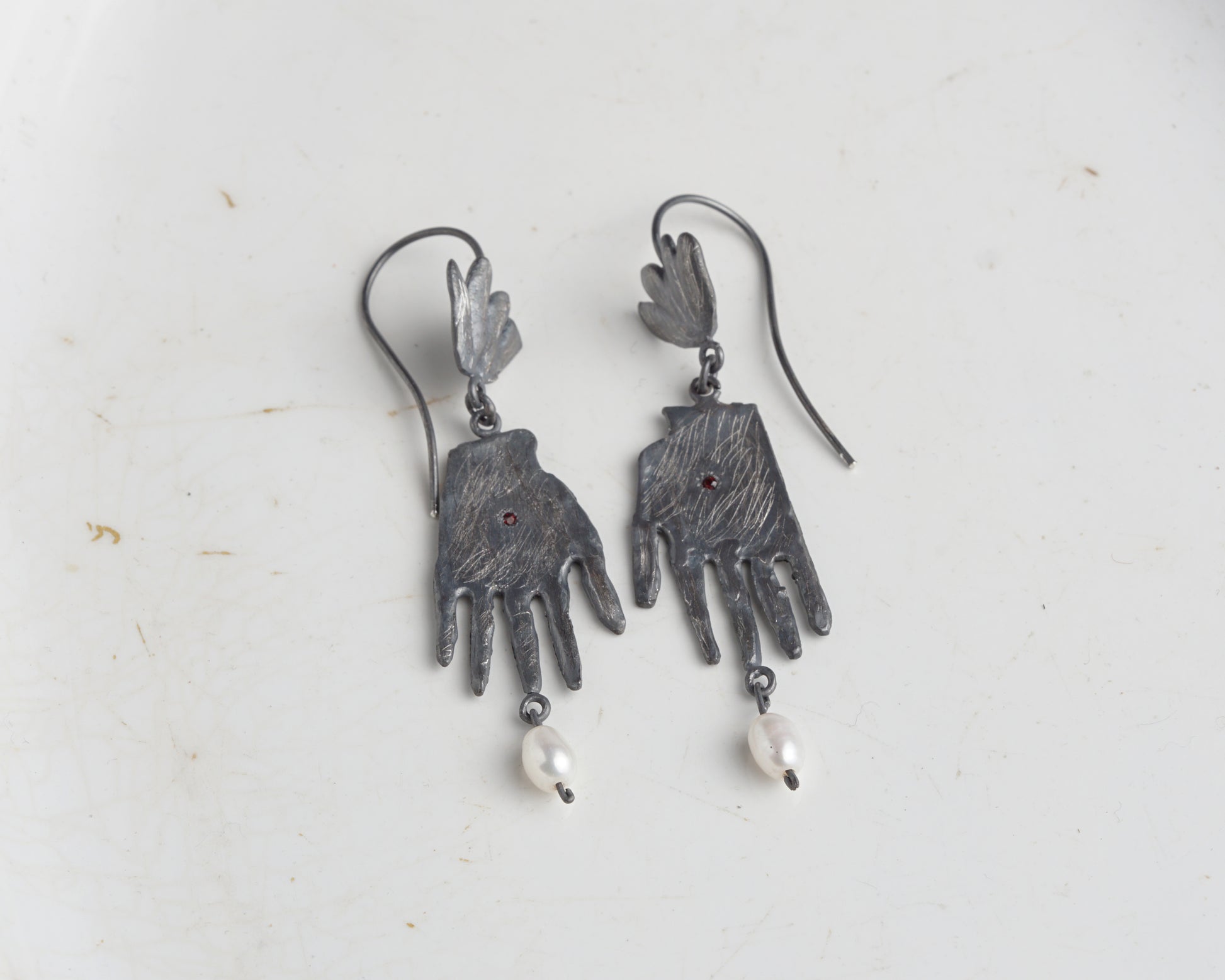 Handcrafted earrings in the shape of stylized hands. Each hand has a small ruby at its center and a freshwater pearl drop at the bottom. Made in a single copy.