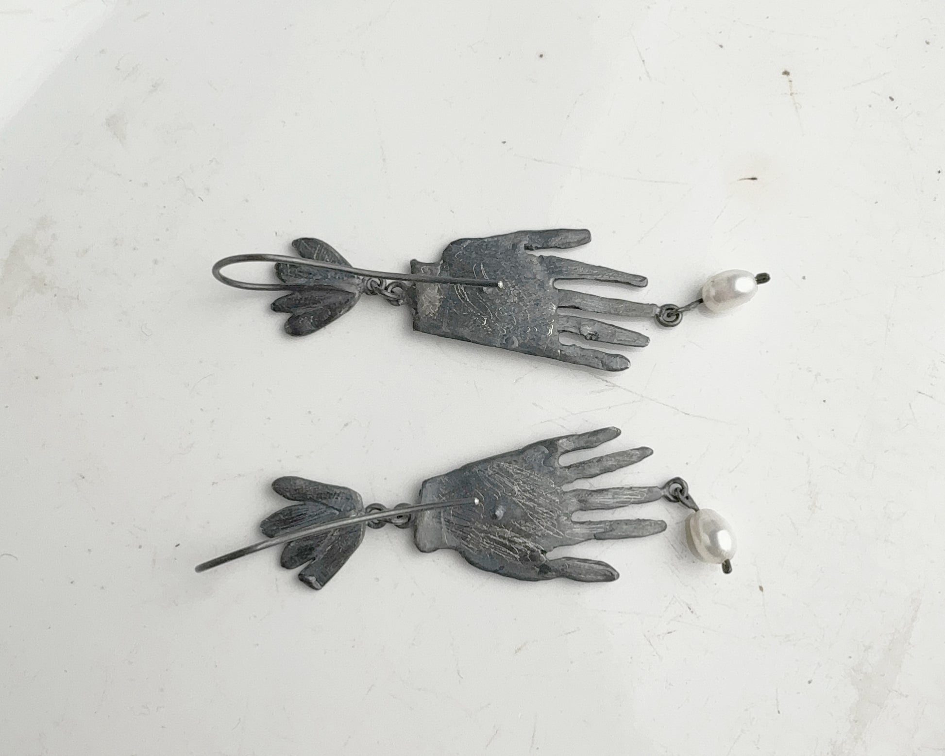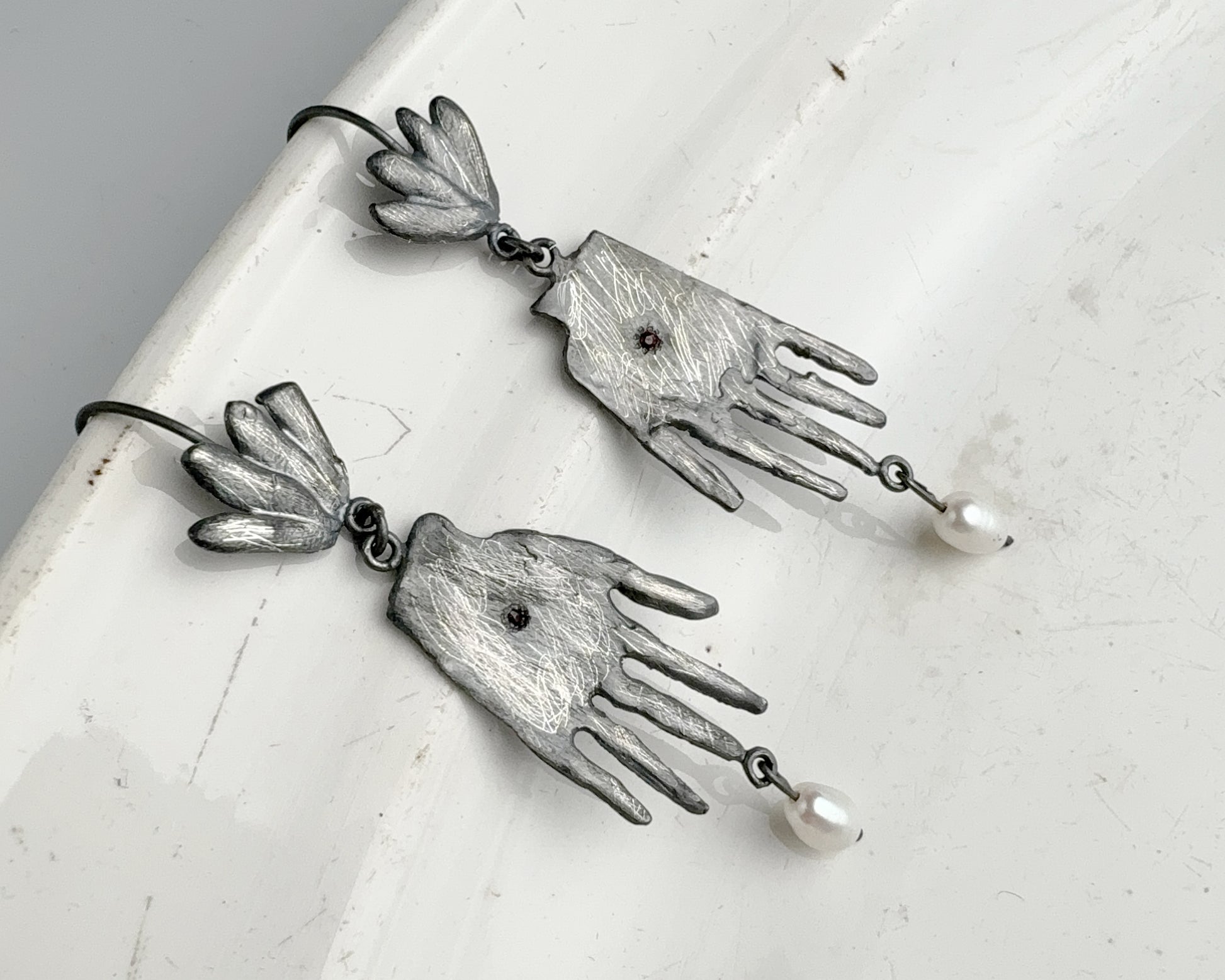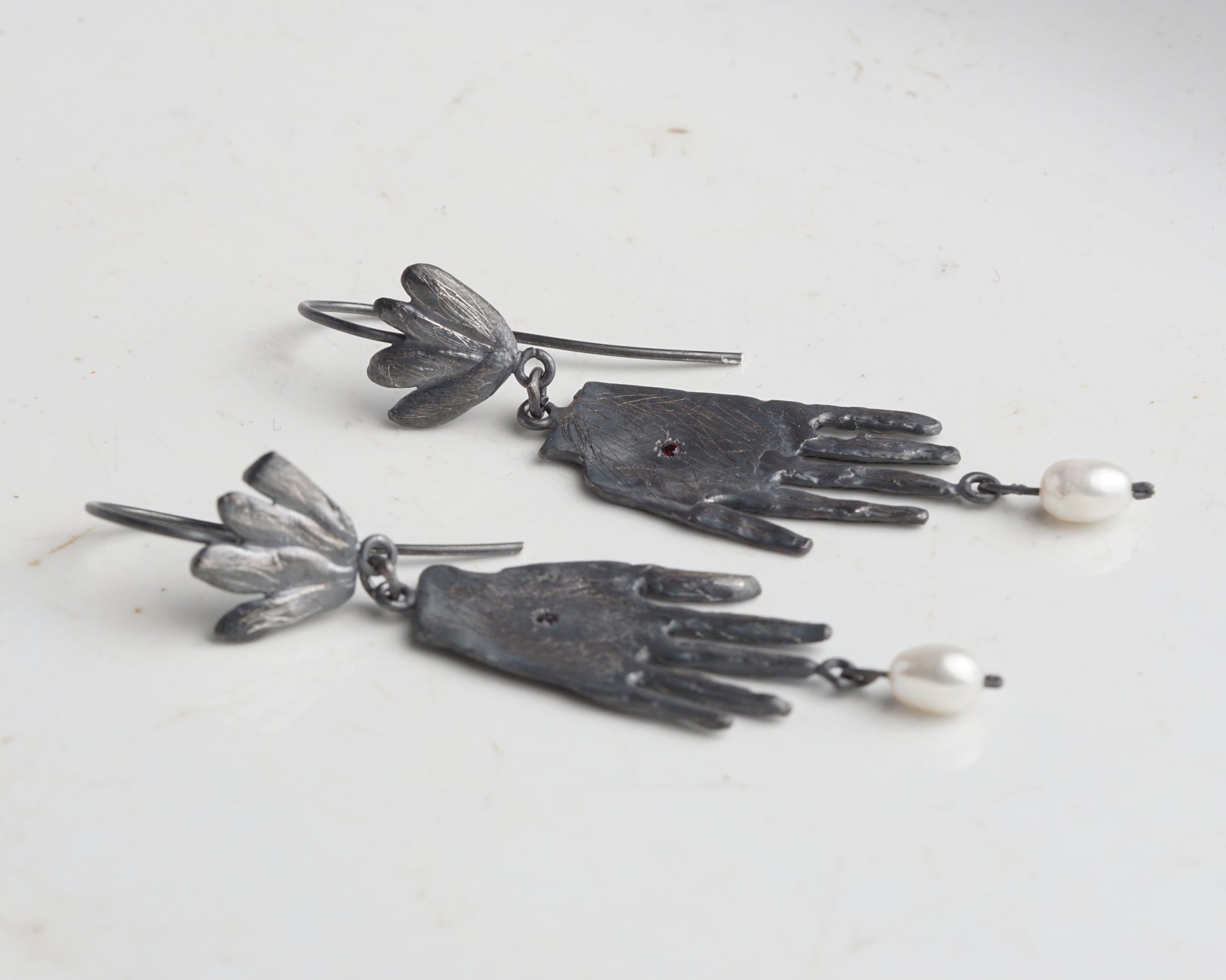 Handcrafted earrings in the shape of stylized hands. Each hand has a small ruby at its center and a freshwater pearl drop at the bottom. Made in a single copy.