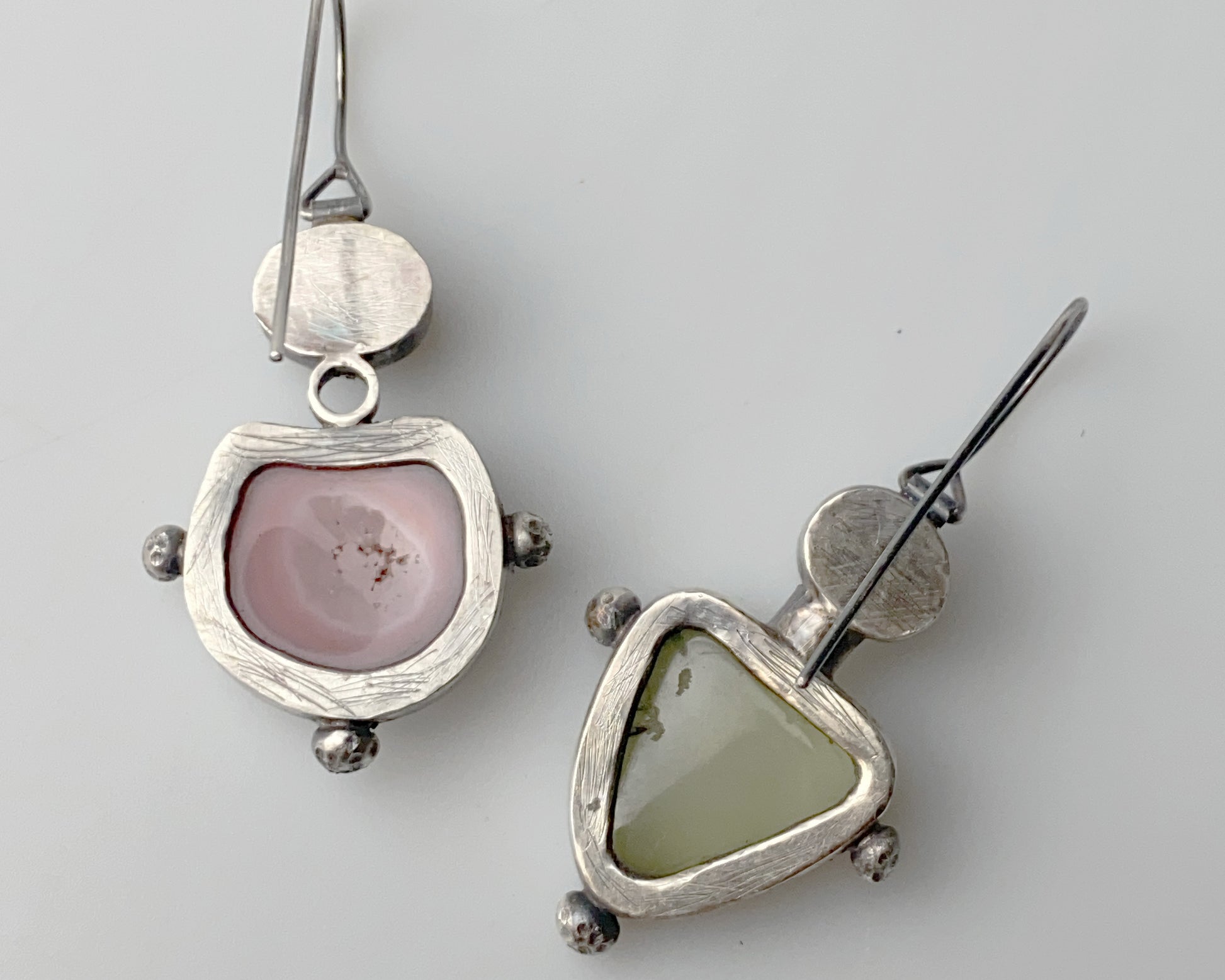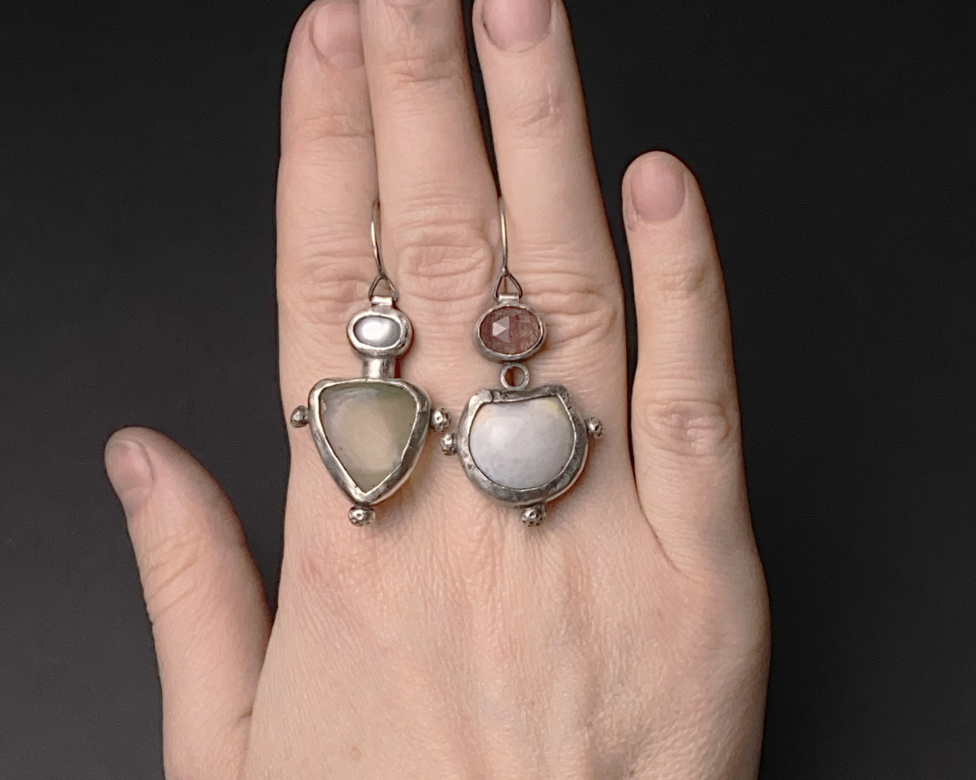 Handcrafted silver earrings featuring a mix of strawberry quartz, pearl, and prehnite. Each earring offers a unique combination of stones with artisanal silver detailing, creating an elegant asymmetrical pair that balances artistry with wearable style.