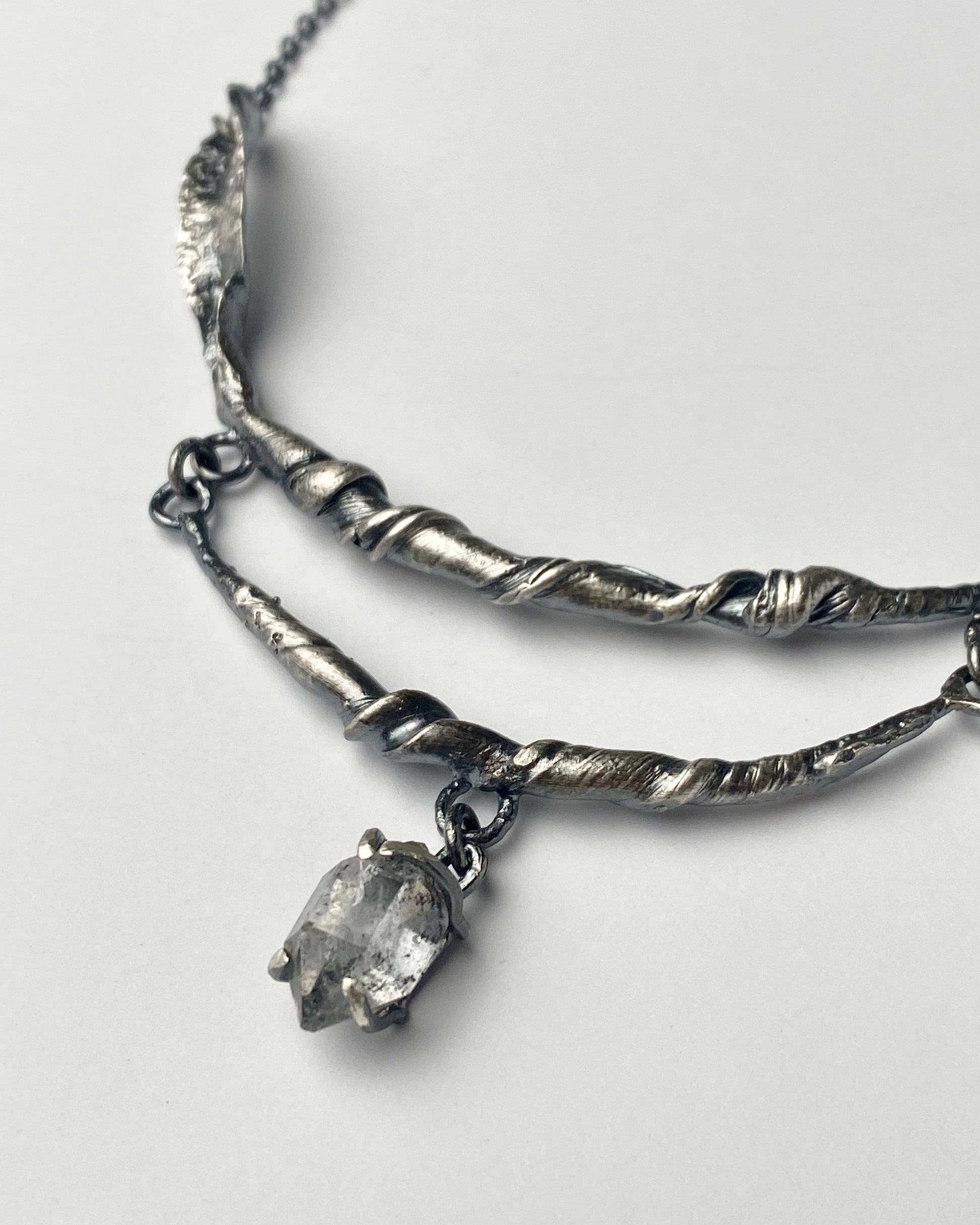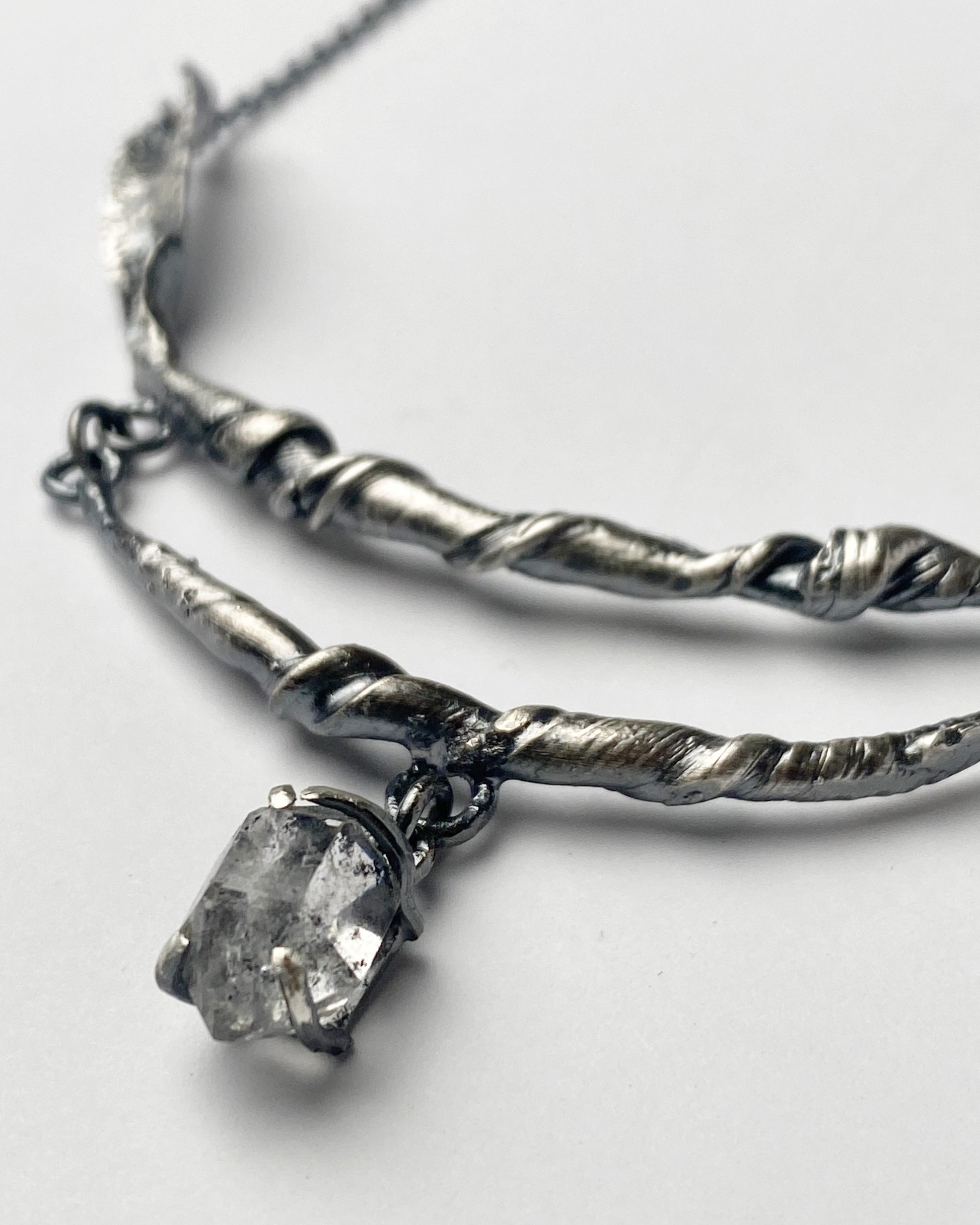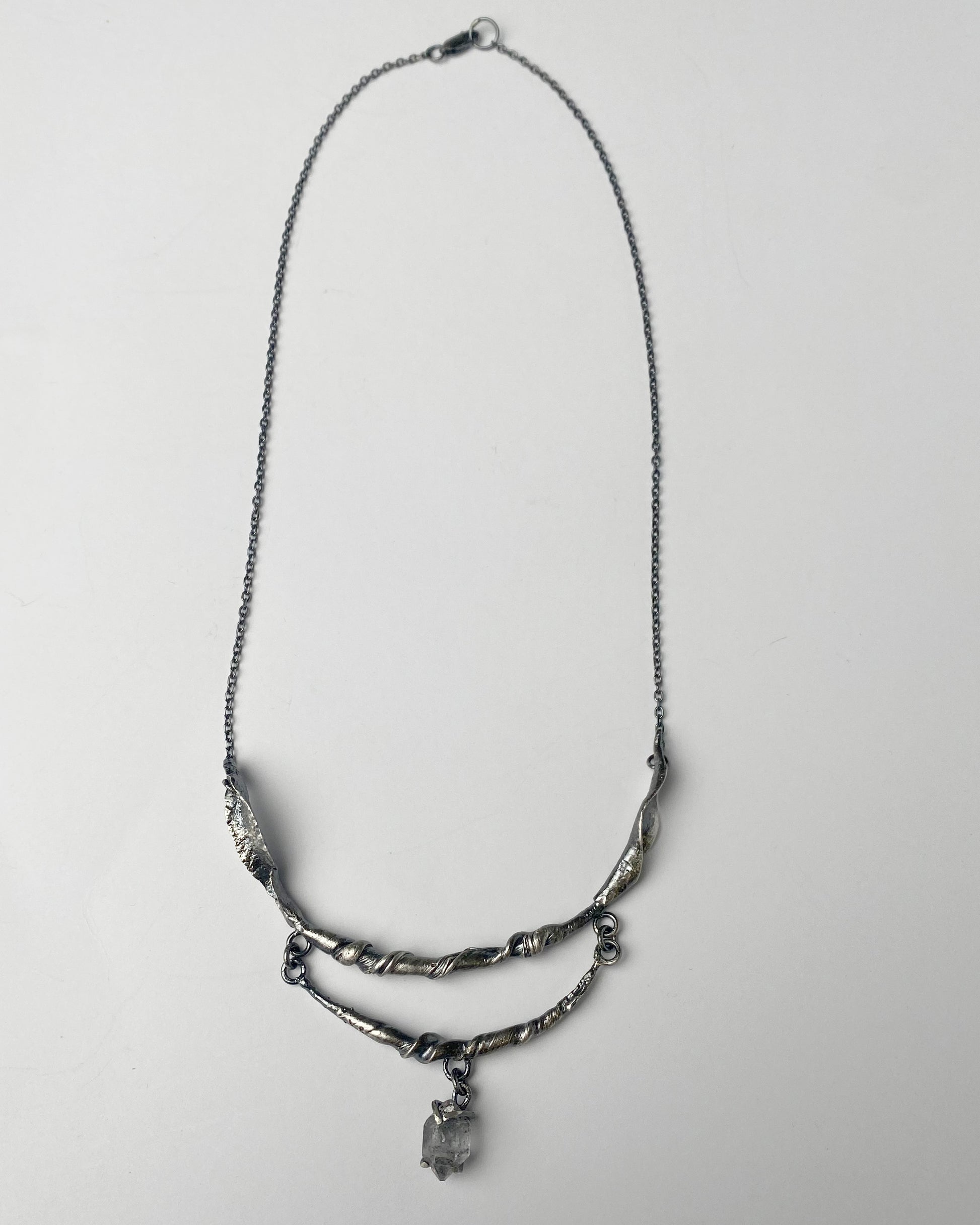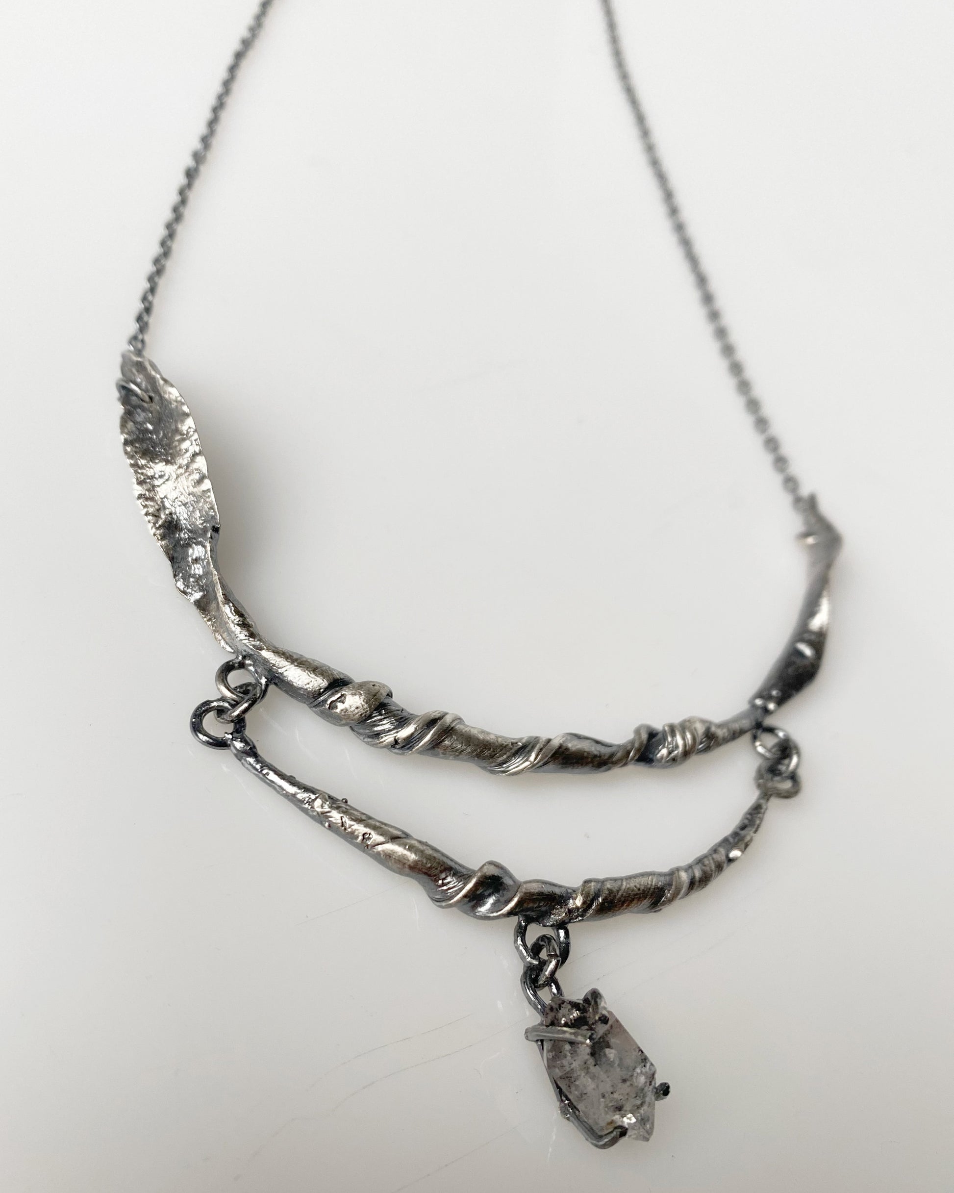 This handcrafted silver necklace features a raw Herkimer diamond pendant suspended between two organically twisted bars, creating a distinctive botanical-inspired design. The oxidized silver finish highlights the intricate texture of the handworked metal.