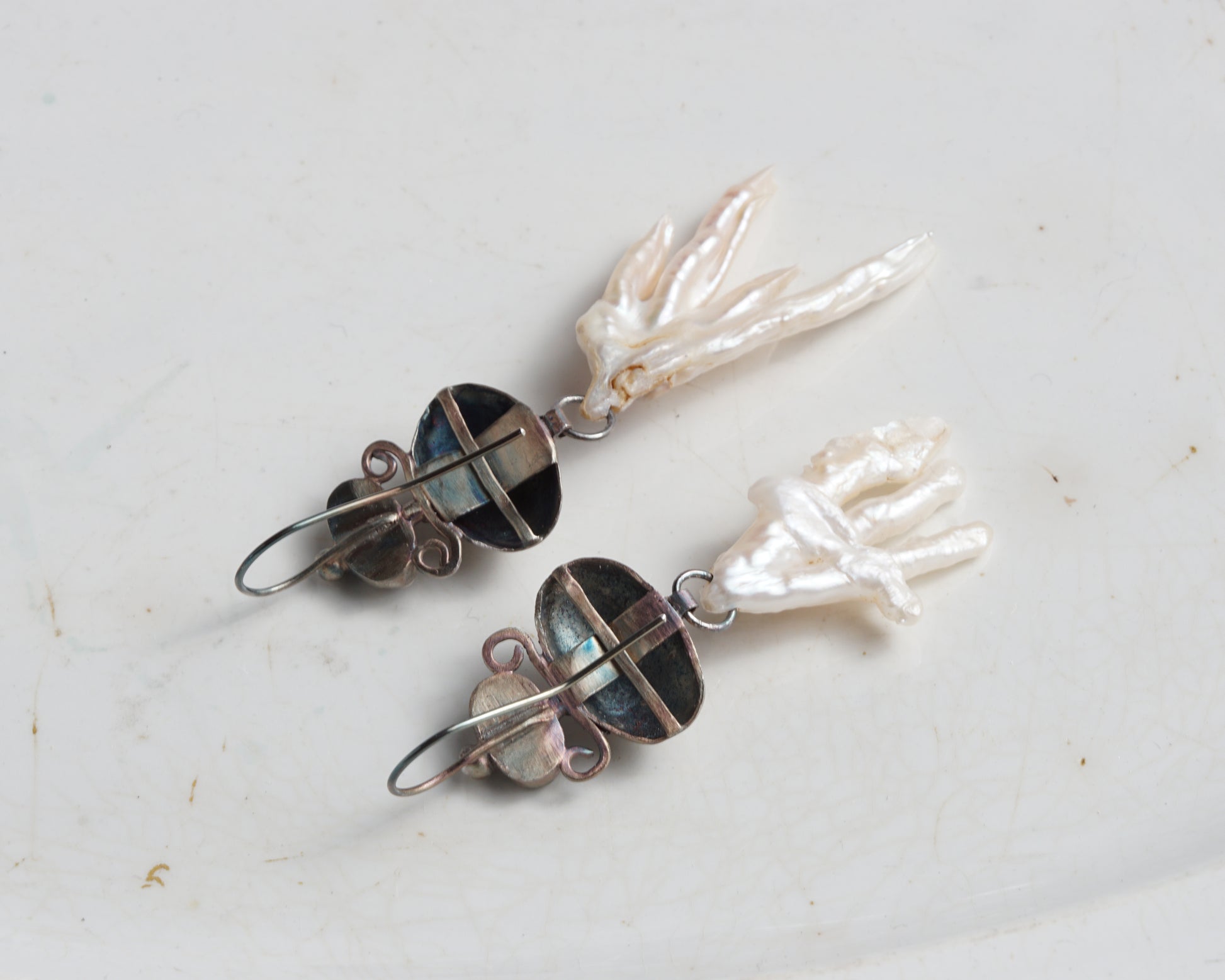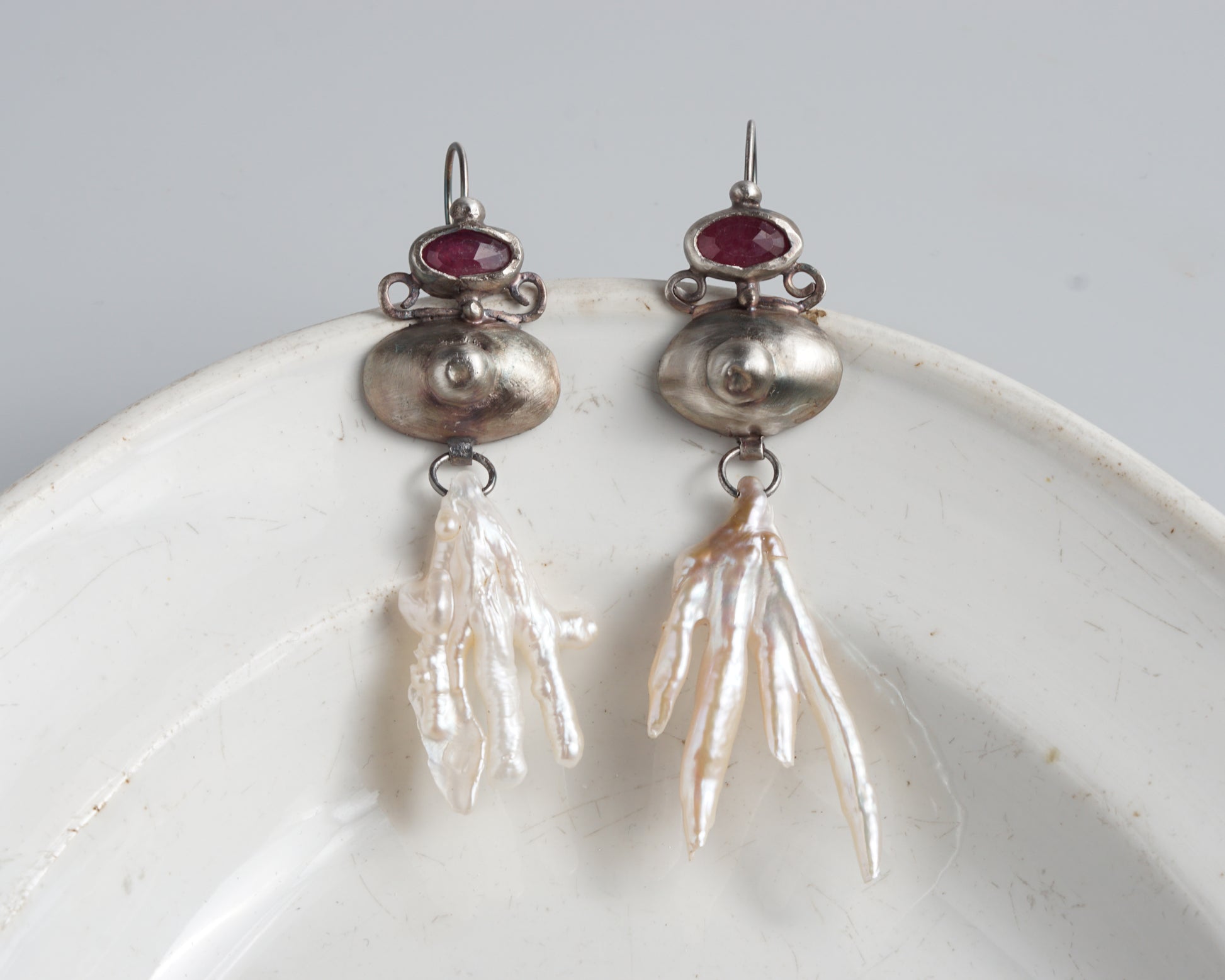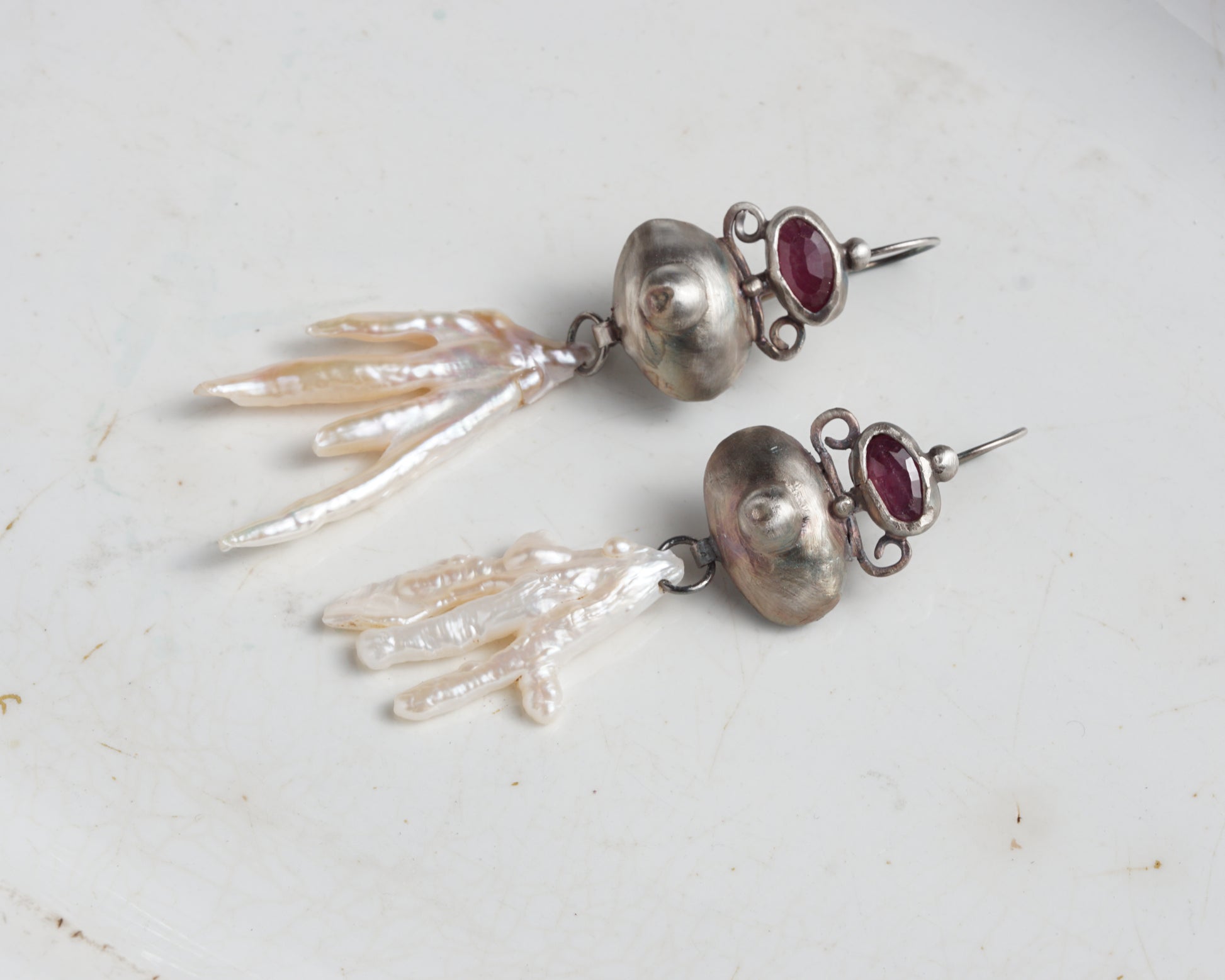 Earrings with pink sapphires, forged details, and whimsically shaped baroque pearl pendants.